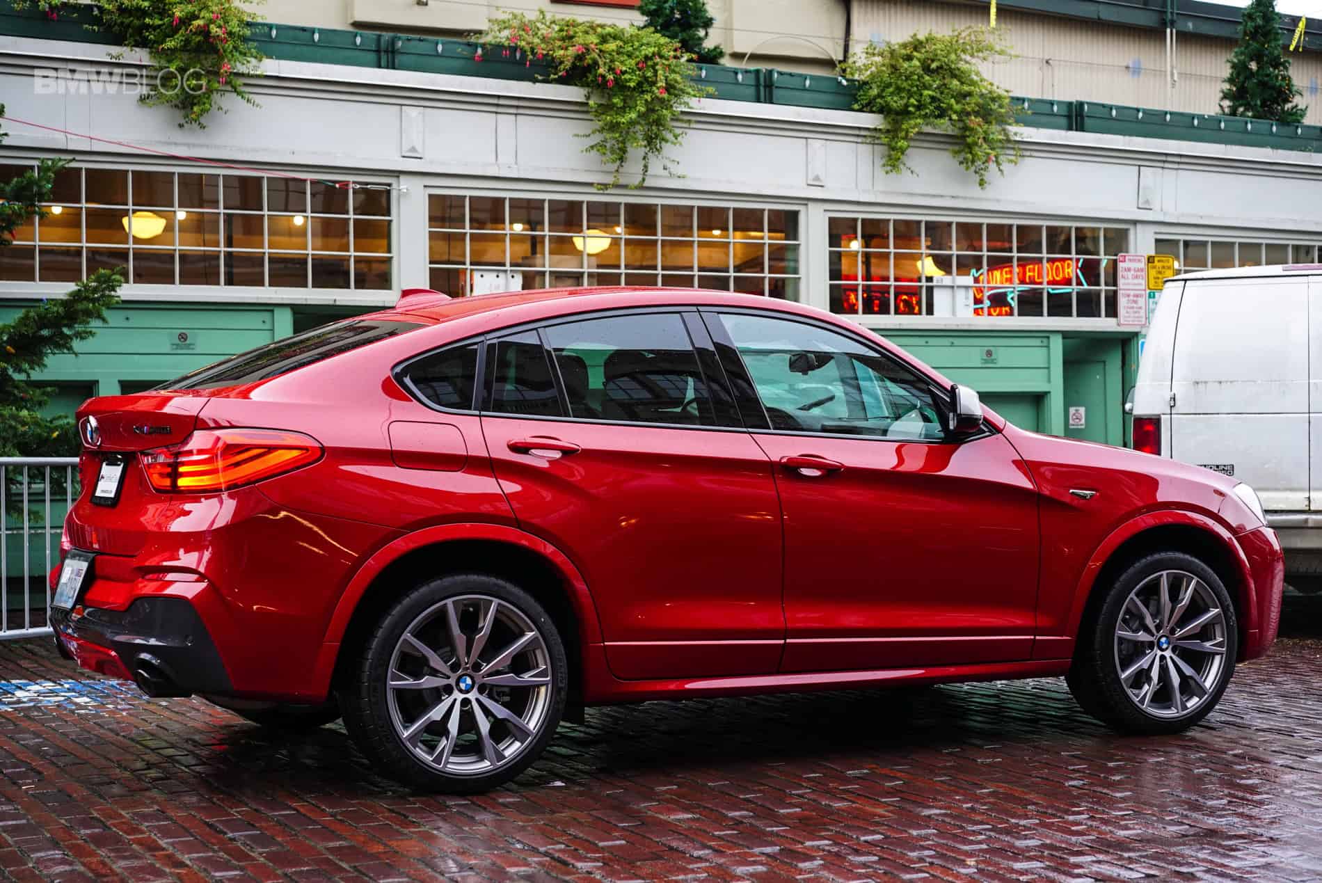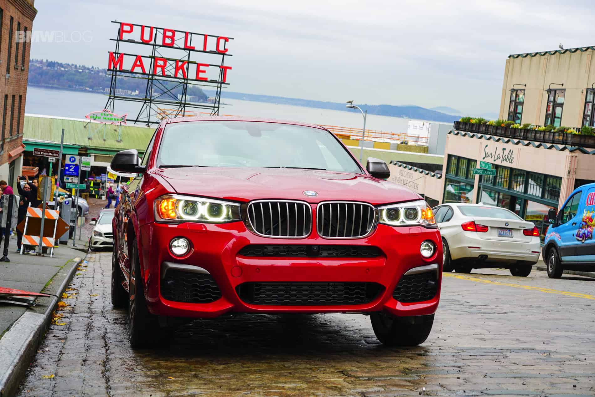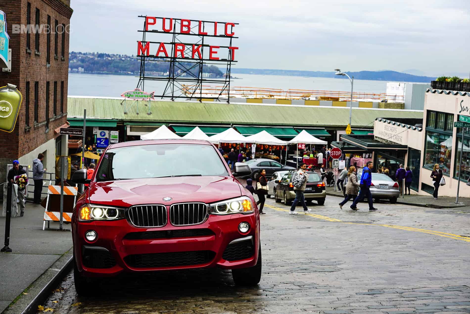 Pulling into the famous Pike Place Market, the narrow street lined with delivery vehicles and produce awaited us. Tons of people walking about looking at fruits and flowers and fish. As we’re trying to snap some photos of the X4 amongst the people, a gentleman walks up from the crowd and gives the car a good look. Because it’s a loaner from BMW Seattle it still has the price and option sheet affixed on the rear left passenger window. He gives it a quick read, looks at the X4 once again and nods “it’s pretty, and that red, you can see it from a mile away.” He’s right. Even among the beautifully decorated Christmas trees that can be found throughout Seattle in front of various businesses this time of year, this Melbourne red X4 M40i stands out and catches your eye. Just like that one year when you were 12-years old and you noticed a glowing gift under your Christmas tree that had your name on it. You wanted to open it but you were told you’d have to wait. Except this present is looking you straight in the face and is asking you to drive it hard. Not on Christmas Eve, but right now.