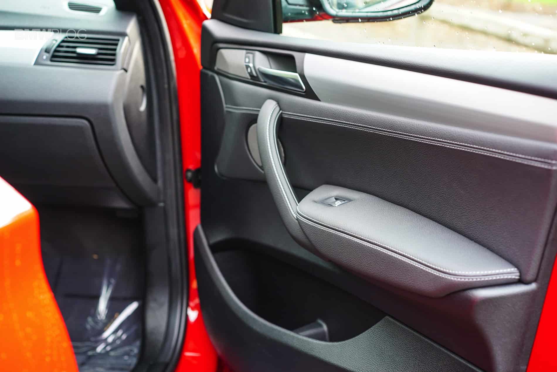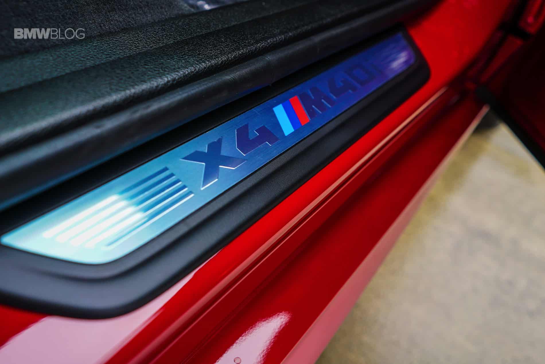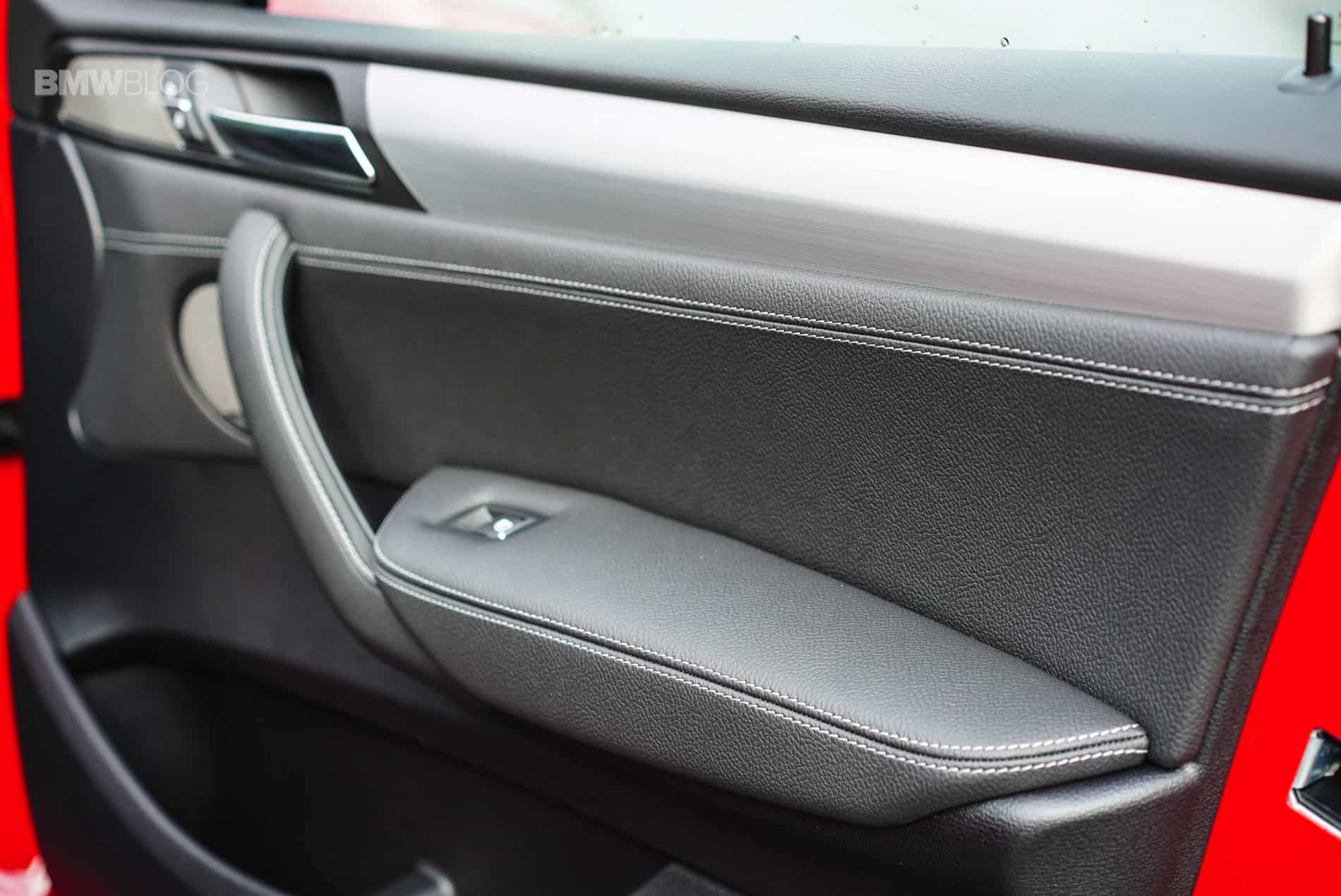 Under the hood we find a 3.0 liter BMW M Performance TwinPower Turbo inline 6-cylinder engine. Horsepower and torque figures are 355/343 respectively. On tap you have an 8-speed automatic transmission with paddle shifters that transfers power to all 4 wheels but is mostly rear-biased thanks to BMWs intelligent xDrive system. All in all it weighs in at 4,250 lbs. and what this all means is that it will propel you from 0 – 60 mph in 4.7 seconds. Being that this is the X4 M, the exterior styling is more aggressive thanks to the aerodynamic kit as well as the shadowline exterior trim and black chrome tailpipes which are connected to a sport exhaust system. On this particular vehicle the Melbourne red paint also does a good job of screaming “I’m fast” and the optional 20 inch M wheels give it a nice purposeful stance.