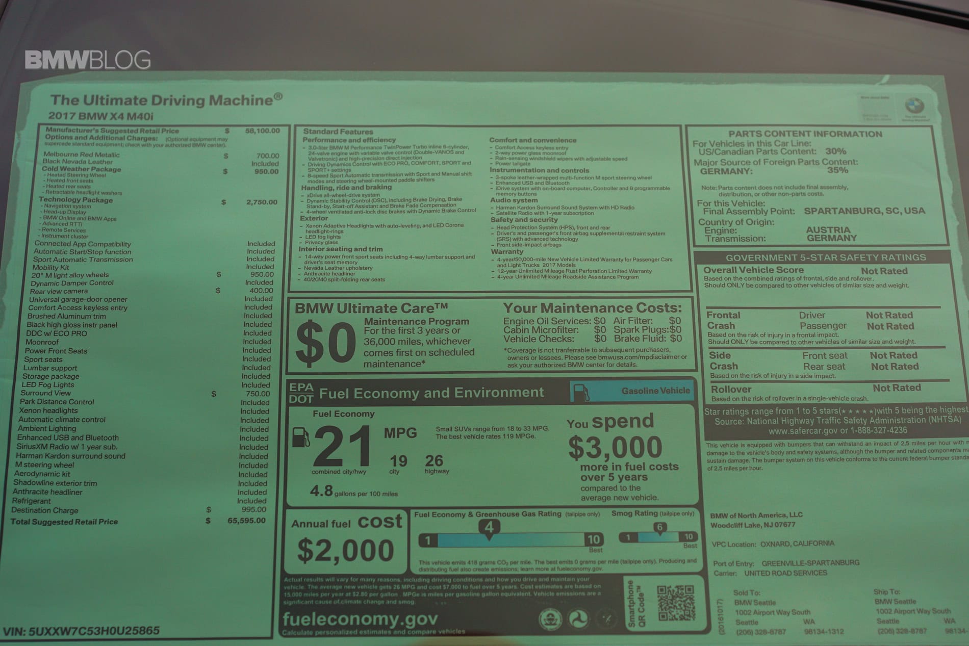 What does the competition look like? Good question. First let’s break down the costs. Your base X4 M40i starts at $58,100 plus $995.00 Destination Charge. This particular model had a few extras which are broken down below: