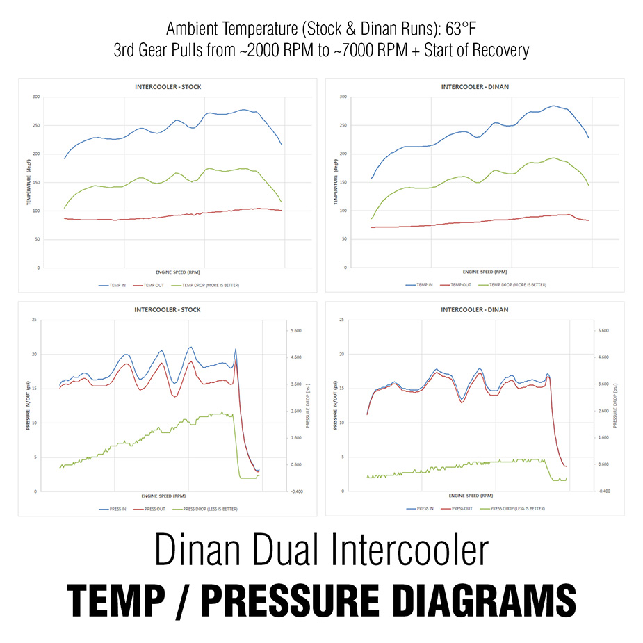 Description: With a bigger turbo and more boost to elicit greater power gains heat becomes larger issue. More heat in turn robs some of the power you just gained. A larger high performance intercooler combats the heat and those power gains are protected. The Dinan dual core intercooler provides a 278% increase in face area along with an equally impressive increase in volume, substantially reducing the pressure drop to 0.8 psi, as well as providing for more efficient heat exchange and more consistent output power. Dinan’s unique dual core design allows 2 separate cores to be working in conjunction with one another at all times. This doubling of resources is directly responsible for a 39% improvement in the delta from charge air temperature to ambient temperature (See diagrams below). “Cool down” time is also significantly reduced, enabling the cars to produce full power under varying driving conditions such as stop and go traffic. This leaves the chances of being susceptible to heat soak nearly a thing of the past.