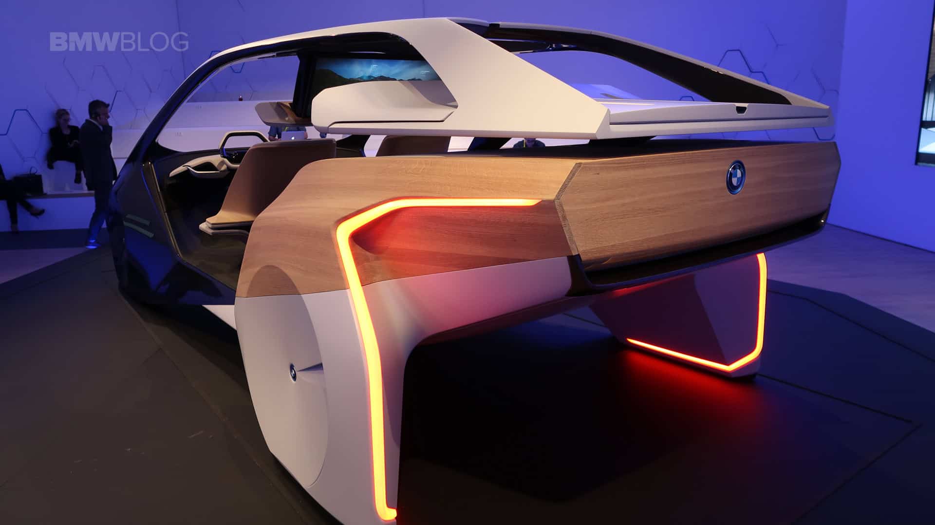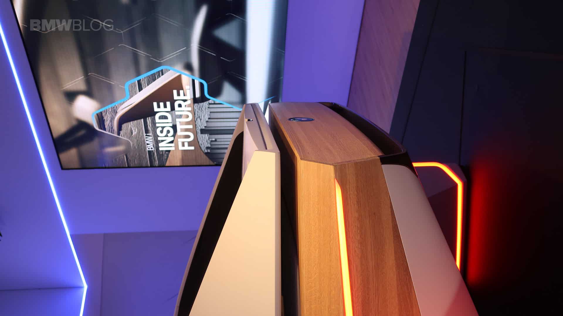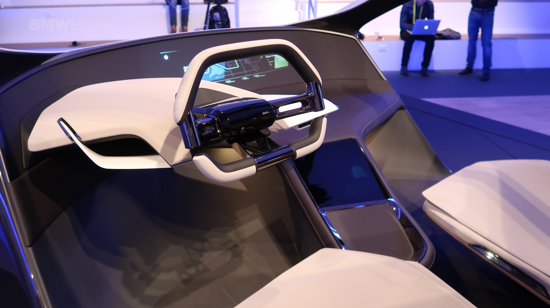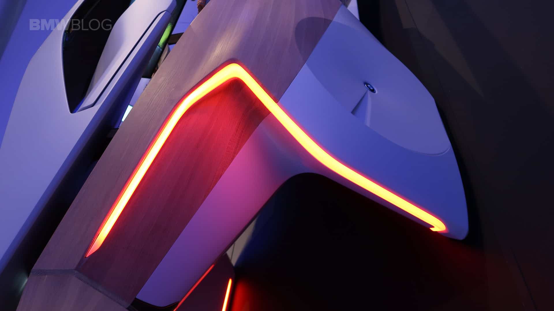 The front seats are large fixed-back wood and leather chairs that look like they belong in a home as opposed to a car. The steering wheel is made from milled aluminum, painted black and wrapped with leather and seemingly suspended in air. There is an expansive smooth front black dash well away from the driver. Gone is the dedicated iPad style screen seen in current BMW as the whole concept car’s dash is able to be used as a display or just a small part of the dash can be used. It was fascinating to see just a small 35 mph display by itself or a fully immersive video of BMW Films on the black dash.