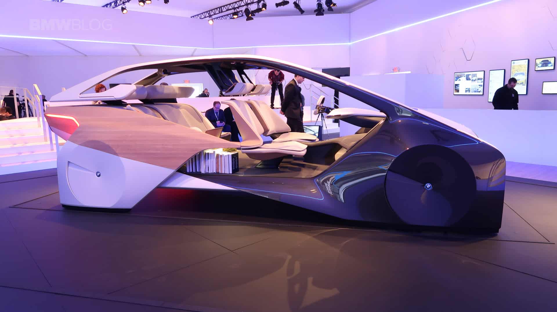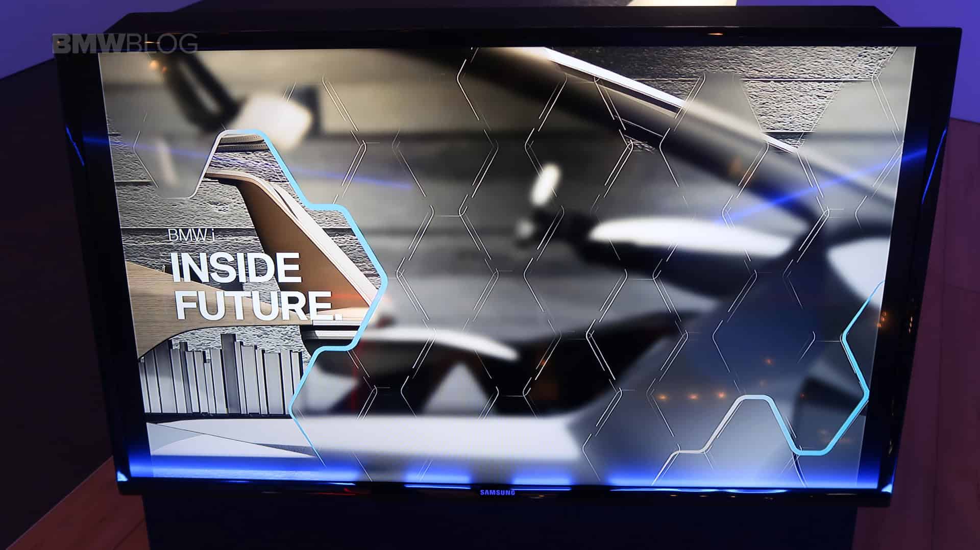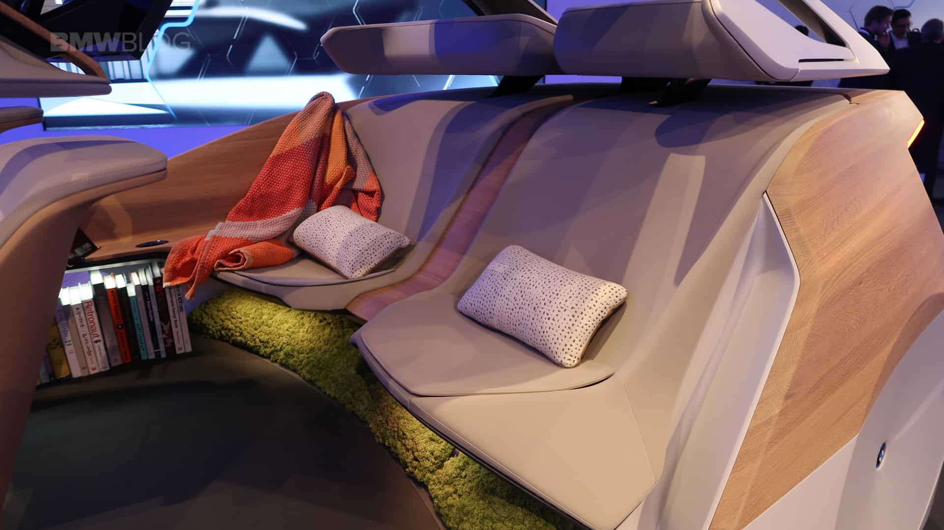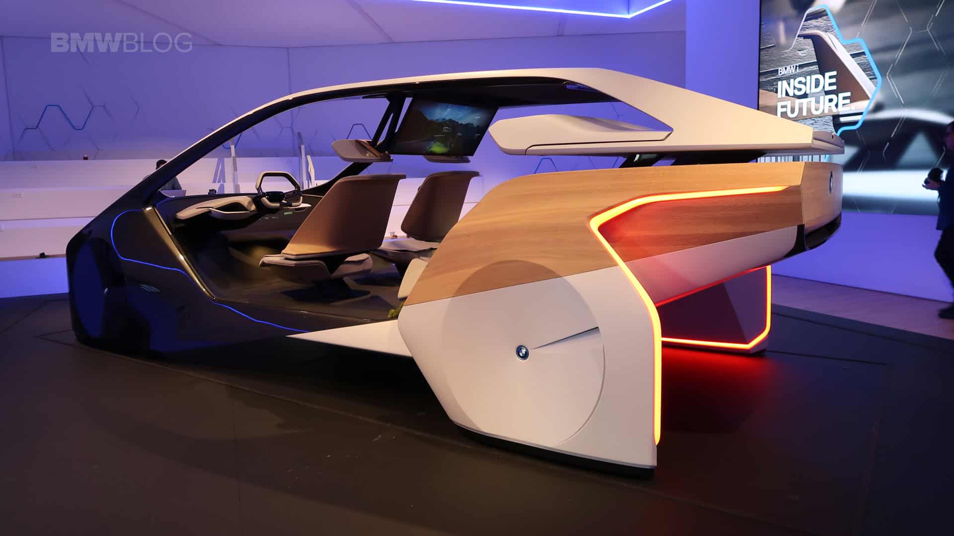 The front seats are large fixed-back wood and leather chairs that look like they belong in a home as opposed to a car. The steering wheel is made from milled aluminum, painted black and wrapped with leather and seemingly suspended in air. There is an expansive smooth front black dash well away from the driver. Gone is the dedicated iPad style screen seen in current BMW as the whole concept car’s dash is able to be used as a display or just a small part of the dash can be used. It was fascinating to see just a small 35 mph display by itself or a fully immersive video of BMW Films on the black dash.