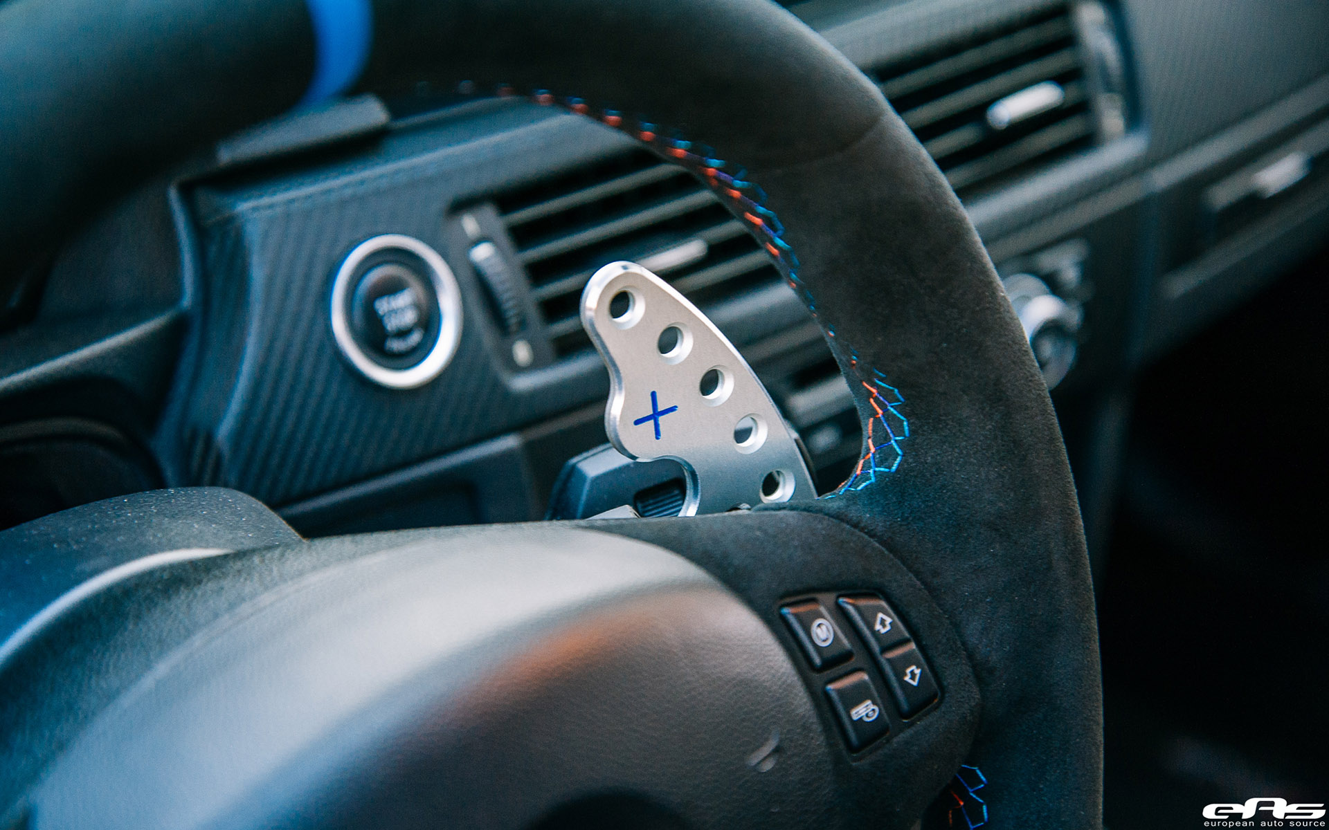 Additionally, the owner added some interesting touches to the interior. The BMW M Performance steering wheel – complete with a blue stripe – adorns the interior. While this is not a huge upgrade, it does allow more grip in tight racing conditions. Furthermore, the Pedal Haus aluminum extended DCT shifter paddles allow the owner to keep both hands on the wheel, allowing for better control of the racing line. Finally, the Pedal Haus aluminum pedal set graces the interior, further giving it a race-themed look.