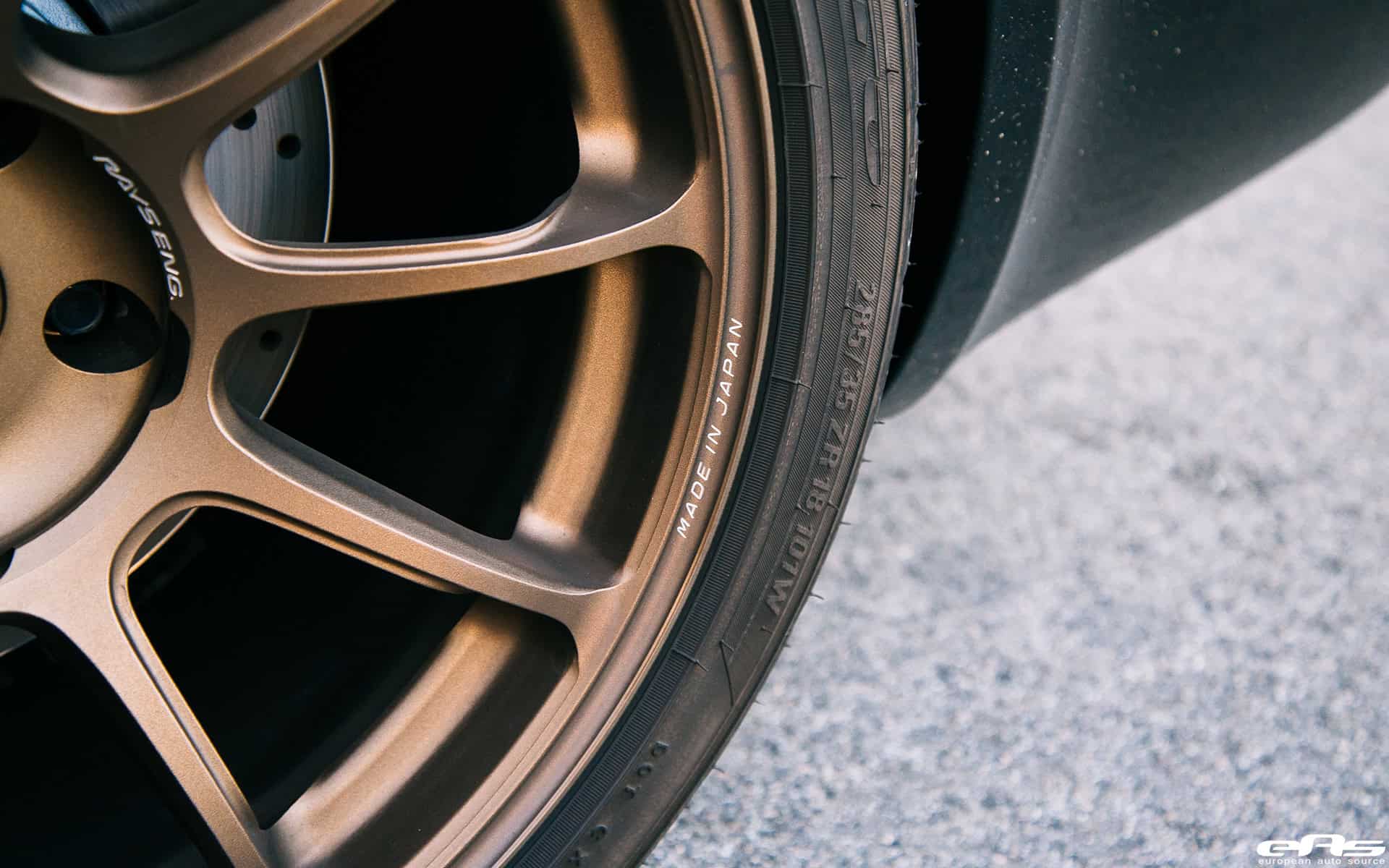 The first and most visible modification to the M3 are the beautiful bronze Volk Racing ZE40 wheels. The wheels come in sizes of 19×8.5 in the front and 19×9.5 in the rear. The multispoke wheel solution, specially because of its bronze finish, fits together with the black exterior rather perfectly. The vehicle is also further lowered, yielding a flush fitment. For the most part, this also helps to cool off the brakes more efficiently, preventing earlier brake fade and allowing for improved braking performance as well.