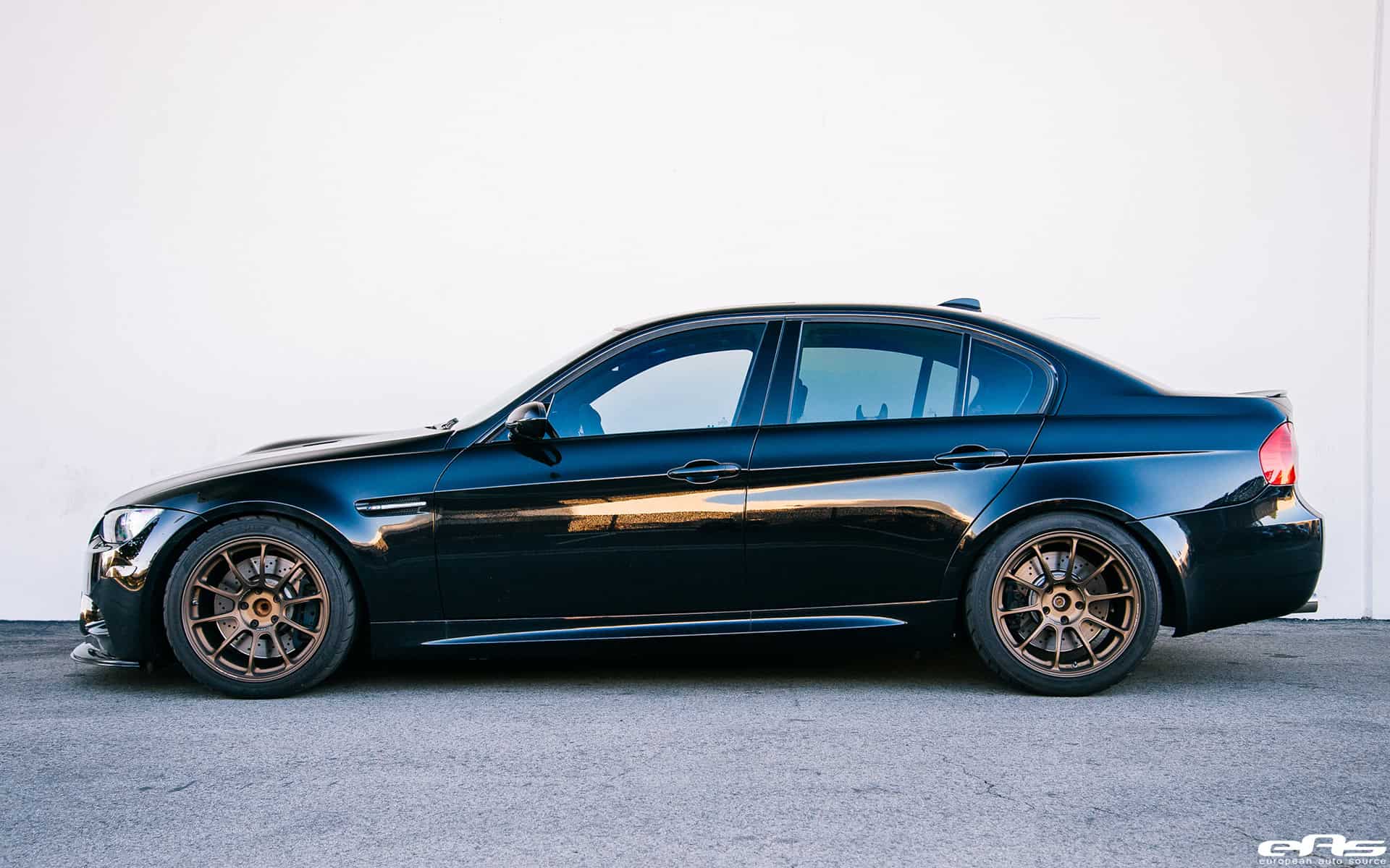 The first and most visible modification to the M3 are the beautiful bronze Volk Racing ZE40 wheels. The wheels come in sizes of 19×8.5 in the front and 19×9.5 in the rear. The multispoke wheel solution, specially because of its bronze finish, fits together with the black exterior rather perfectly. The vehicle is also further lowered, yielding a flush fitment. For the most part, this also helps to cool off the brakes more efficiently, preventing earlier brake fade and allowing for improved braking performance as well.