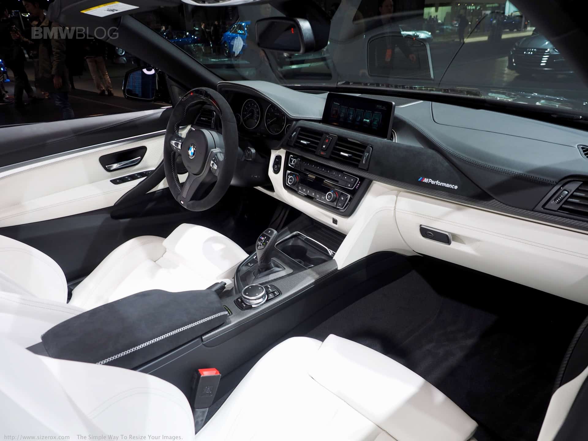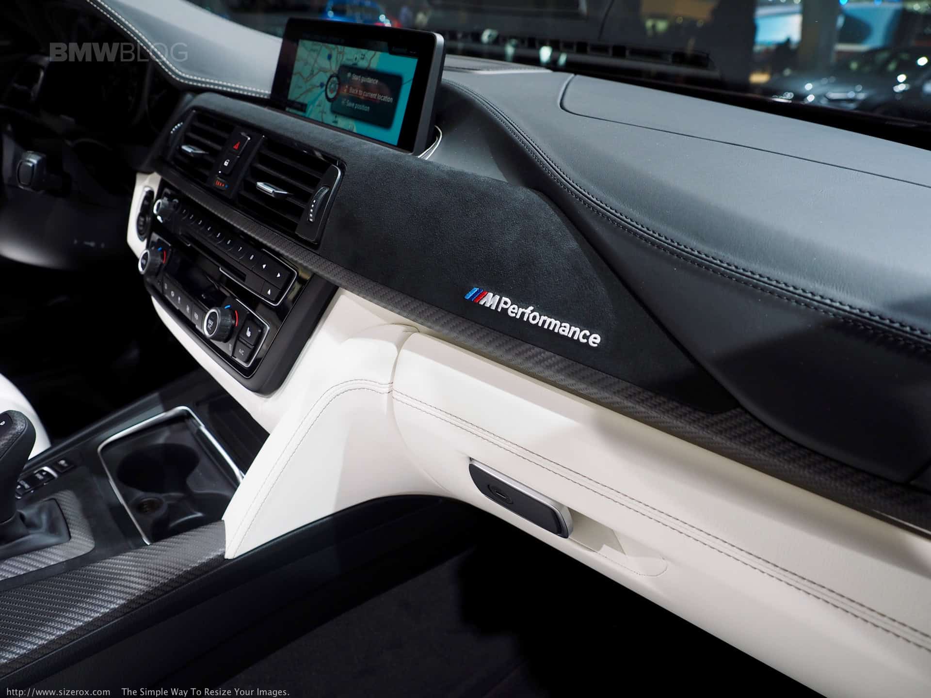 Inside, BMW proudly presents their M Performance Steering Wheel with a digital display and shifting indicators. For the first time, we were able to see live the new center console, “dressed” in alcantara and surrounded by carbon fiber. Things like a carbon fiber DCT shifter and aluminum pedals with the ///M branding are also present.