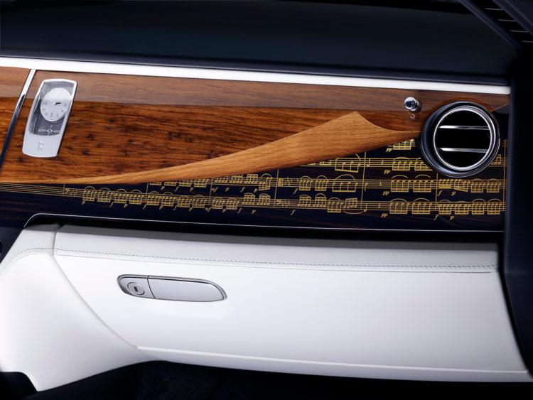 This Ghost features a monochromatic exterior design, embellished with a striking coachline that incorporates the clef-like motif. The motif is echoed throughout the cabin, adorned on the clock, laid into the wood and stitched into the headrests. A particularly elegant Bespoke feature is the Barrel Oak veneer dashboard panel, with a ‘folded back’ design that reveals Dark Ebony woodwork beneath, inscribed using the art of marquetry with the exact musical notation from the patrons favourite piece.
