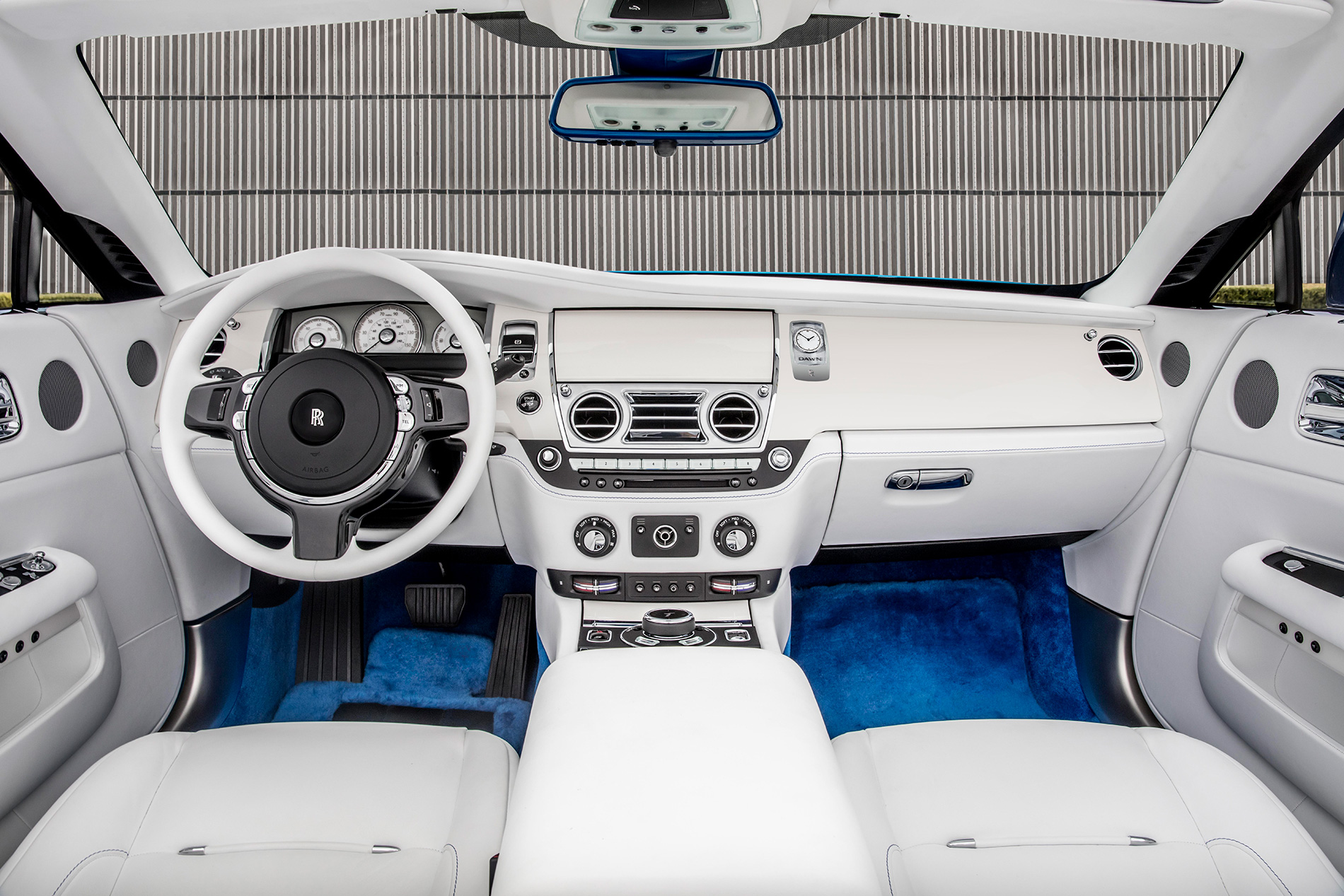 US collector Michael Fux, a connoisseur collector, delights in challenging Rolls-Royce’s designers and craftspeople to develop truly unique materials, hues and features. The results, serve as some of the boldest and most emblematic examples of Bespoke design ever executed at the marque’s centre of excellence in Goodwood. When Mr Fux came to commission his first Dawn for handover at Pebble Beach, he came to develop his very own colour, dubbed ‘Fux Blue’, which will remain reserved for his exclusive use. The stunning exterior shade is complemented by a blue hood in the same tone, in contrast to the Arctic White rear deck and fittings to the interior. In order to ensure perfect sartorial harmony, the marque’s designers clothed the entire interior including steering wheel, instrument panel cowling and interior veneers in Artic White, creating a truly unique and contemporary aesthetic.