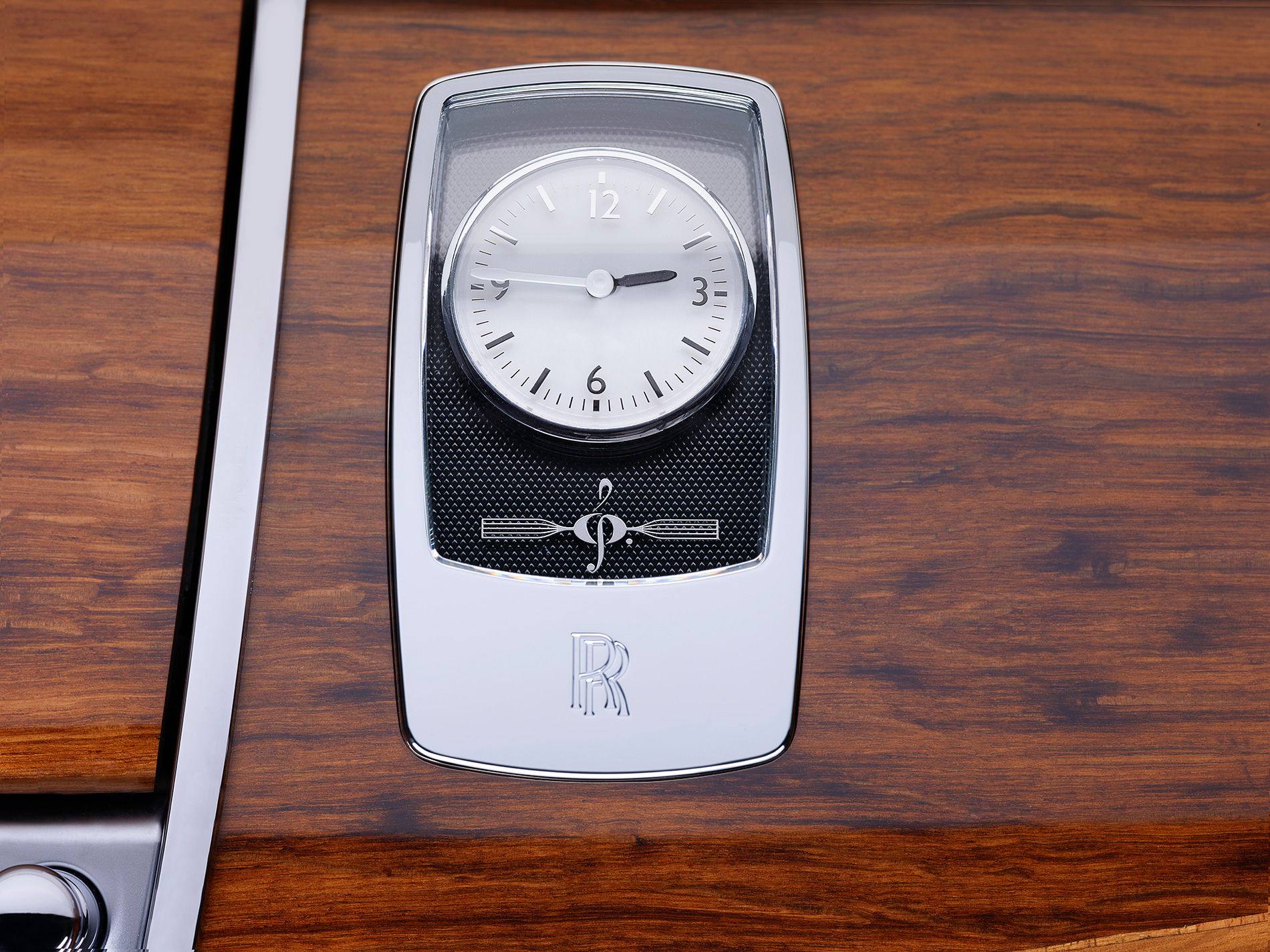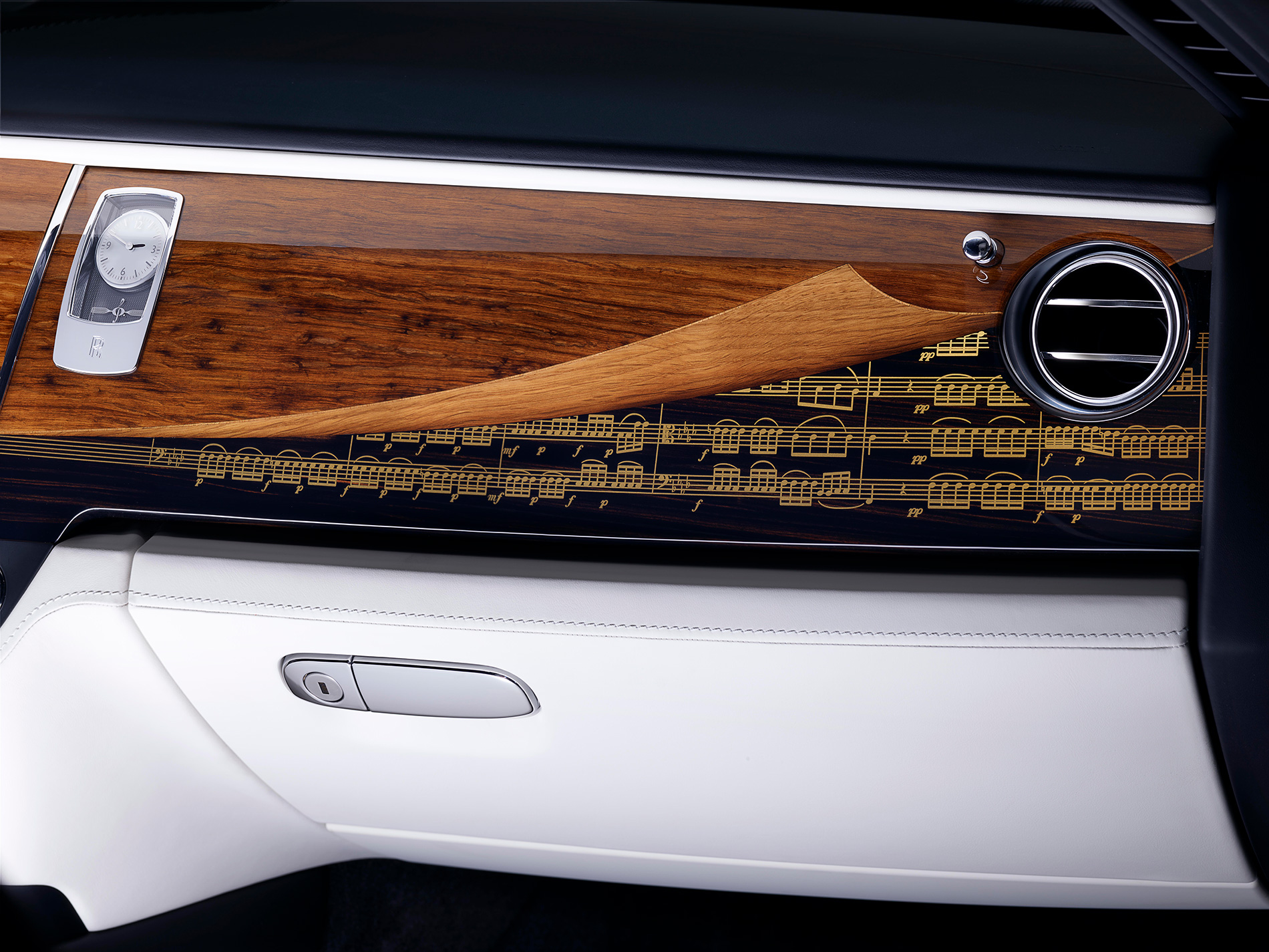 This Ghost features a monochromatic exterior design, embellished with a striking coachline that incorporates the clef-like motif. The motif is echoed throughout the cabin, adorned on the clock, laid into the wood and stitched into the headrests. A particularly elegant Bespoke feature is the Barrel Oak veneer dashboard panel, with a ‘folded back’ design that reveals Dark Ebony woodwork beneath, inscribed using the art of marquetry with the exact musical notation from the patrons favourite piece.