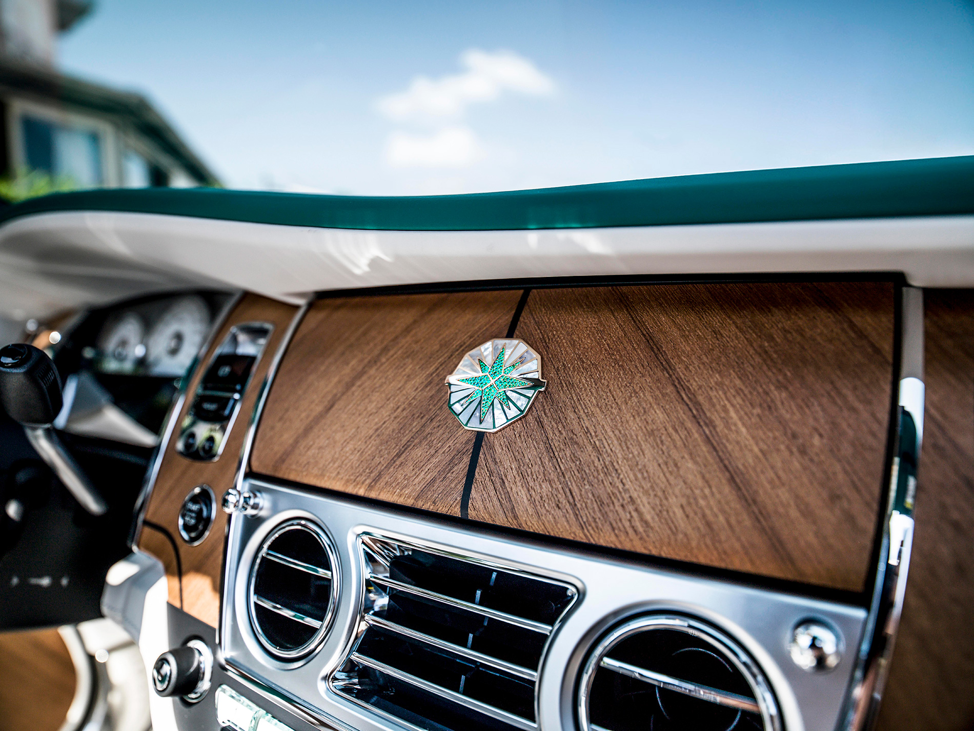 Cultural emblems and stories so often inform the vision of the marque’s patrons, as beautifully displayed in this commission by a gentleman in Taiwan. This elegant Phantom Drophead Coupé was one of the very last built and incorporates a number of Bespoke features of regional significance. The exterior is finished in Silverlake with an Andalusian White bonnet and an engraved Spirit of Ecstasy in gold. Hints of gold are also incorporated in the Bespoke twin coachlines and the pinstripes circling the wheel centres. The headrests are embroidered with an illustration of the blue magpie, a bird which can only be found in the owners’ homeland of Taiwan, while Mother of Pearl inlays sit within the veneers, instrument dials, clock and control knobs. Attention to detail even extends to the car’s boot floor, which is is uniquely finished in teak with white maple inserts.