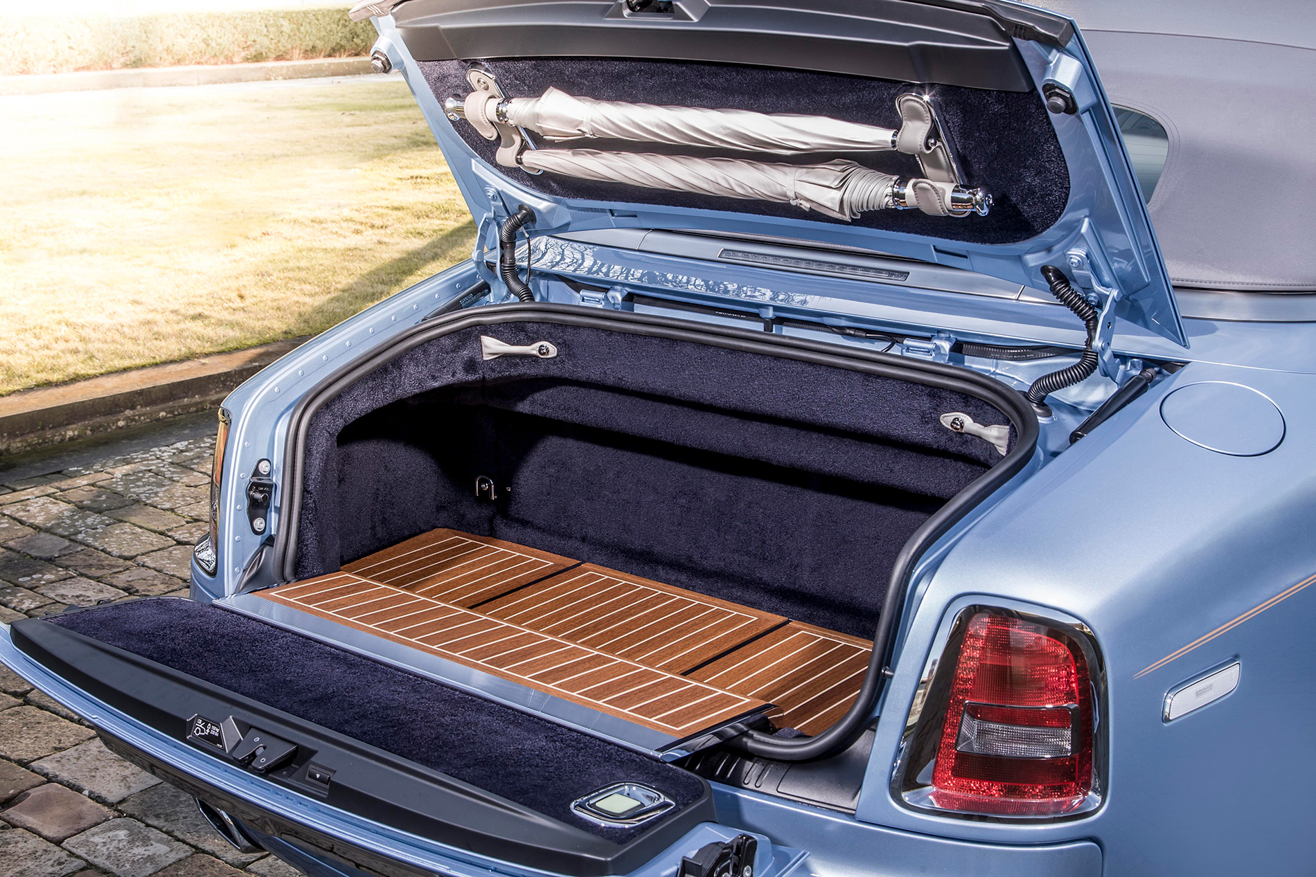 Rolls-Royce style, every possible comfort was considered. For example, enhancements to the rear-split tailgate included a meticulously engineered and crafted glass-shelf from which to serve champagne, whilst the luggage compartment proved the perfect staging point for a civilised rest-stop when touring. Flourishes like the addition of champagne fridge, large enough to hold two bottles and eight Rolls-Royce glasses served to demonstrate Rolls-Royce’s unique understanding of its patrons.