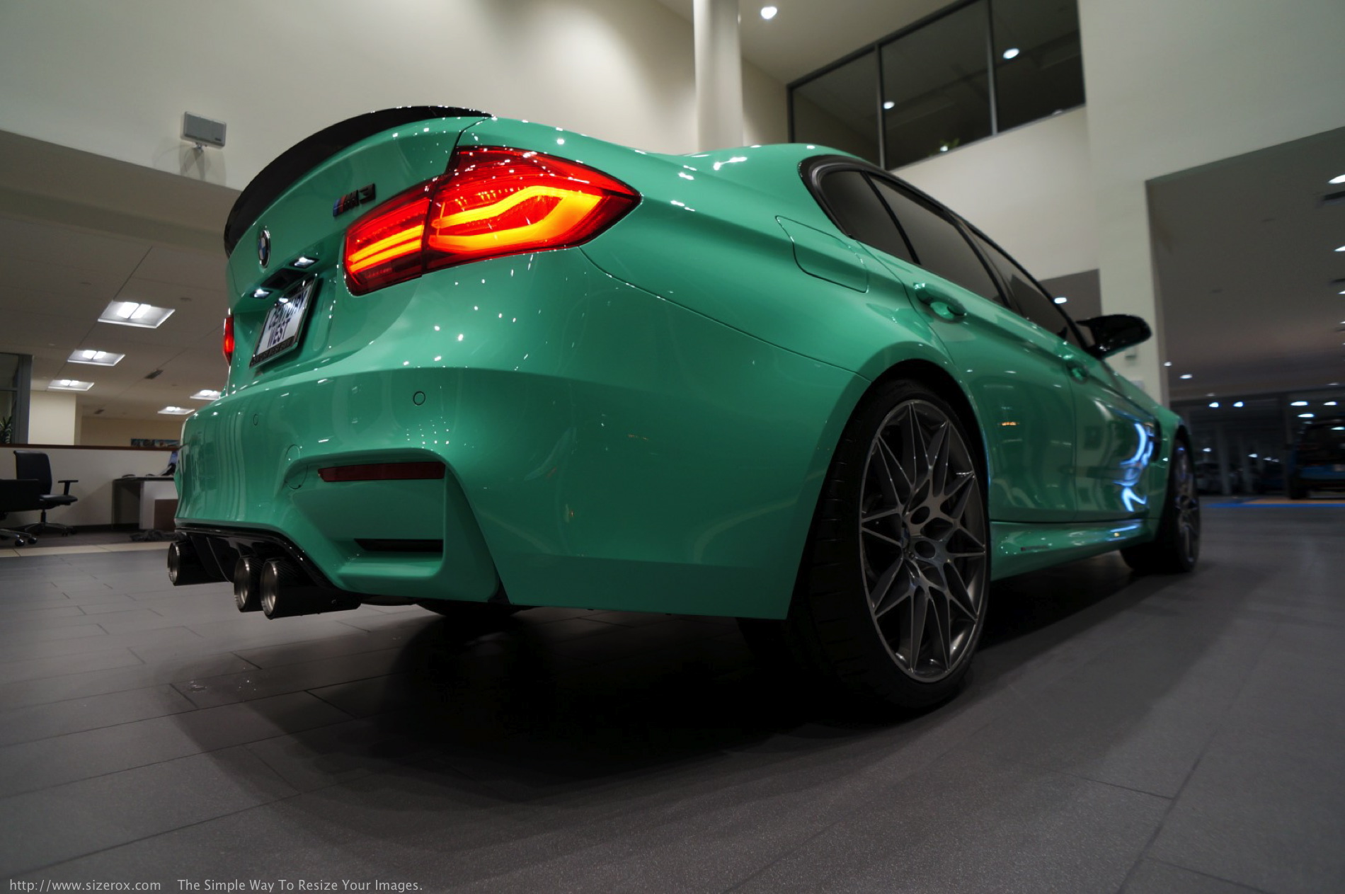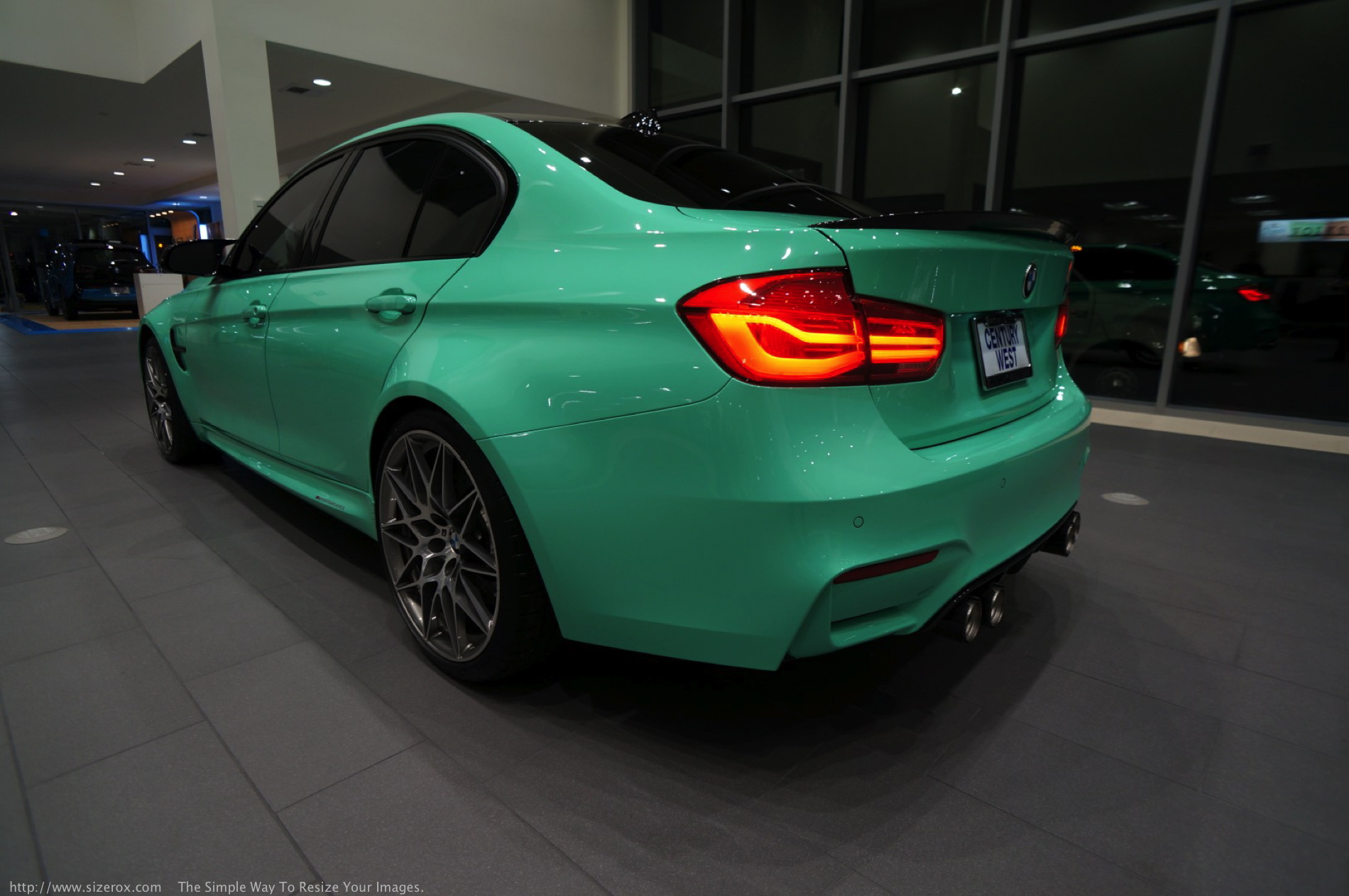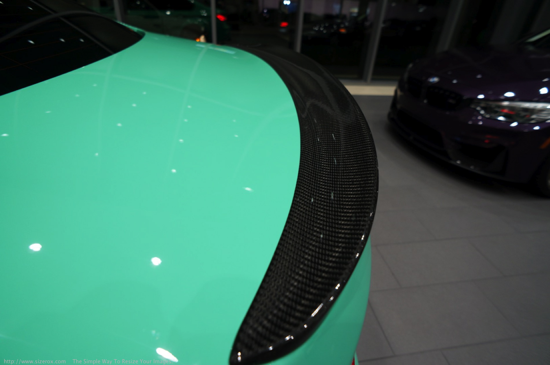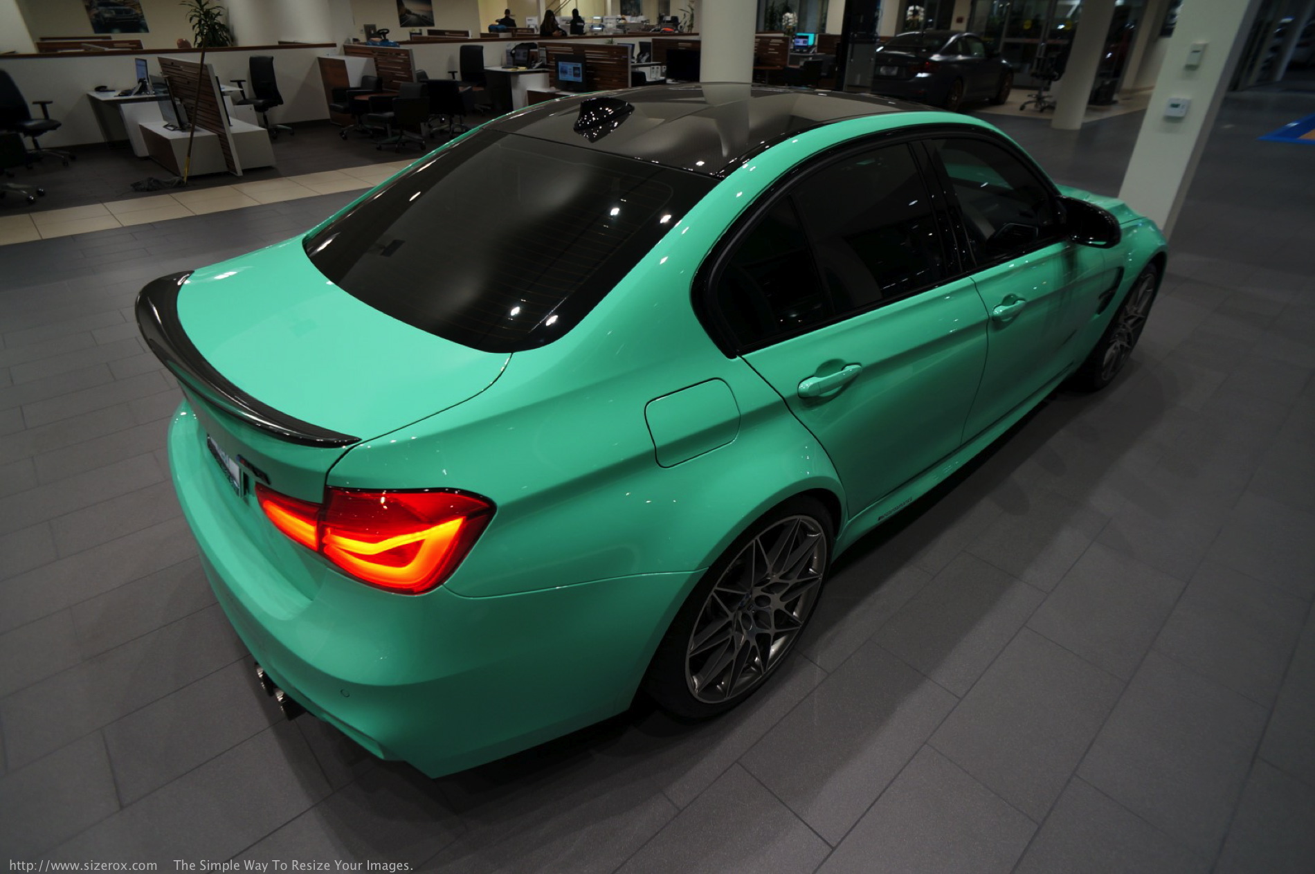 Marino threw everything that the BMW Performance Parts catalog had to offer, at this M3. Carbon Fiber Everywhere: front aero splitter, rear diffuser, rear trunk-lid spoiler, exhaust tips, mirror covers and interior trim. M-Performance exhaust, stainless pedals, Performance Analyzer (IOS & Android), LED door projectors—in short the proverbial “kitchen sink”. All of these performance goodies and individual paint sit on top of the factory Competition Package with the Style 666 20” wheels, M-DCT transmission, Executive Package, Drivers Assistance Package, Lighting Package, Apple Car-Play Compatibility and a plethora of other options and standard features.