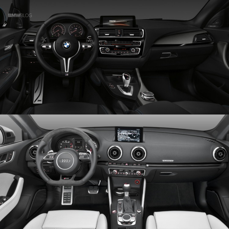 From the back, it’s also a difficult choice for me but for the opposite reason as the front. The rear of both cars seem a bit off to me and I’m not a big fan of either. The M2’s taillights are a bit frumpy looking and the RS3’s are too bland. Also, with the M2, with those vertical slats for the reflectors, it almost make it look like another car is coming out of the rear of it. However, the Audi RS3’s massive twin exhaust tips look a bit childish and are a bit too boy-racer for me. I’m gonna give the rear-end design to the M2 because it has quad exhaust and everyone loves quad exhaust.