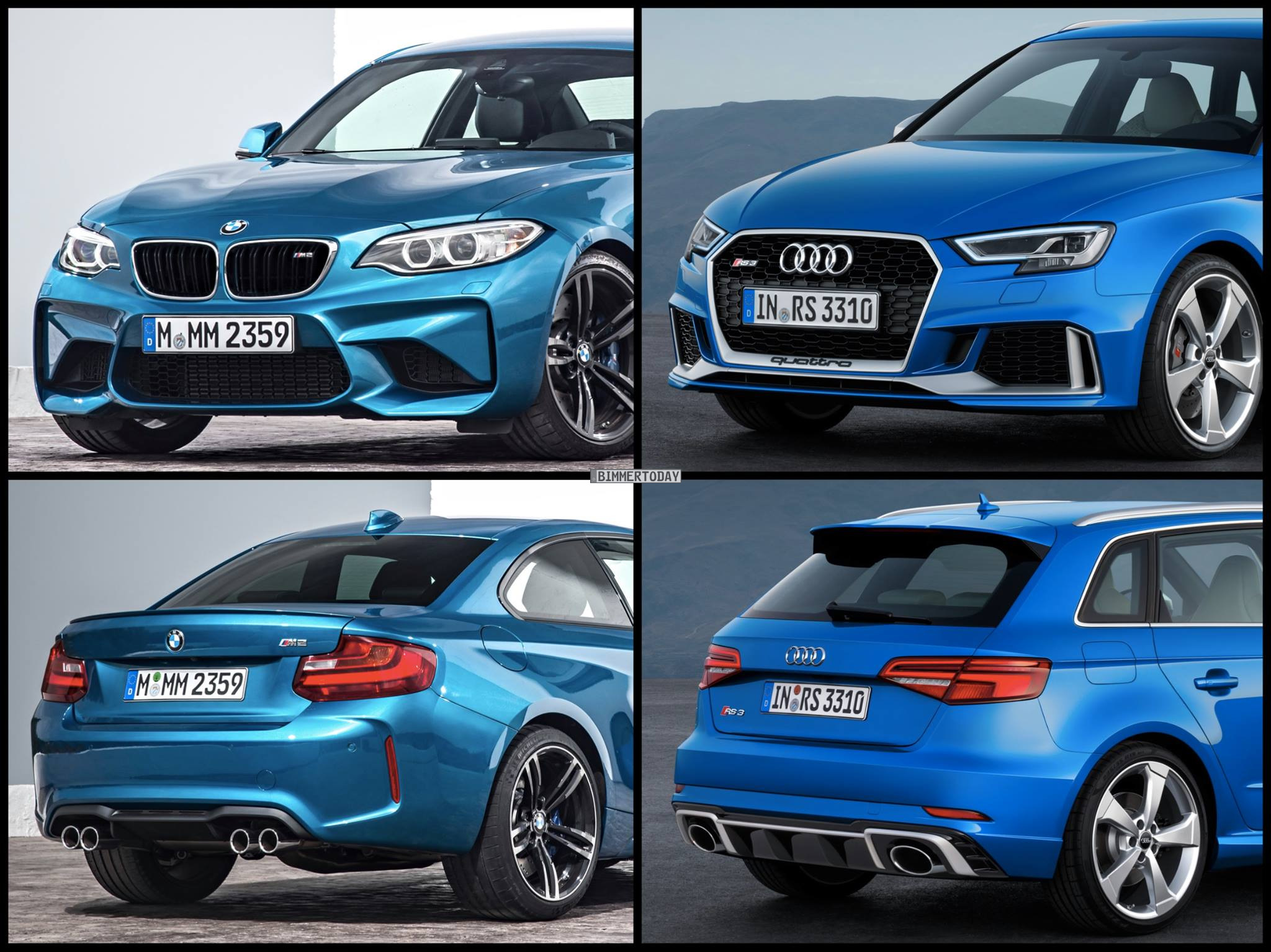 To be completely honest, I have a very hard time choosing between these two cars, in terms of looks. Both appeal to me, just in very different ways. The BMW M2 has an old-school, muscular coupe styling that reminds me of tire smoke and powersliding. While the Audi RS3 has a sort of techy-science look that’s really attractive to me. Both look angry and aggressive, but the M2 looks more muscular and the RS3 looks more high-tech. If I had to choose which looks better from the front, I’d have to say the Audi. I like its sharper lines and I like the “Quattro” badge in the front lip, which reminds me of the “Turbo” logo on the BMW 2002 Turbo back in the day.