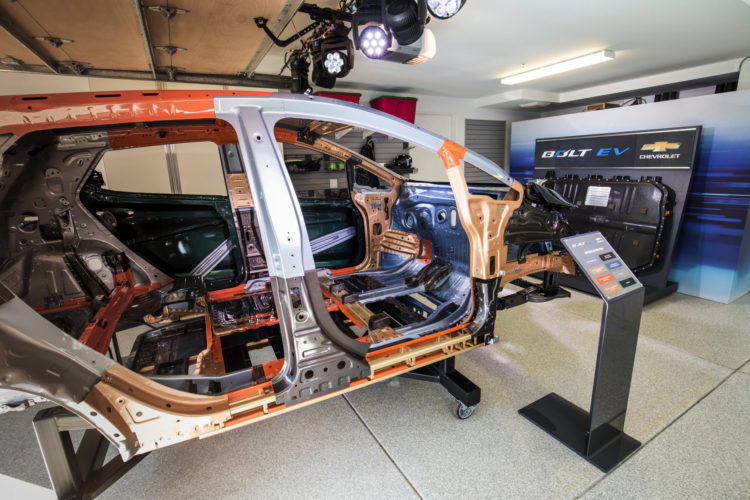 Both EVs have the battery pack along the bottom of the car, though the Bolt packs extra cells up under the back seat too.