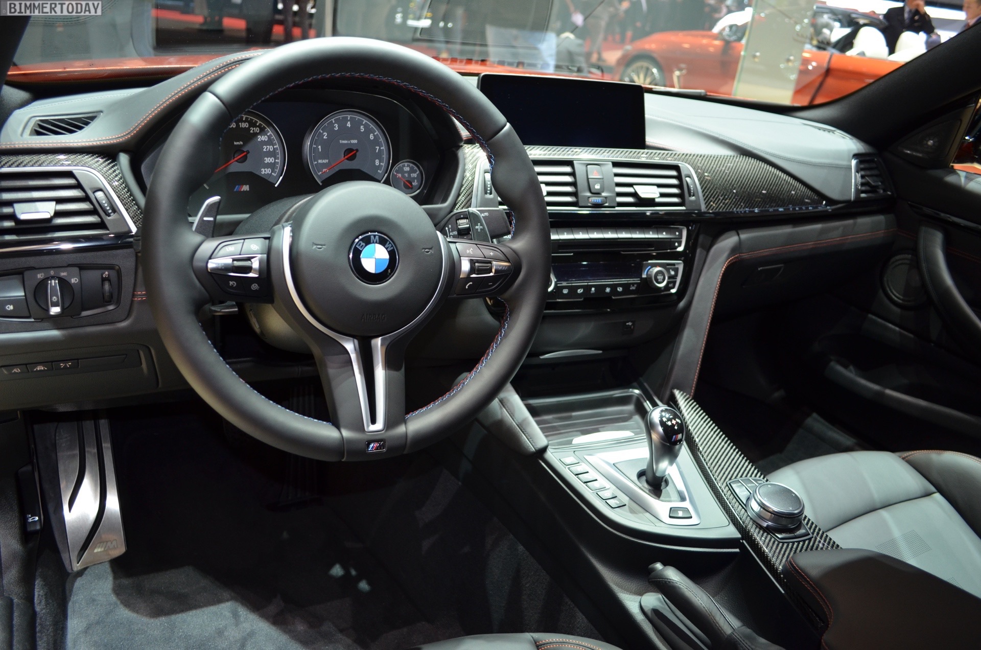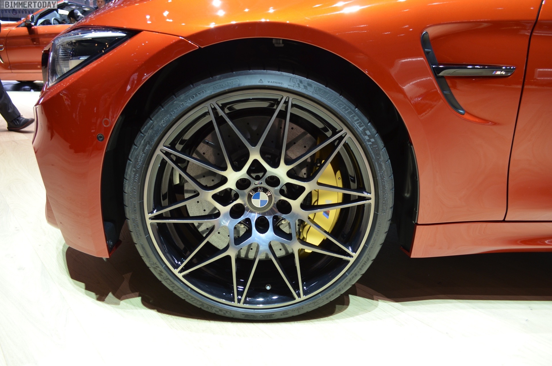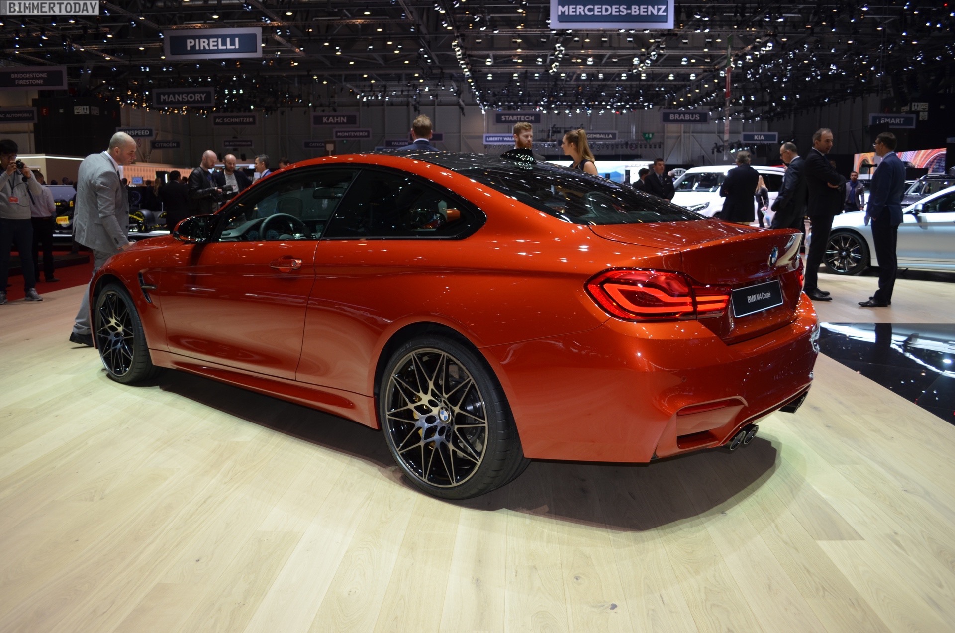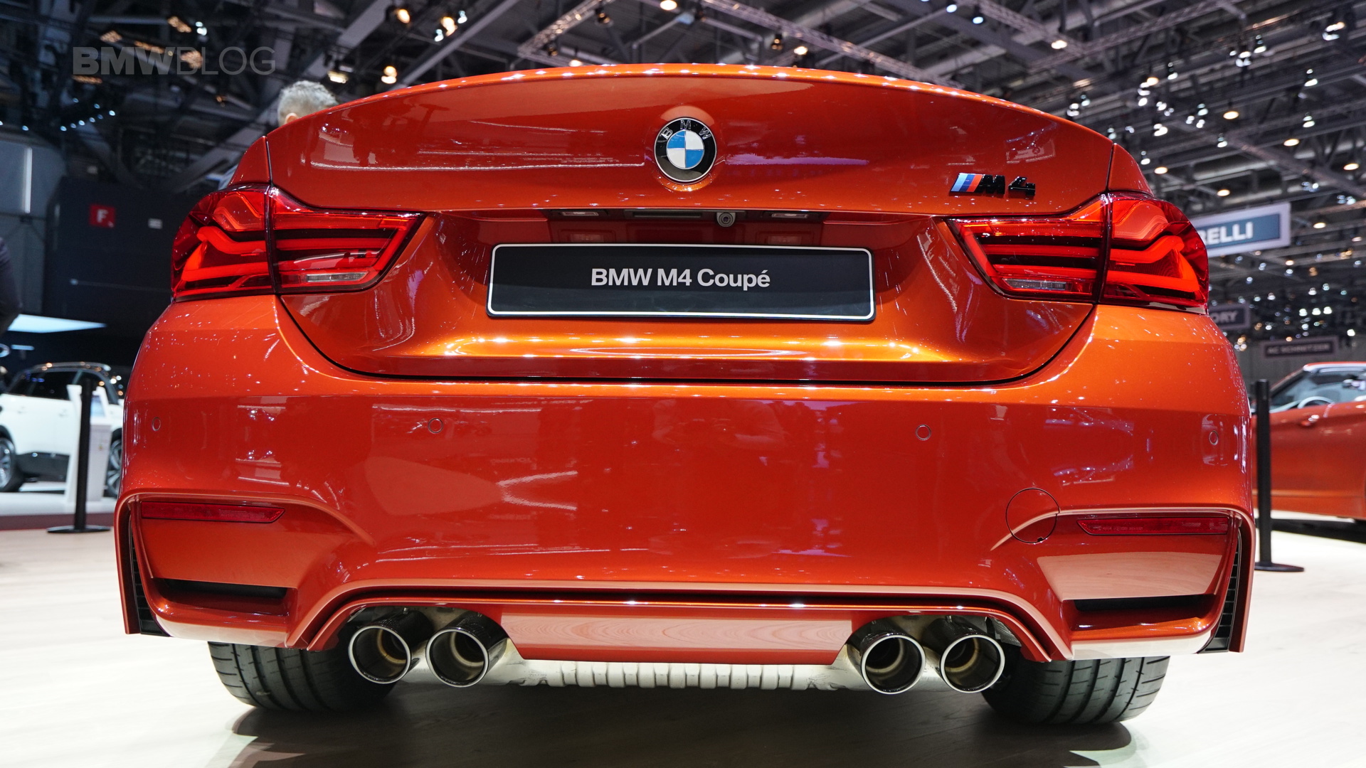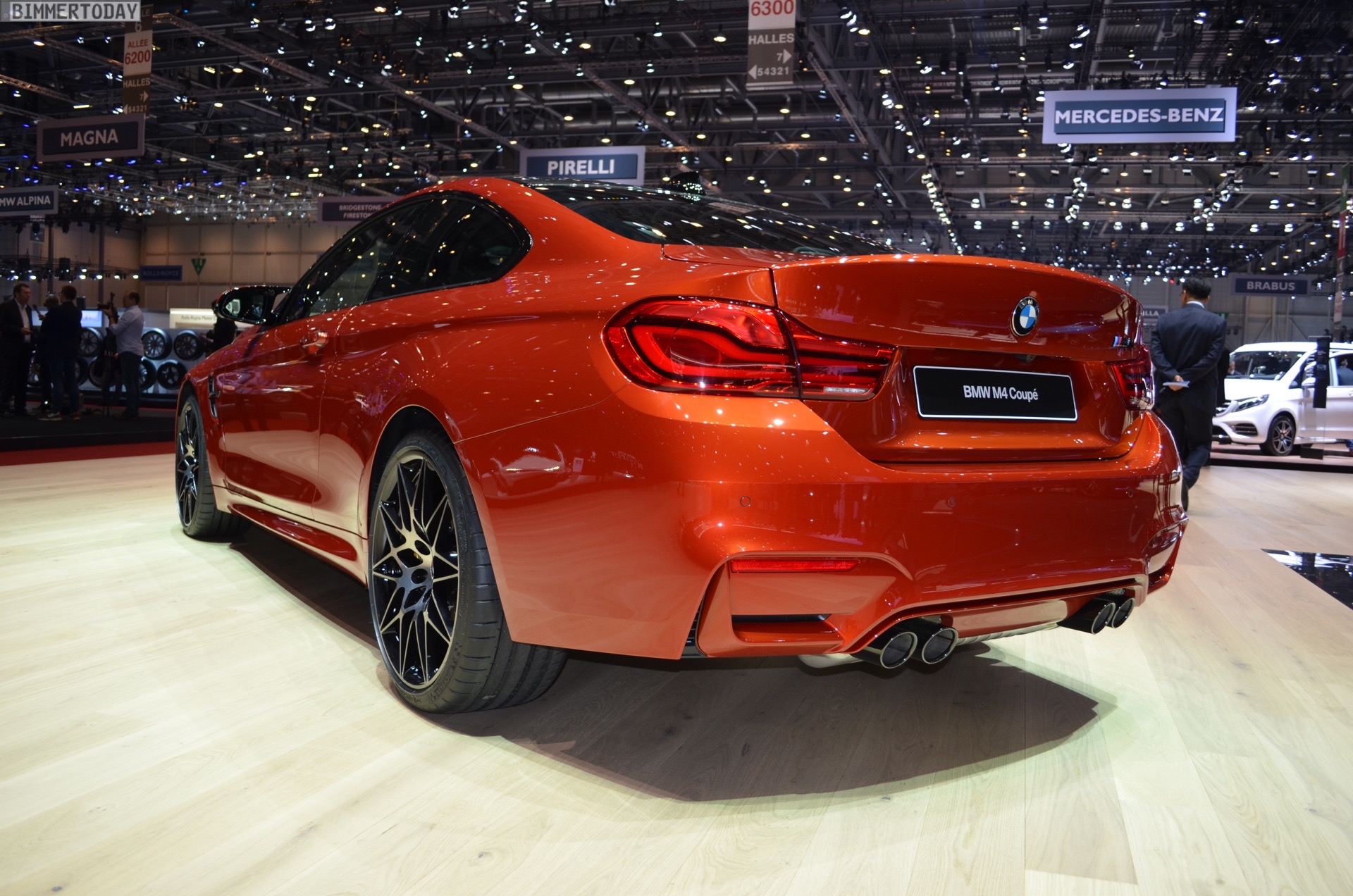On the first live photos from the show, we see the BMW M4 F82 LCI in Sakhir Orange, as well as with 20-inch light-alloy wheels of the star-spoke type 666 M – a clear indication of the Competition Package, which also provides a power increase to 450 hp after the facelift.