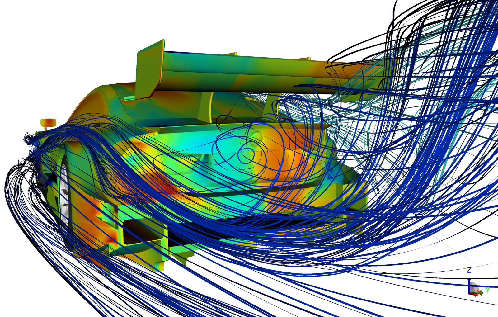 On computers, the aerodynamics experts simulate the effects of changes to the individual parts of each car – before the components have even been built. In the calculation, the model is split into a grid of 500 million three-dimensional cells, and the virtual airflows through them. Each of the cells can be separately analysed, sometimes for an entire day, depending on the type of simulation. Only half of a vehicle is required, as the air flow for straight-line travel is identical for both sides of the car.