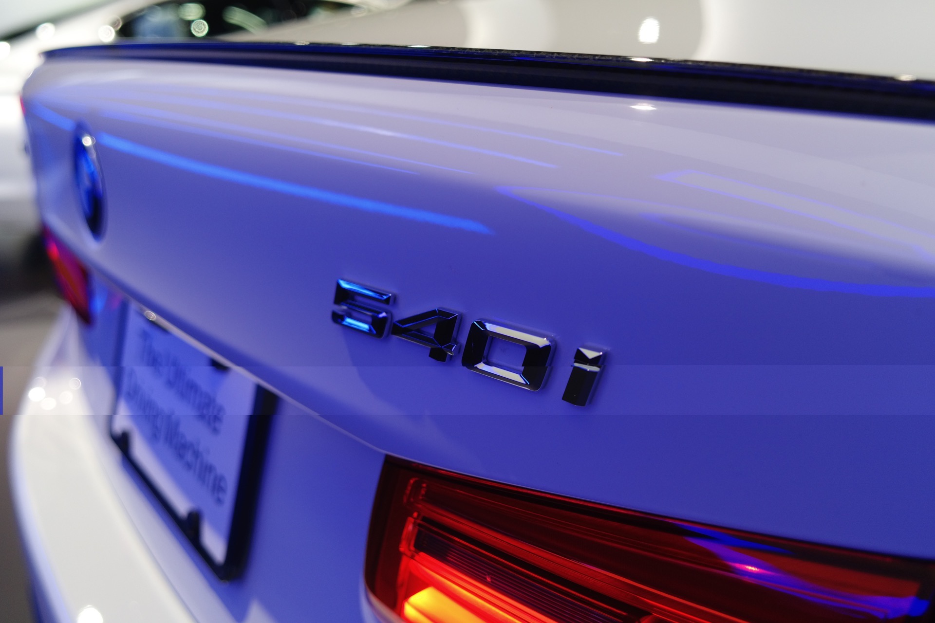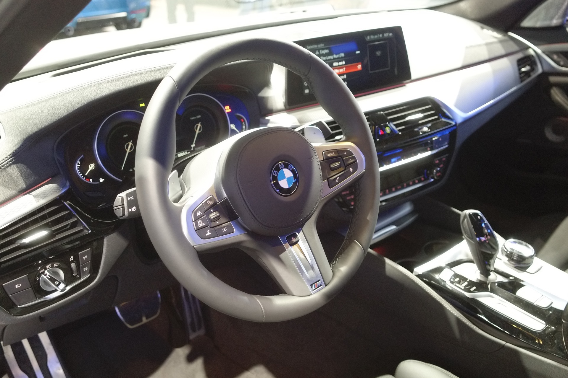 On the outside, this particular BMW 540i is wearing plain old Alpine White paint but has some M Performance livery going down the sides of the car and on the side skirts as well. The matte black livery with “M” logos and stripes definitely looks more aggressive. Whether or not it looks better is up to you. Personally, I’d take the side skirt bit and ditch the stripe down the doors. For me, the latter just looks a bit too childish for a 5er. It is sitting on 20″ wheels, though, and they look rather good. The spokes are long and spindly, giving a clear view of the brakes and M Sport calipers. Looks good.