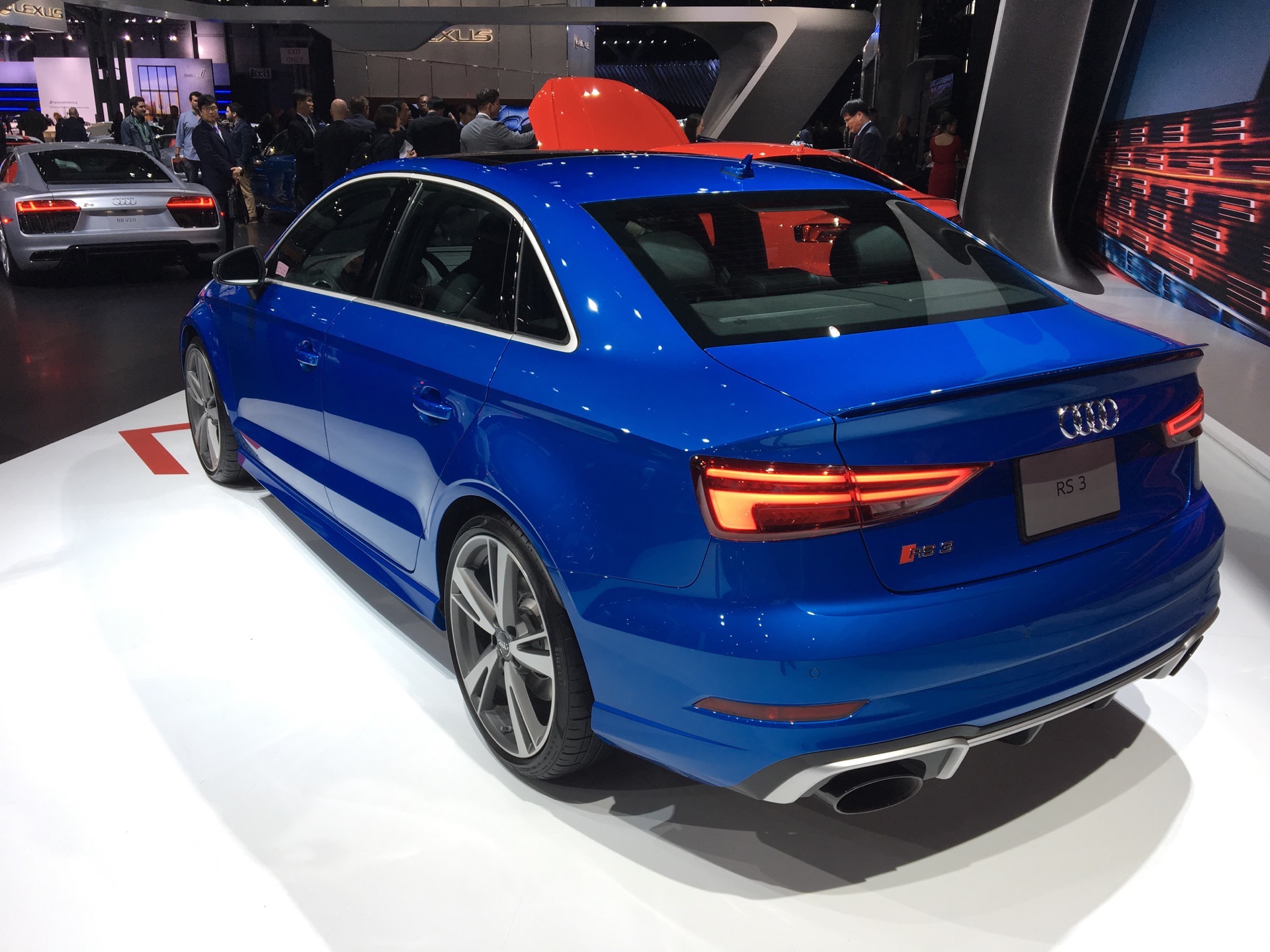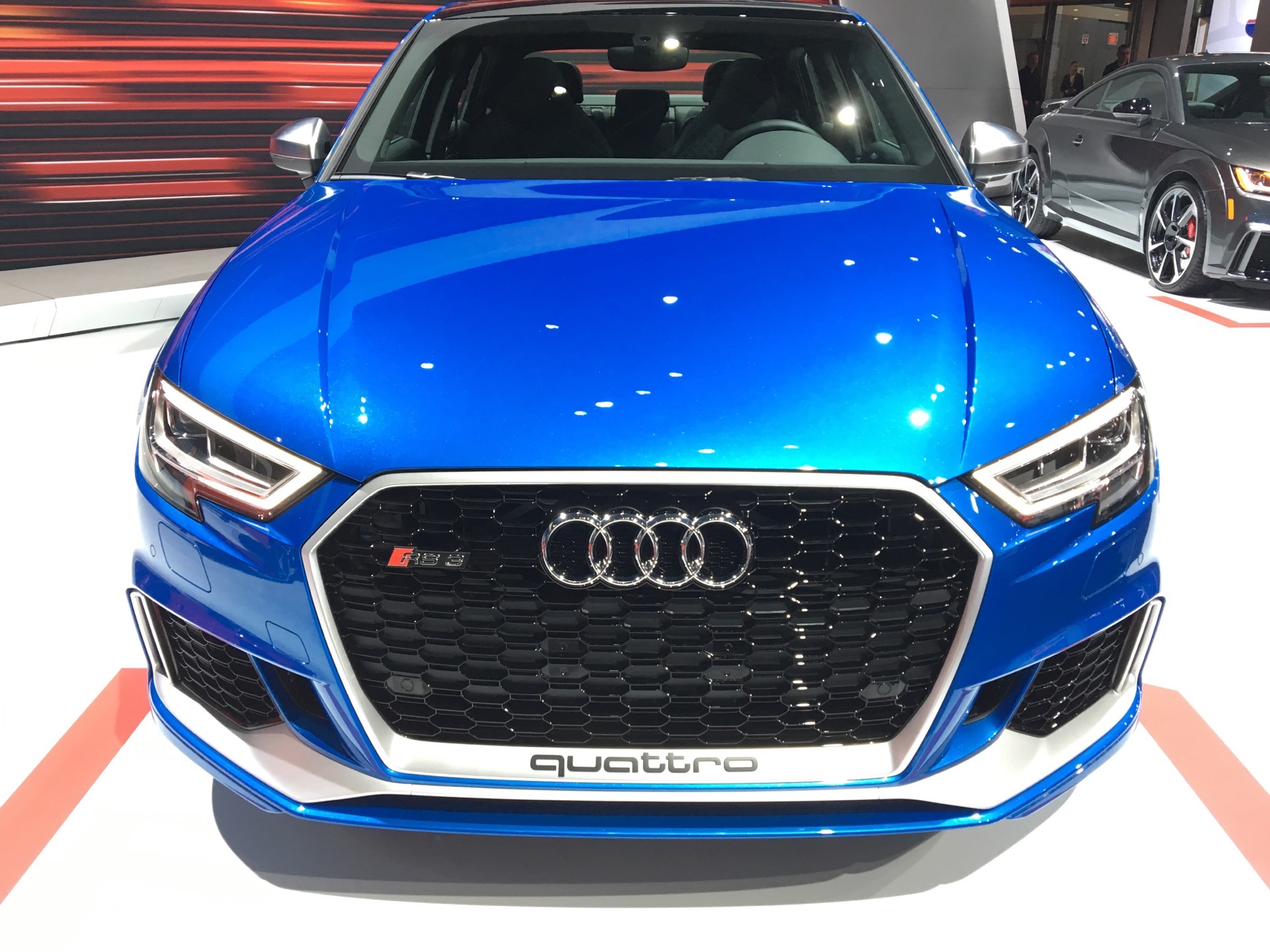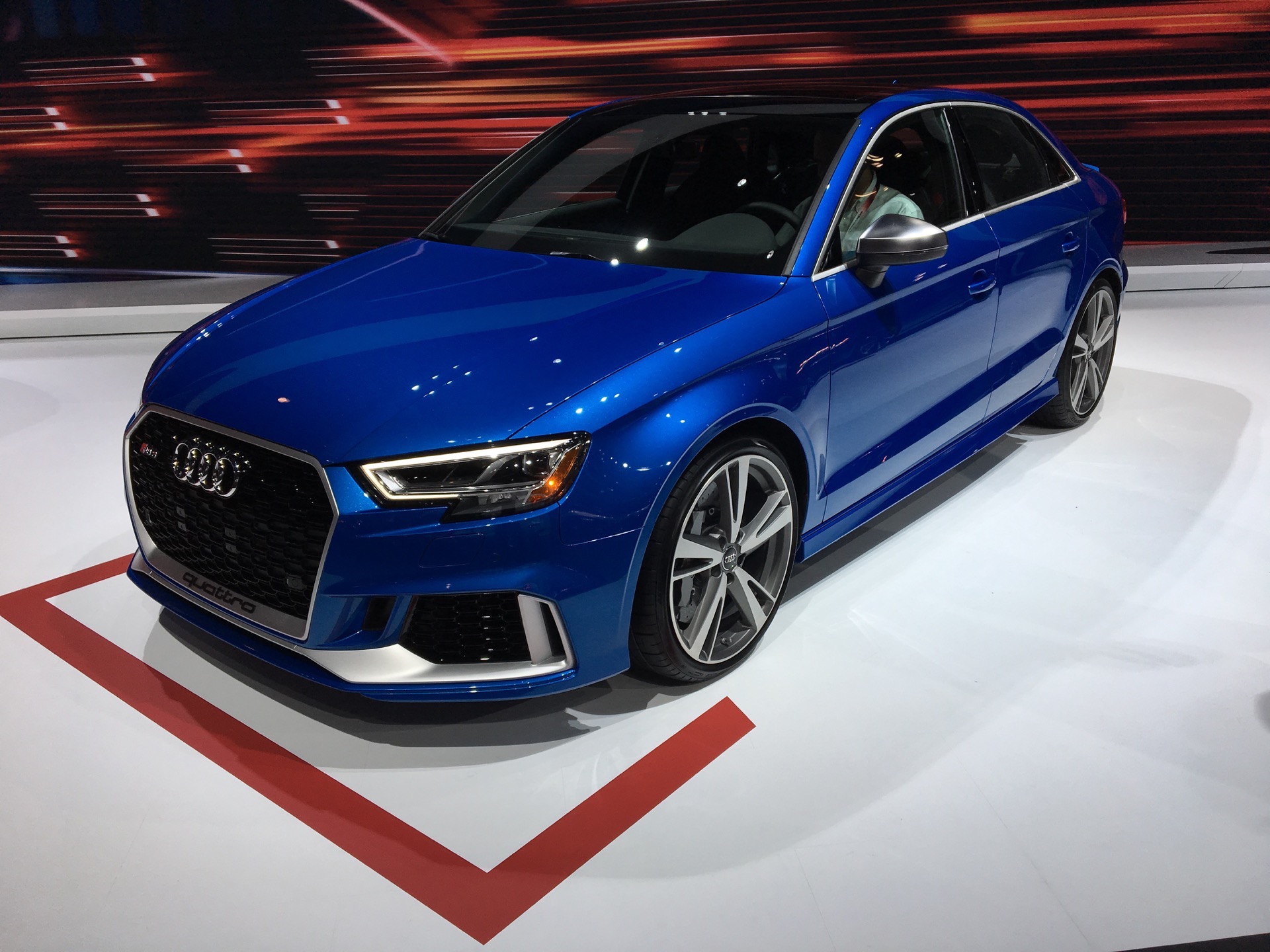 This specific car shown here in NY is wearing Ara Blue paint, which looked quite fantastic under the bright lights of the auto show. While the standard Audi A3 is about as bland a sedan as you can get, the RS3 Sedan has just the right amount of anger and aggression to make it exciting. The front air intakes, with “Quattro” written in the grille, rear diffuser and massive exhaust tips make the RS3 Sedan look like something special. Side note on those exhausts, they’re large enough for me to put my fist in with room.