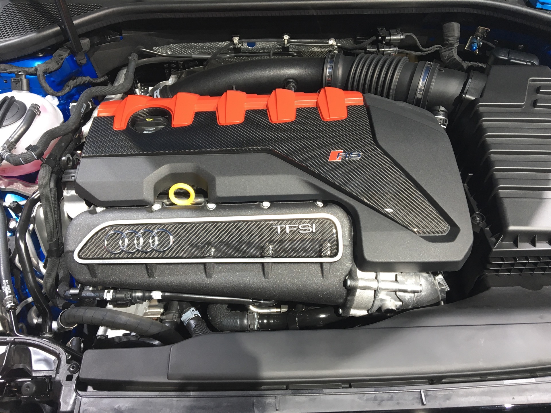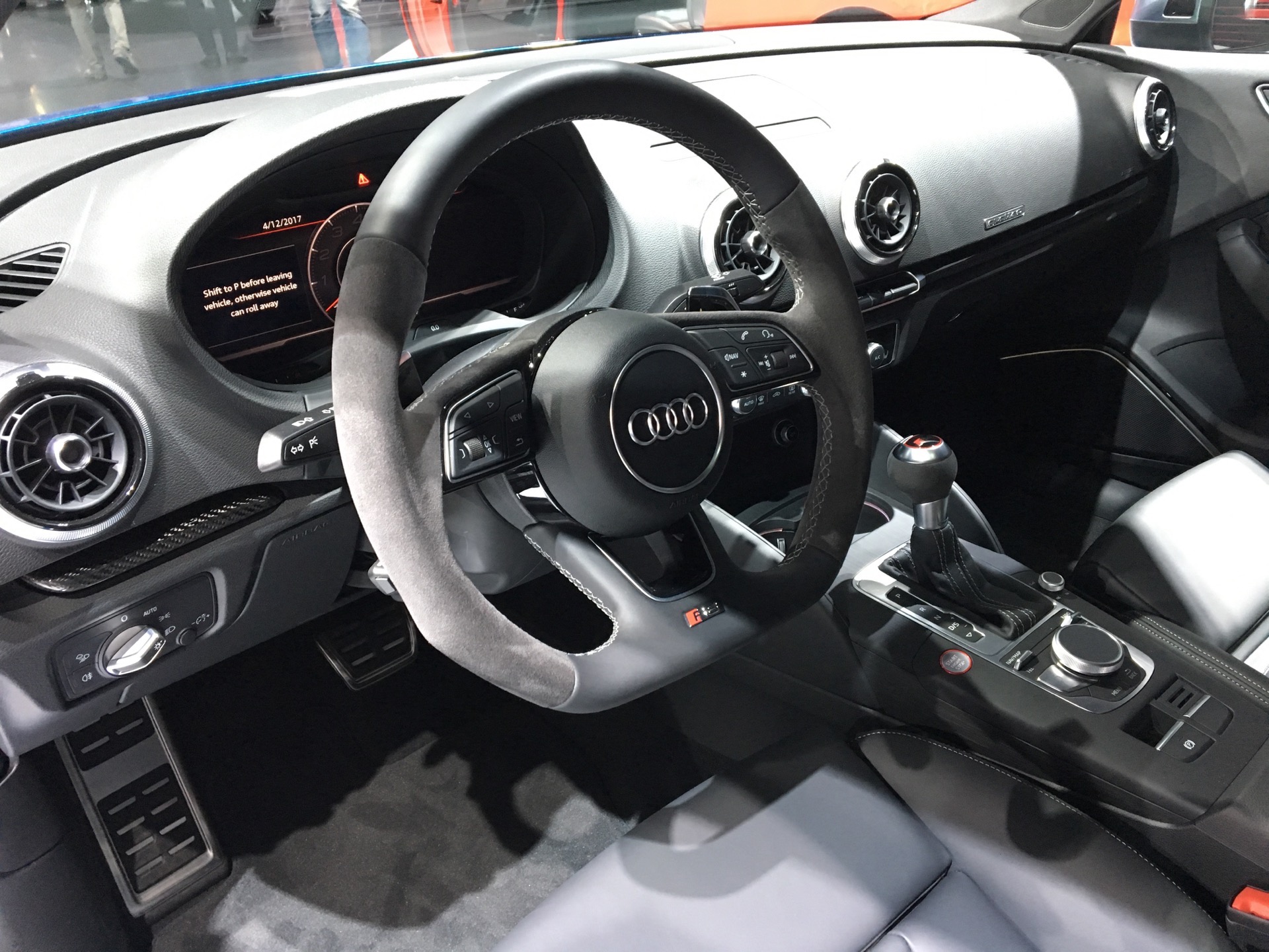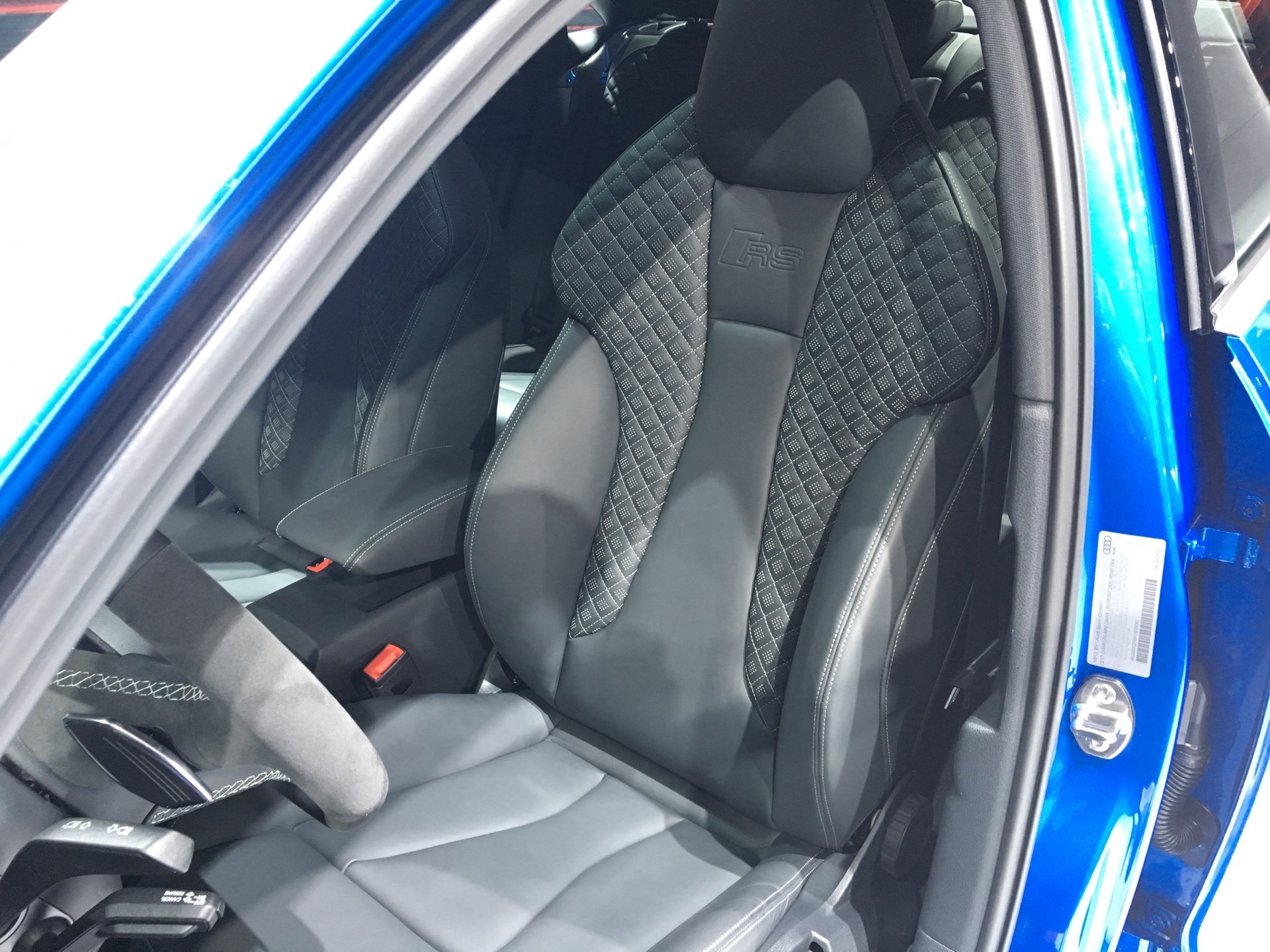 This specific car shown here in NY is wearing Ara Blue paint, which looked quite fantastic under the bright lights of the auto show. While the standard Audi A3 is about as bland a sedan as you can get, the RS3 Sedan has just the right amount of anger and aggression to make it exciting. The front air intakes, with “Quattro” written in the grille, rear diffuser and massive exhaust tips make the RS3 Sedan look like something special. Side note on those exhausts, they’re large enough for me to put my fist in with room.