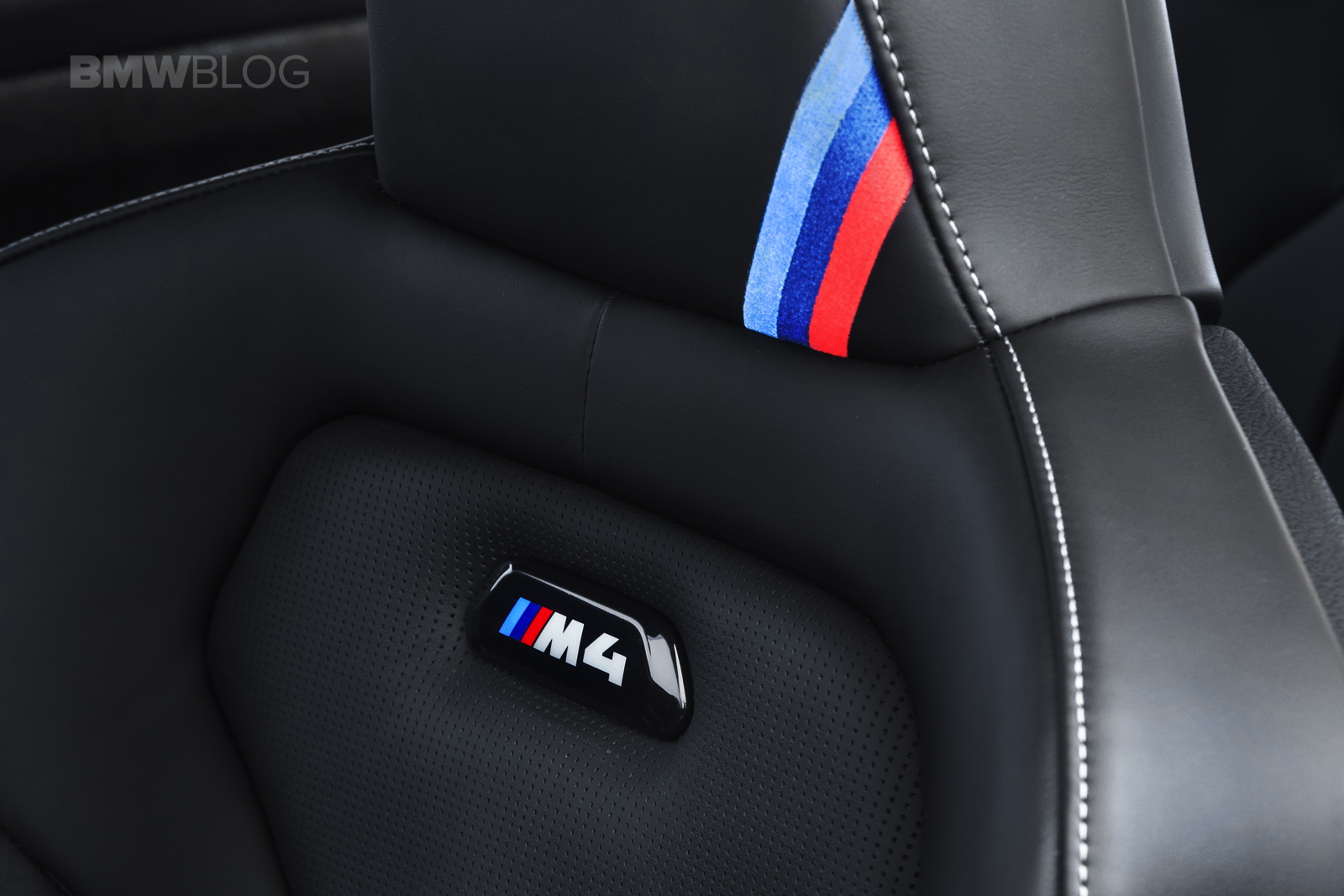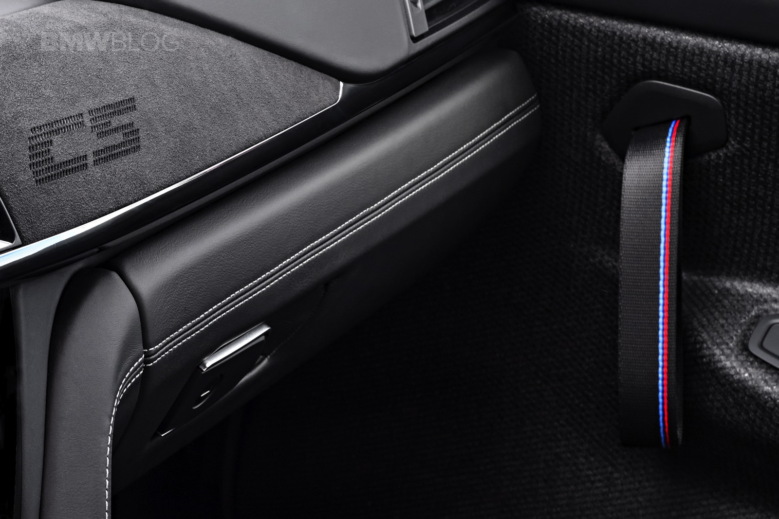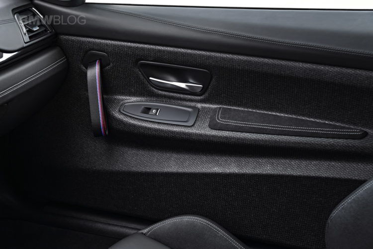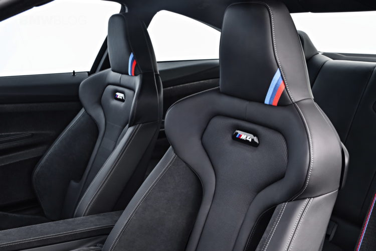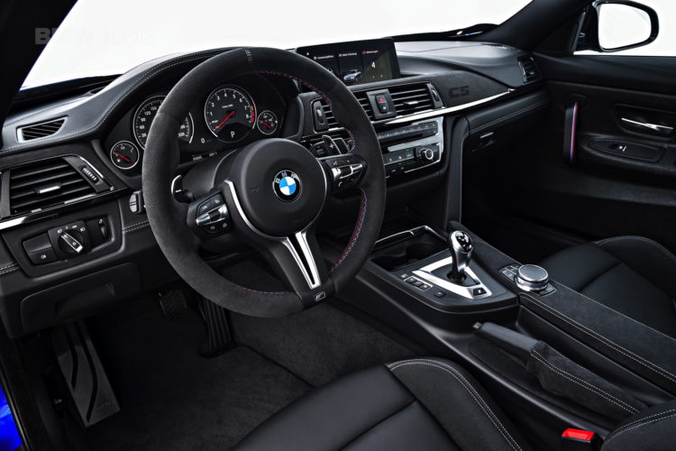 Inside, the BMW M4 CS gets some GTS treatment as well as some of its own design bits. The naked carbon fiber door panels and door straps are pulled from the GTS but the rest of the car is unique to the M4 CS. Its seats are partially leather and alcantara with alcantara trim throughout the cabin and white contrast stitching, rather than the M4 GTS’ orange. It also gets an alcantara steering wheel with center line and a unique “CS” logo embroidered into the alcantara dash trim. The M4 CS also ditches the GTS’ orange roll cage for a pair of back seats, making it far more usable everyday.
