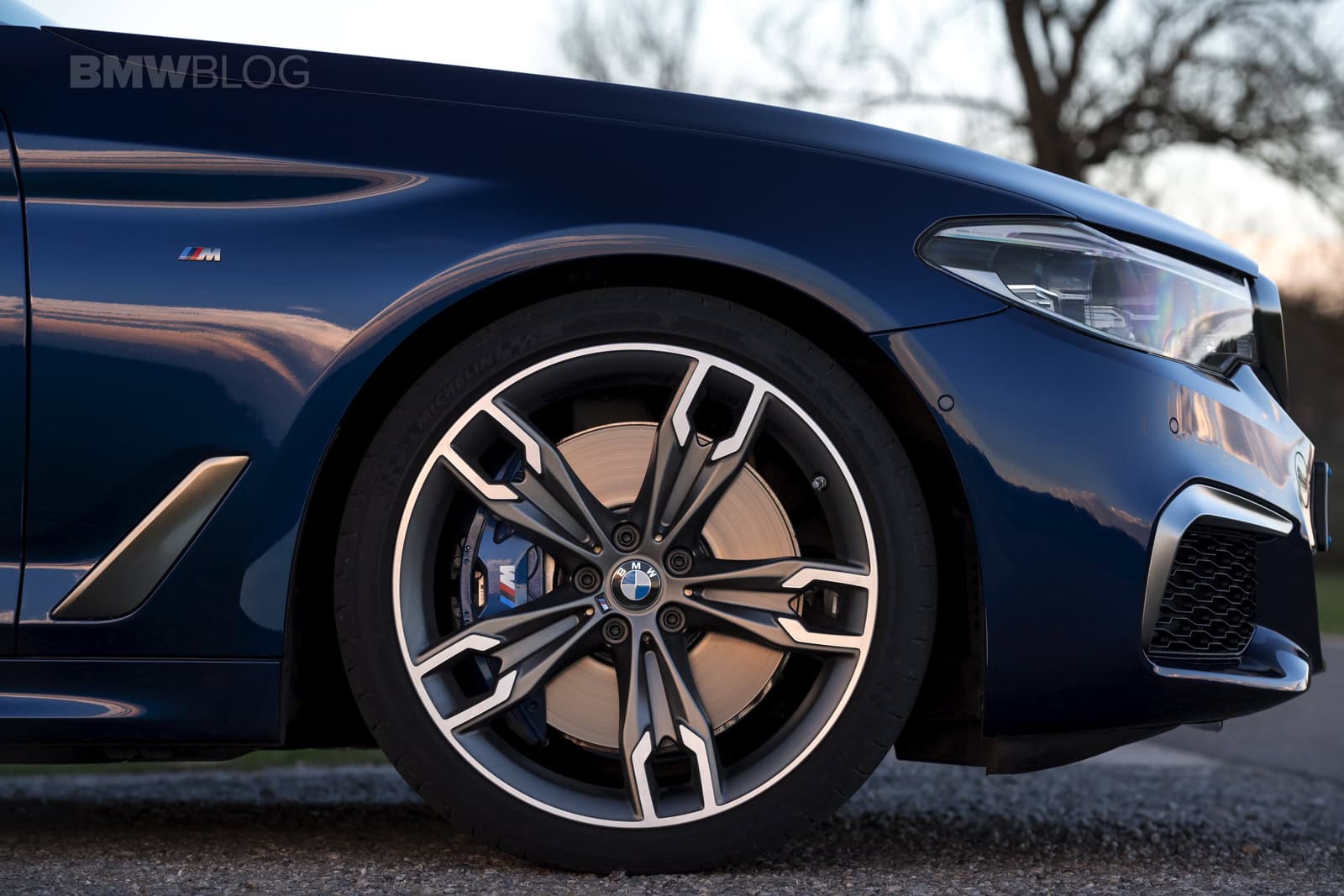 M Sport brakes with blue calipers and “M” badging are standard on the M550i. Brakes are definitely up to the task as I found out when a semi truck pulled out unexpectedly into my fast lane on the Autobahn where I was doing about 180 km/hr. I nailed the brakes hard and they pulled the M550i down to about 100 km/hr so hard it made my seatbelt latch catch.