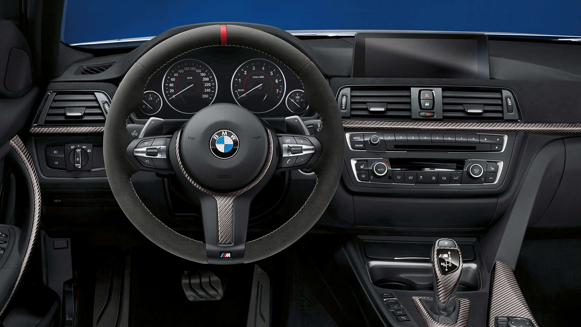 For a racing-inspired cockpit ambience there is a BMW M Performance sports steering wheel in Alcantara with red central marking.