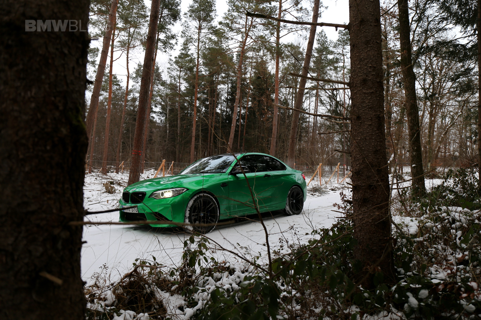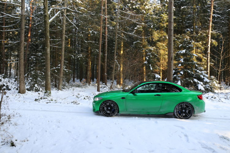In addition to the M performance parts, the green M2 received also a chassis upgrade by the well-known BMW expert Laptime Performance. A KW Clubsport V3 was installed and offers an even enhanced driving experience of the M2.