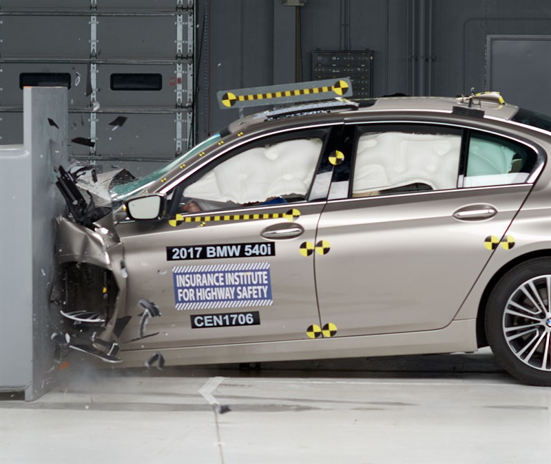 One of the most important aspects of the IIHS’ tests is the front overlap crash test. Basically, if a car hits an object head-on but only connects on the outer edge of the front end, it will do the most damage, as there’s the least amount of structure there to lessen the impact. So the IIHS developed two tests, the “Small Overlap Front” and “Moderate Overlap Front”. The BMW 5 Series scored a “Good” rating in both, the highest rating possible. You can see the video of the small overlap front test below and watch as the 5 Series simply deflects the damage outward and pushes the car away from the impact, lessening the blow to the passengers. This is, of course, by design, as the front end is designed with crumple zones to deflect the energy out and away from the passengers in the event of an overlap crash.