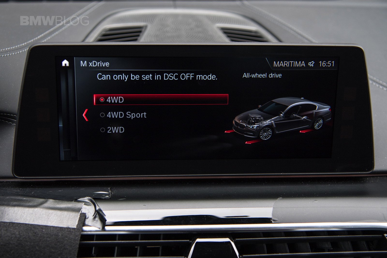 This active control element is part of the M xDrive system’s functionality and its locking effect can be varied between zero and 100 per cent, as the situation demands. With DSC deactivated, there is a choice of three modes (4WD, 4WD Sport and 2WD). On startup it defaults to DSC on and full all-wheel drive.