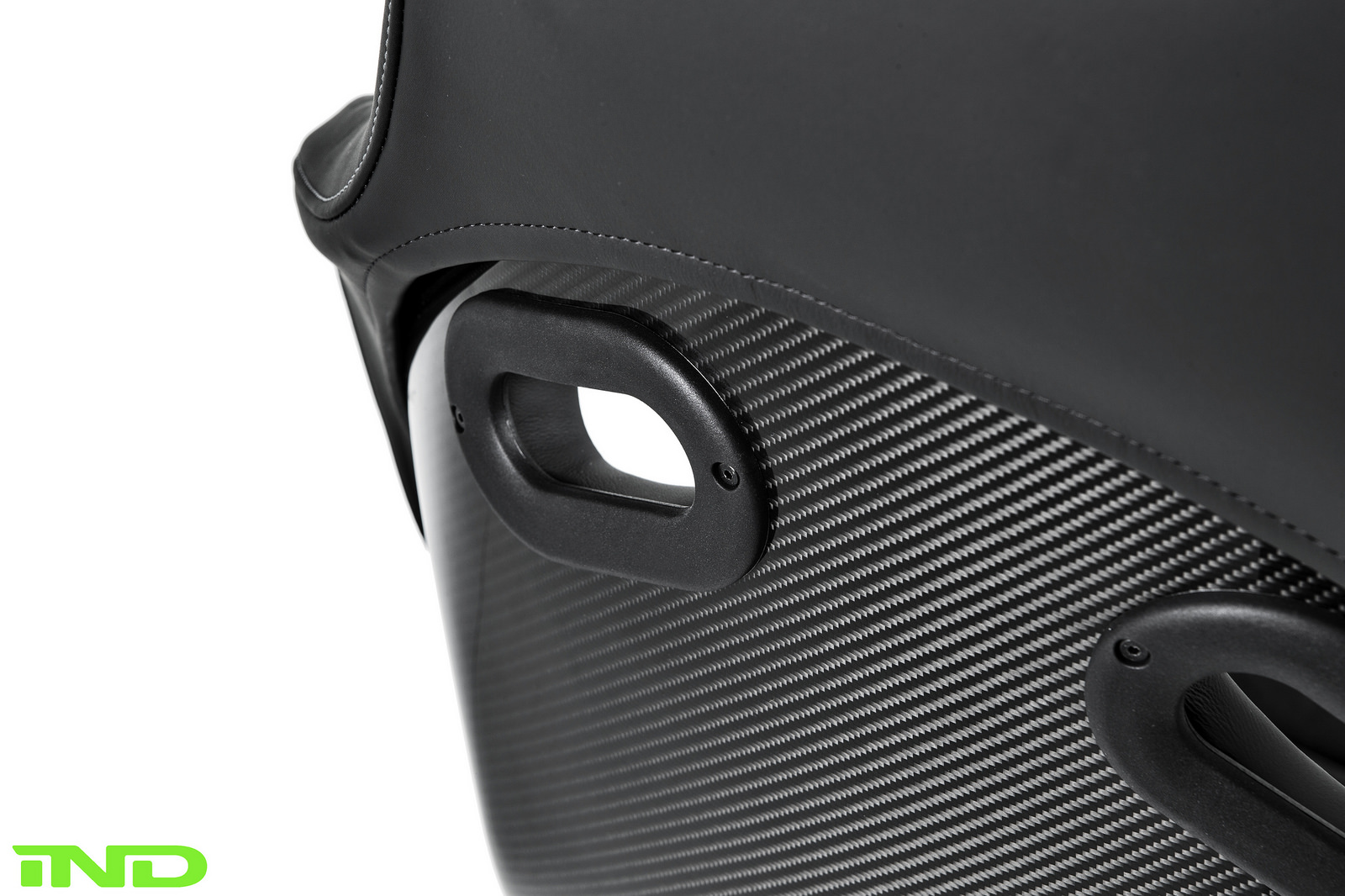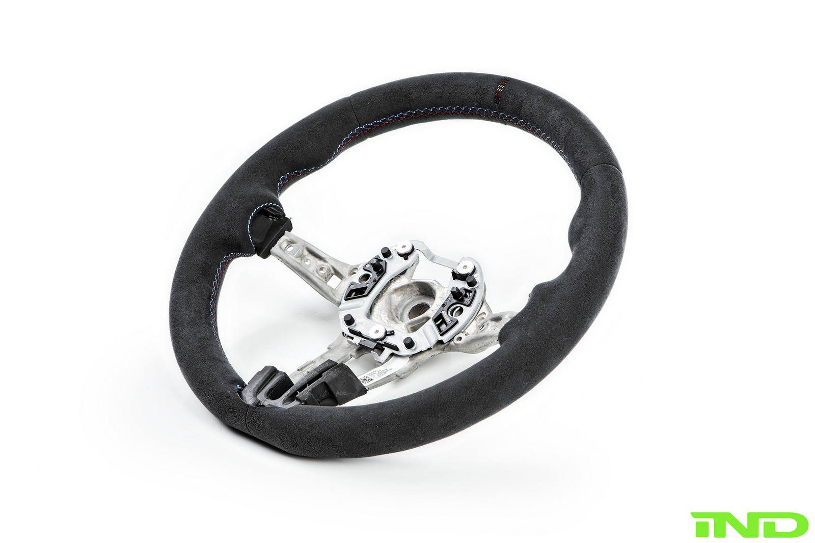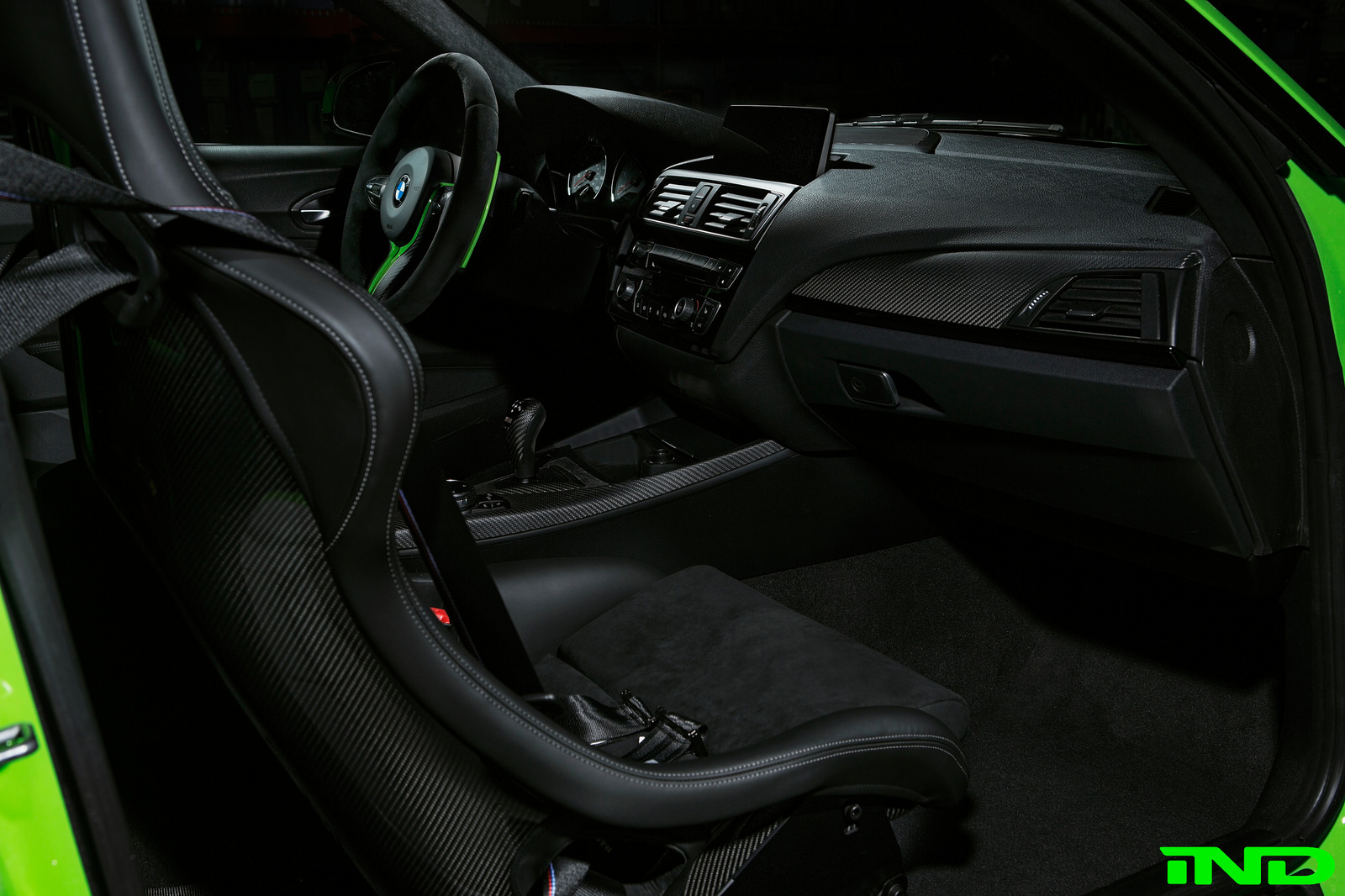 The M4 GTS steering wheel was a natural addition to the M2, integrating perfectly with BMW’s GTS seats. AutoTechnik shift paddles offer easier access to up and downshifts, and were refinished in GelbGrün to add subtle color to an otherwise relatively dark interior. The GTS fire extinguisher was also added to complete the GTS interior feel. IND removed all original blue stitch from the M2’s door panels, center console, parking brake boot, and floor mats to more easily integrate our own GelbGrün color.