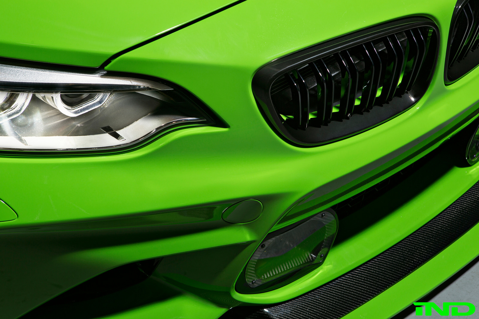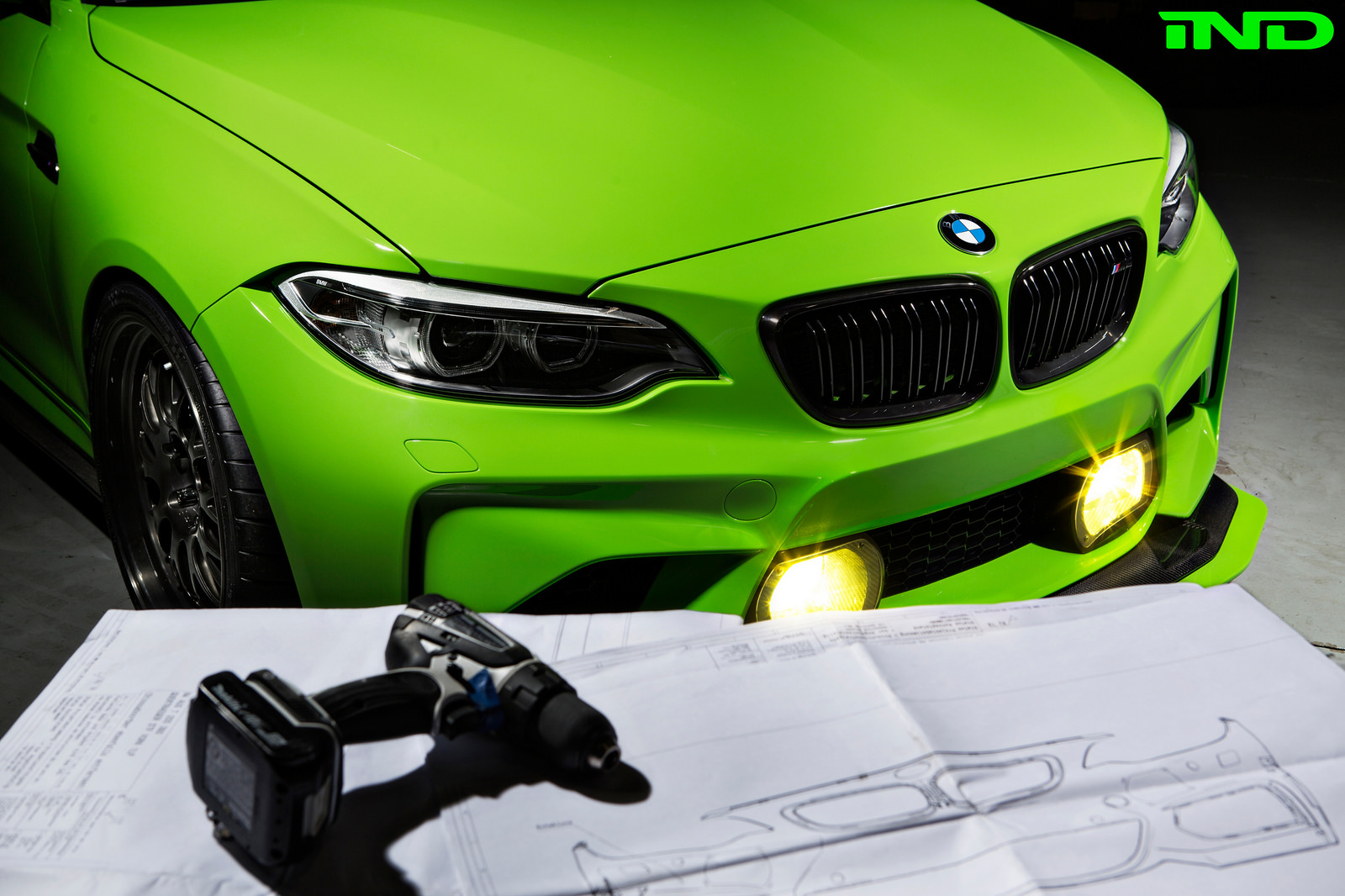 To complete the exterior of the car, IND directed their attention directly to the BMW Motorsport catalog, and got to work. M235R 24 hour foglights were a style centerpiece for this project. IND created custom carbon fiber fog light mounts in-house, and carefully positioned the fog lamps in the front bumper.