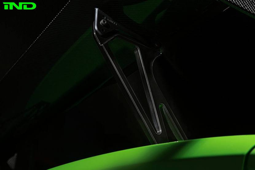 A brushed finish was painstakingly applied to the RKP wing uprights, which were then covered in a tinted clear coat for a subtle appearance. Finally, Cartridge Limited carbon fiber endplates were installed to make our BMW Motorsport wing even more special.