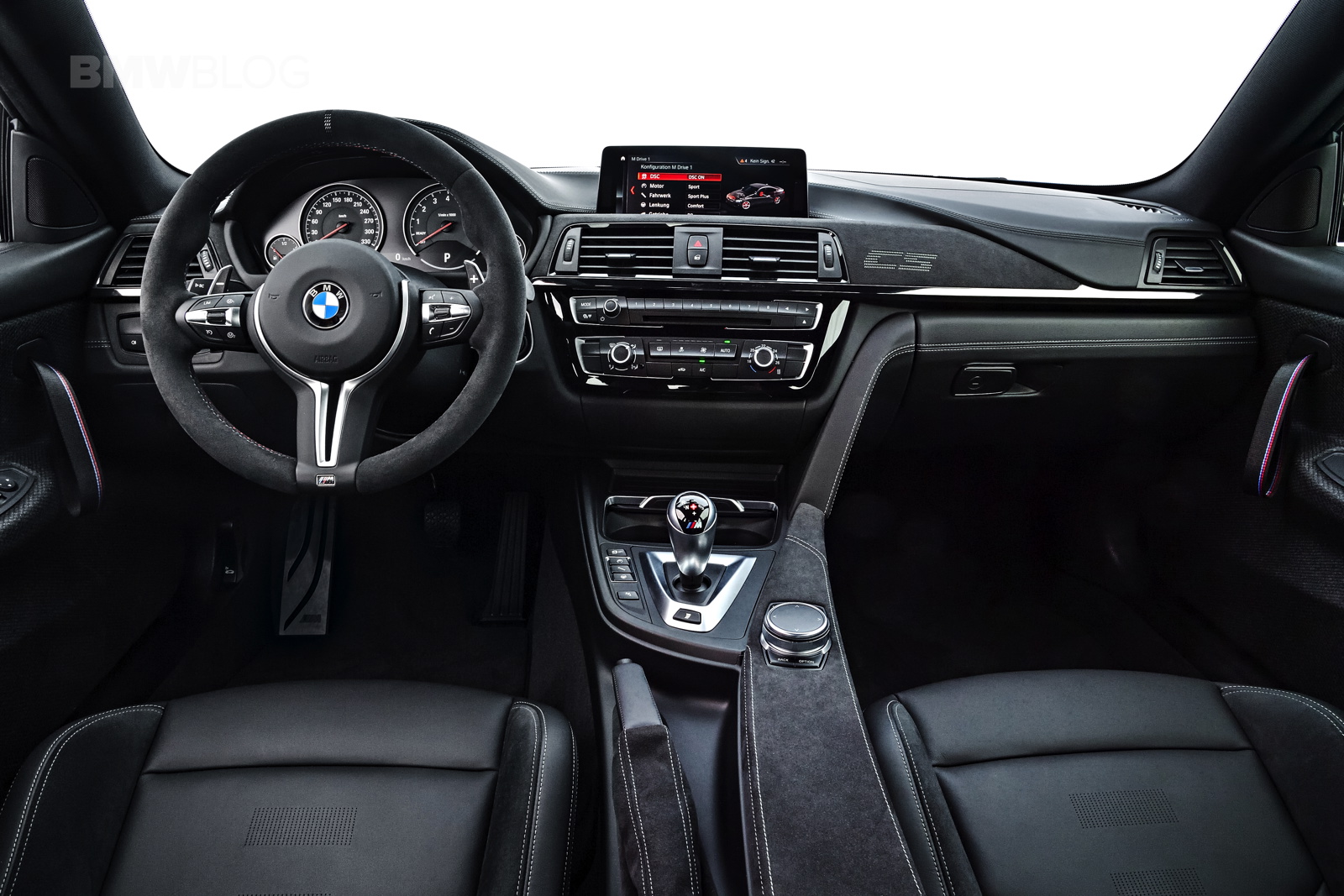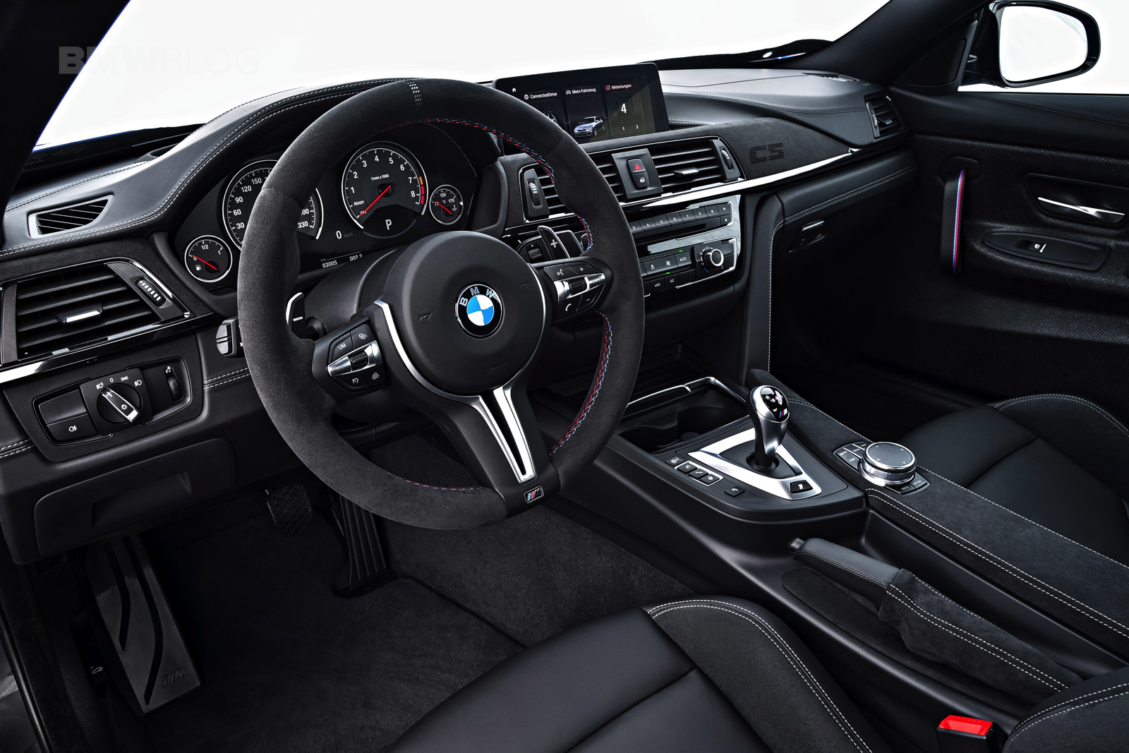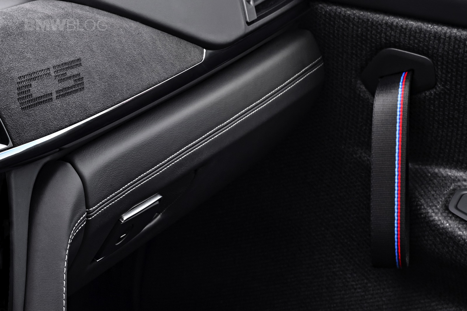 Inside, the BMW M4 CS gets some GTS treatment as well as some of its own design bits. The naked carbon fiber door panels and door straps are pulled from the GTS but the rest of the car is unique to the M4 CS, like the alcantara steering wheel with center line and a unique “CS” logo embroidered into the alcantara dash trim.
