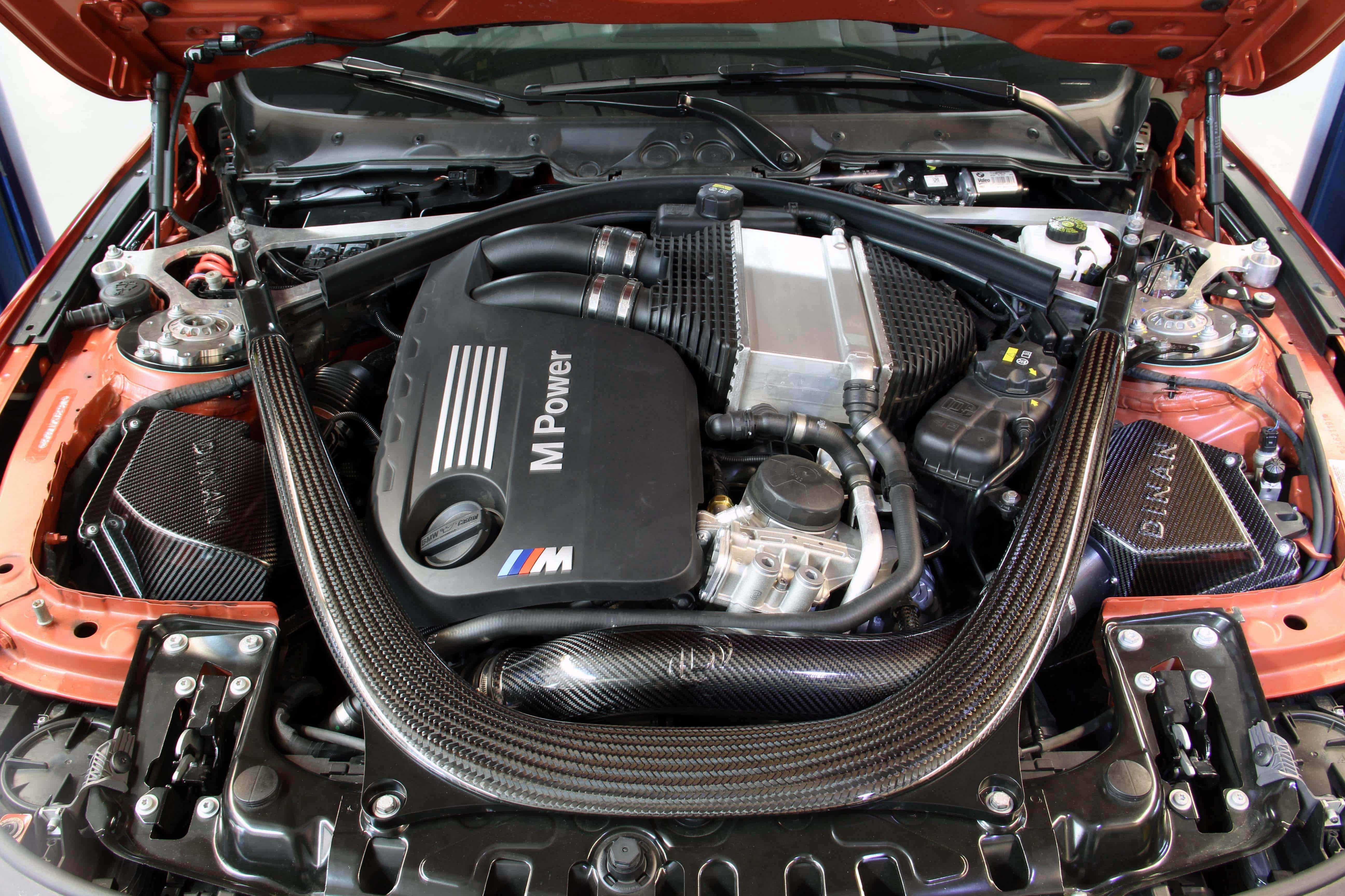 Dinan’s S55 cold air intake uses a sealed air box that prevents the intrusion of hot, under hood air thanks to its relocation to push in cold air. Air is passed through a 30 percent larger high-flow filter, past an upgraded MAF sensor and into a carbon fiber tube that provides 20 percent more air volume than the stock piece. This alone would give the engine max gains of up to 14 hp and 21 lb-ft of torque.