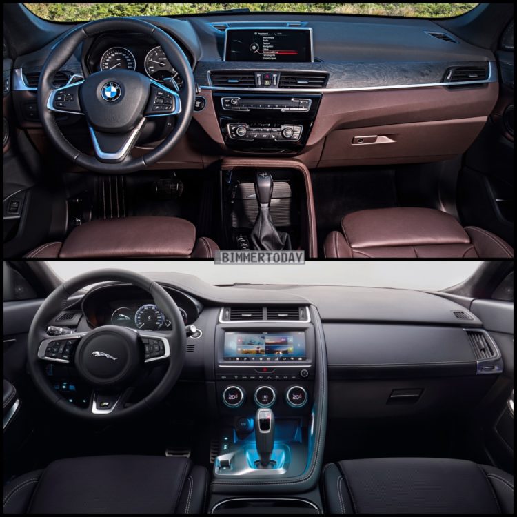 On the inside, it’s a bit of a tossup. The BMW X1 looks a bit more premium, especially with the wood trim in these photos, and it seems to be more smartly laid out. The Jag is very chic and modern and looks quite good. But it’s a bit plain and rather simple. I think the BMW X1 wins the interior battle, here, but it’s close. We’re not going to comment on interior quality, as we haven’t been inside of the Jag yet, so we’re just basing this on styling.