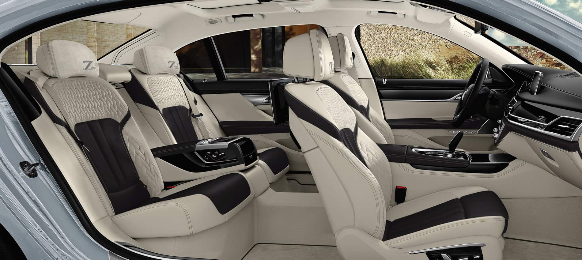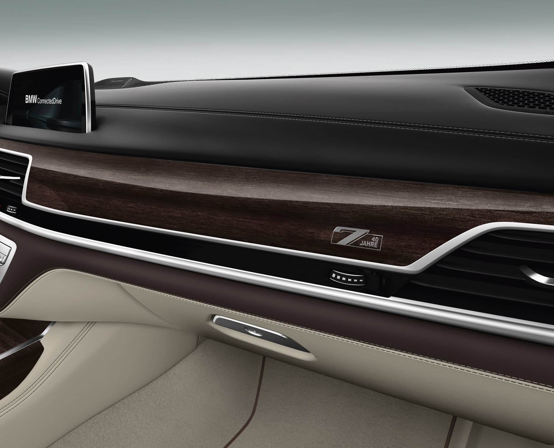Inside the edition models you can find the BMW Individual full leather trim Merino fine grain in the colour combination Smoke White/Cohiba or Smoke White/Black with hand woven piping in Smoke White matching perfectly with the BMW Individual Alcantara Smoke White roof liner. Moreover, BMW 7 Series Edition 40 Jahre models are all fitted with comfort seats both at the front and rear. BMW Individual interior trim strips are offered either in a black piano lacquer finish or in the high-grade wood finish Eucalyptus straight-grained Smoke Brown high gloss, depending on the upholstery colour.