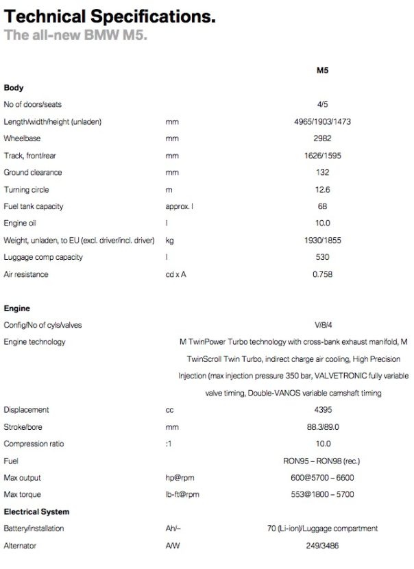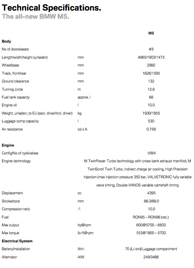 As far as technology goes, the new M5 pretty much has all of the new tech you’d expect from a new BMW. So, the new iDrive system, Gesture Control and Remote Parking functions are all available. The gauge cluster is all digital and gets M5-specific graphics that show which driving, powertrain and Drivelogic modes are engaged. There are also programmable shift lights built into the graphics, showing when to shift based on variable rpm settings. There’s also a new M-specific Head-Up Display which shows all of this information as well.