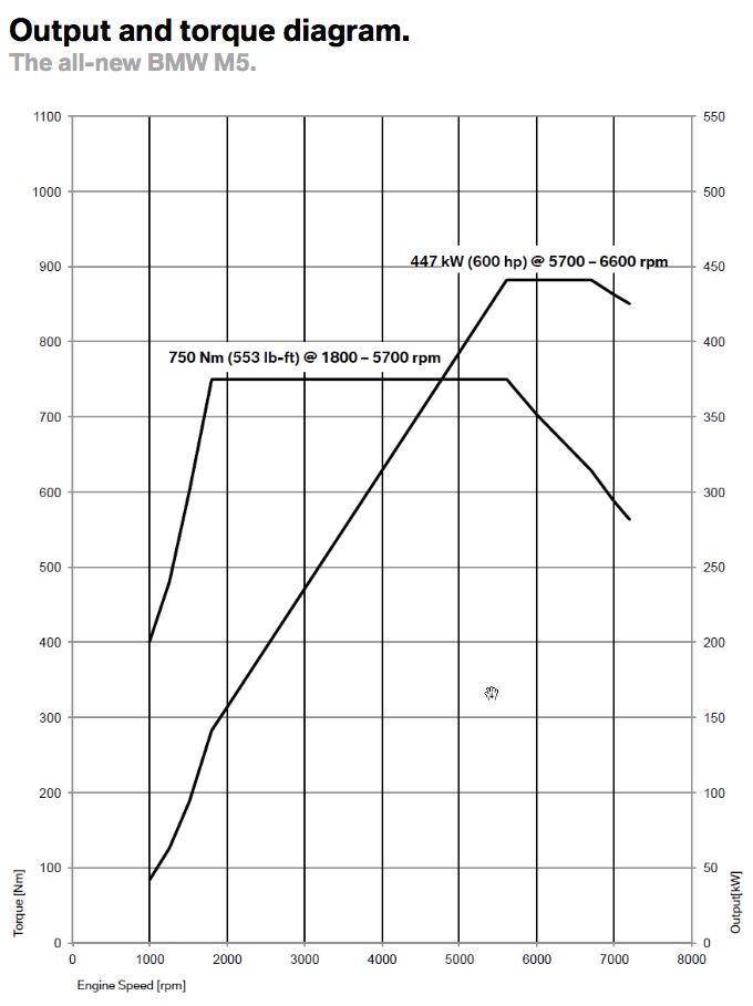 Peak torque comes in at just 1,800 rpm, allow for violent launches. That torque curve remains flat until about 5,700 rpm. So mid-range punch should be absolutely enormous, also. High-speed overtakes should be a breeze in this M5. What’s even better is that at 5,700 rpm, when the torque starts to drop off, peak horsepower kicks in. So just as torque is starting to wane, you get the full 600 hp sledgehammer.