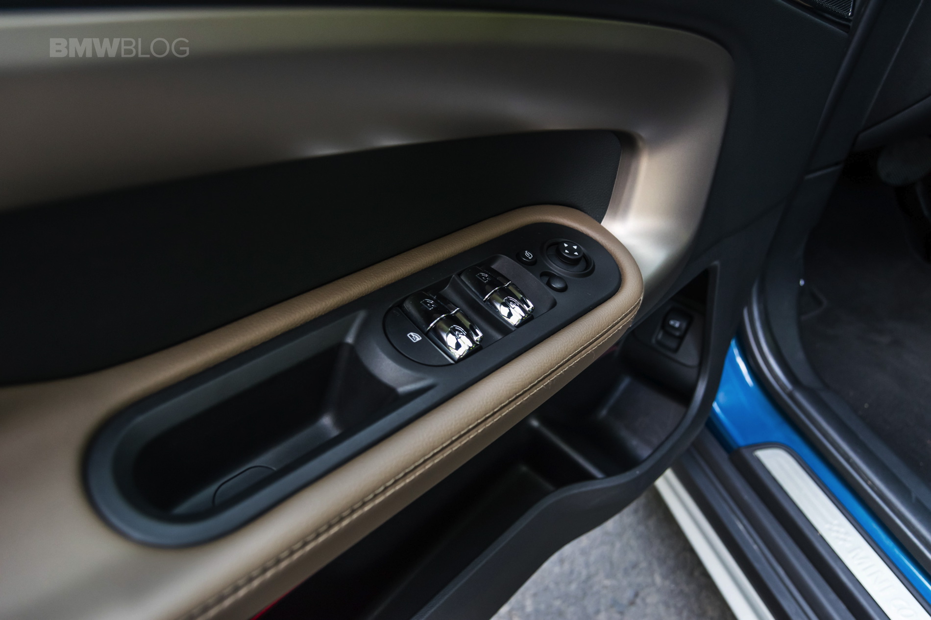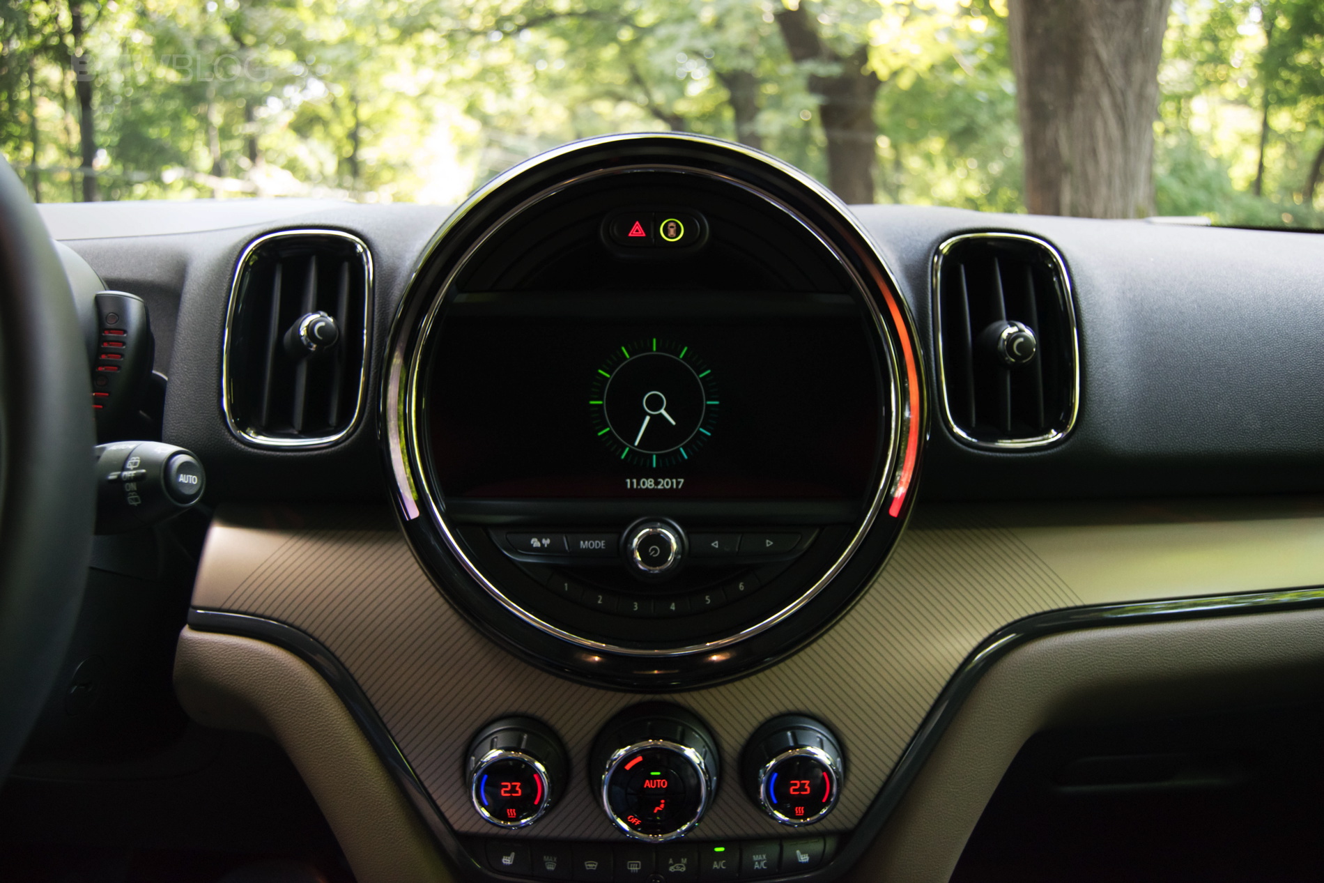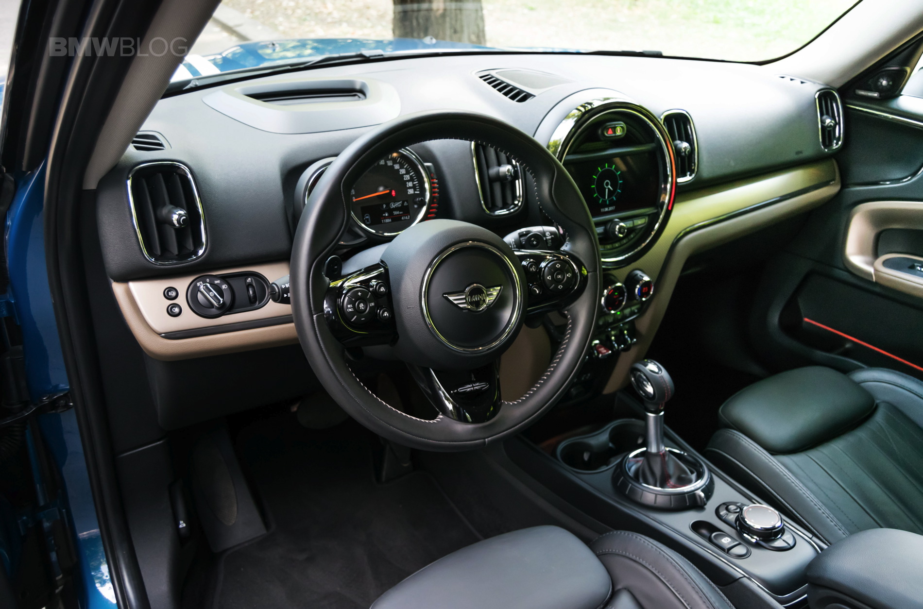 Speaking of buttons, the cabin remains a typical MINI environment, decked with toggle switches everywhere and offering plenty of customizing choices for the customers. The one that you notice immediately is one big piece sitting between the infotainment screen, top part of the dash and the start button. It’s a big trim piece which can be had in a variety of choices. In the case of our tester, it was beige with black stripes and it came alive at night, having blue and red LEDs behind it, giving a rather special feel altogether. Definitely a nice touch by MINI.