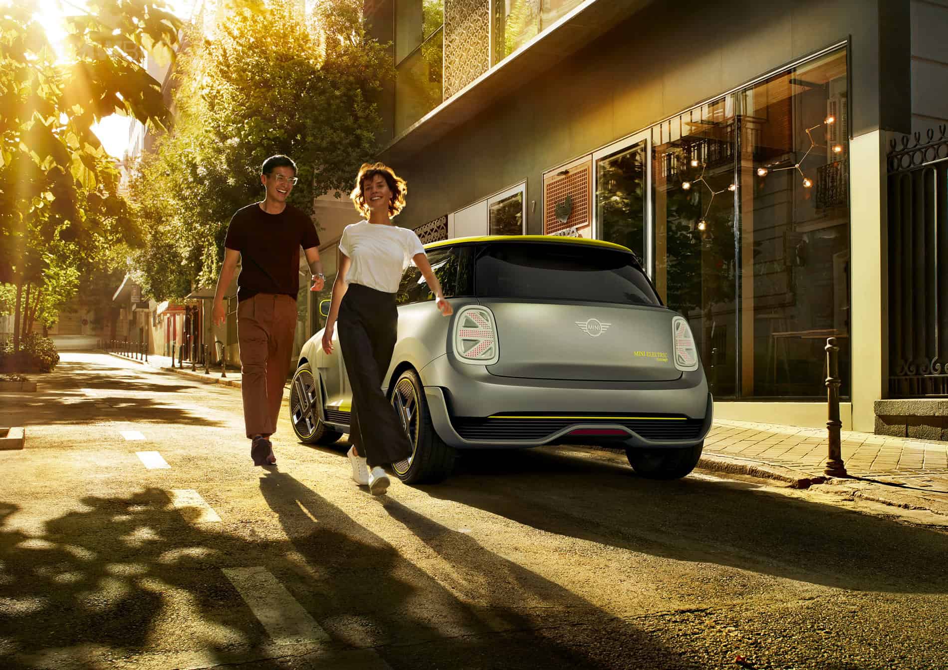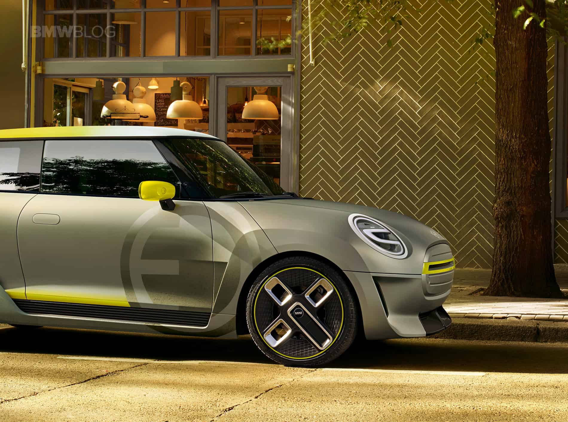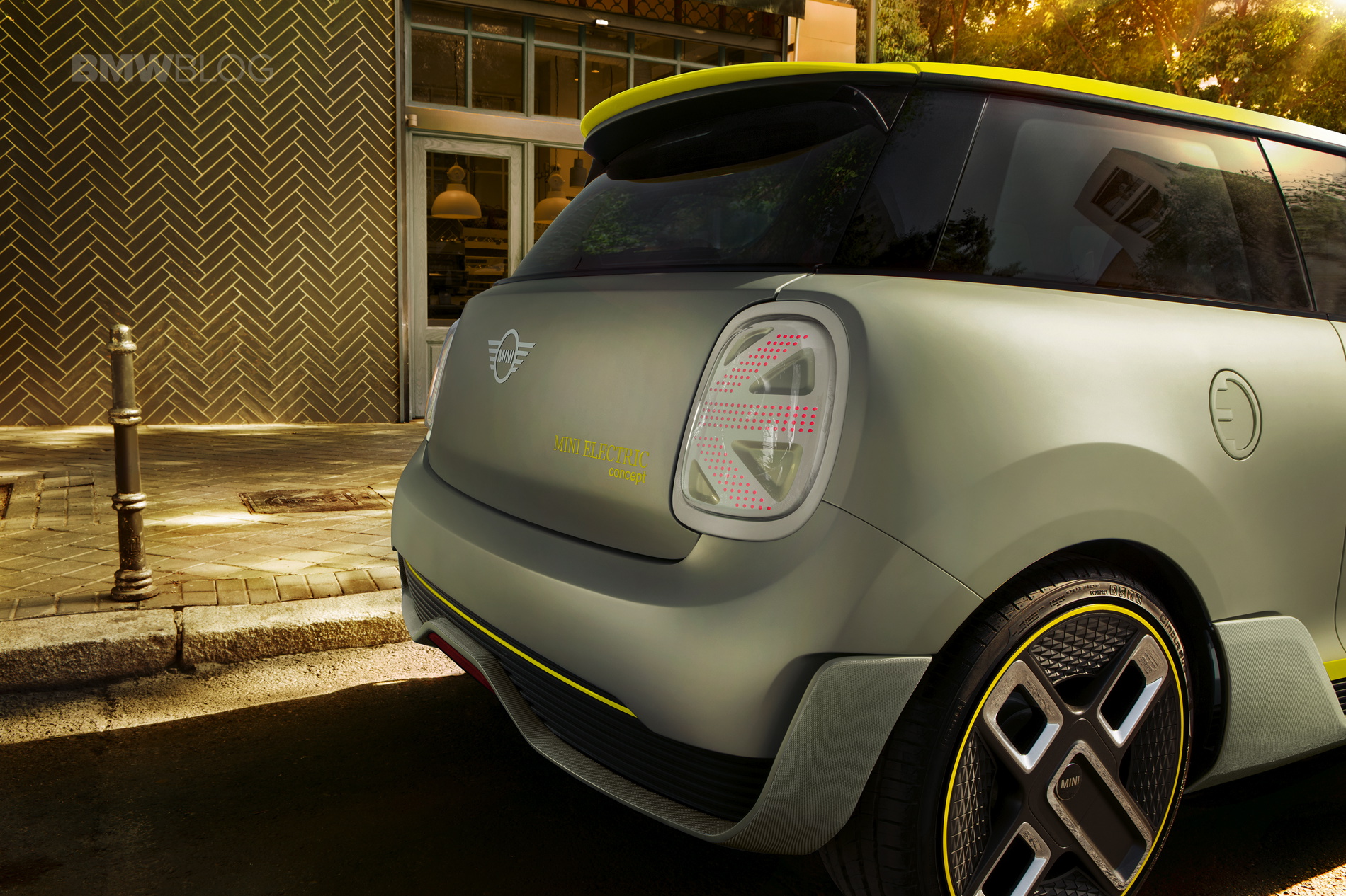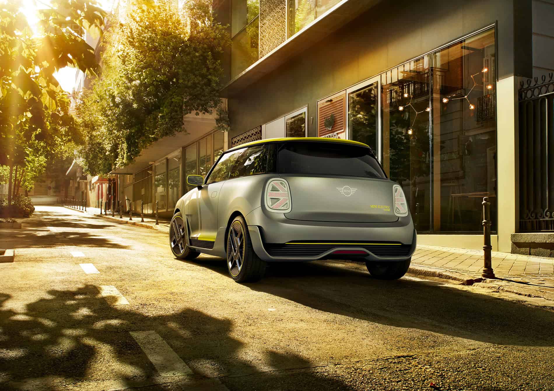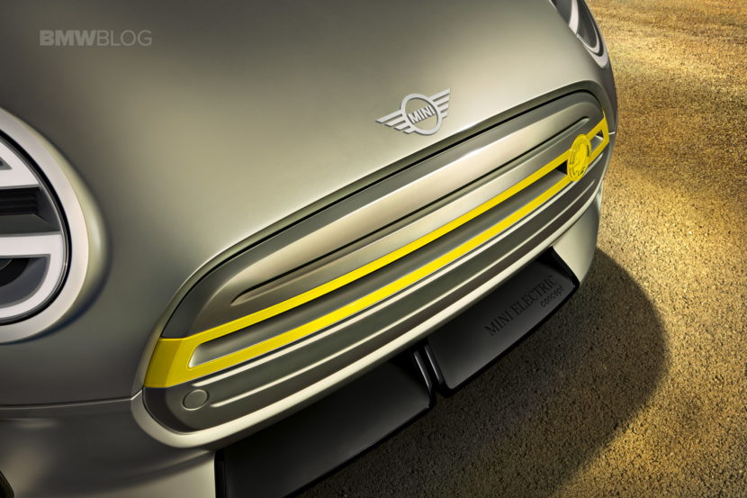 The design of the MINI Electric Concept stands out with a hexagonal radiator grille and circular headlights. Identifying features include the vividly contrasting silver and yellow colour scheme reminiscent of the earlier MINI E, as well as the distinctive E badge. Besides this, the radiator grille and headlights have been reinterpreted to reflect the emission-free drive technology under the bonnet. As the electric drive unit requires very little cooling air, the radiator grille is closed for superior aerodynamics. A Striking Yellow accent bar in the grille – with an E badge in the same colour – produces a powerful contrasting effect, which is echoed by the styling of the daytime running lights in the all-LED headlight assemblies.