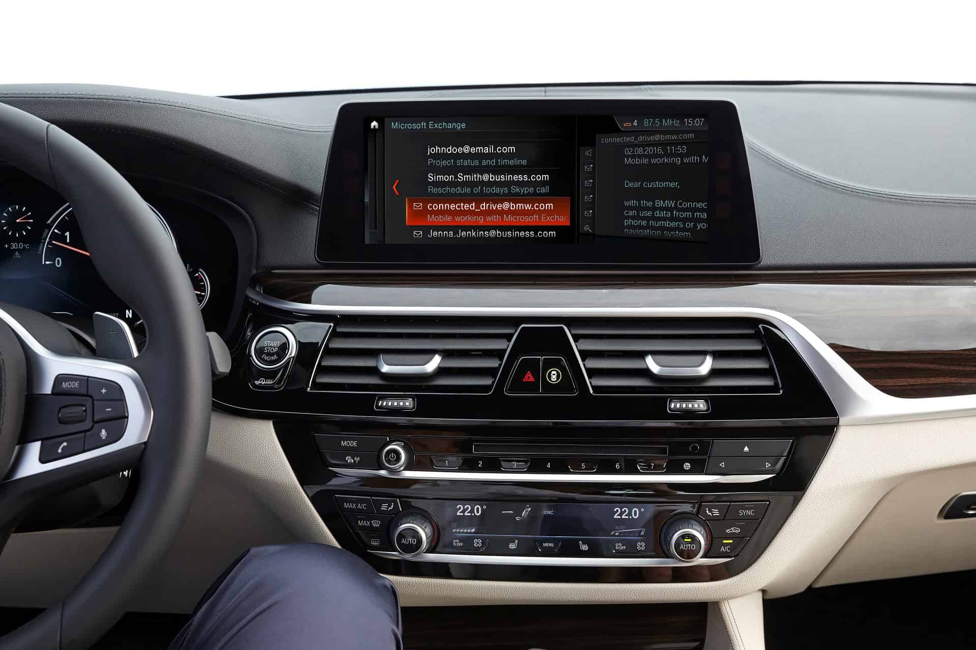 Integrating e-mail accounts into the car via Microsoft Exchange enables the best possible data security when it comes to managing calendar entries, e-mail and contacts. And with BMW Connected the new 5 Series creates a digital bridge between the car and the user’s smartphone. This digital assistant allows smartphone content to be viewed and used on the Control Display. BMW Connected also helps the driver with their personal appointment and mobility planning – both while on the move and at their home or workplace.