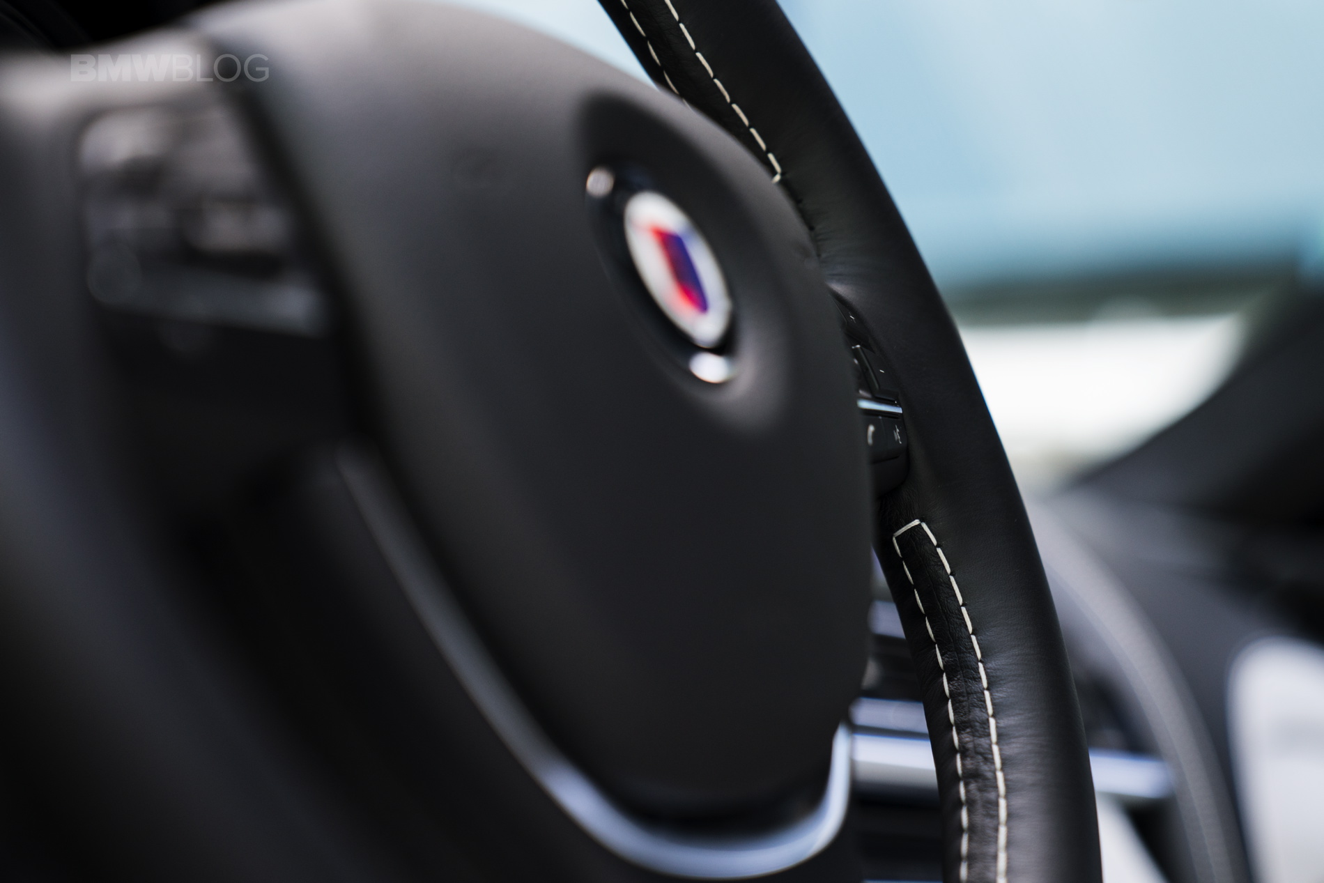 The hand-finished ALPINA LAVALINA steering wheel features white bespoke stitching, which along with the floor and trunk mats with bespoke white piping, match the Merino Opal White Full Merino Leather interior. The headrests are subtly embossed with the ALPINA logo.