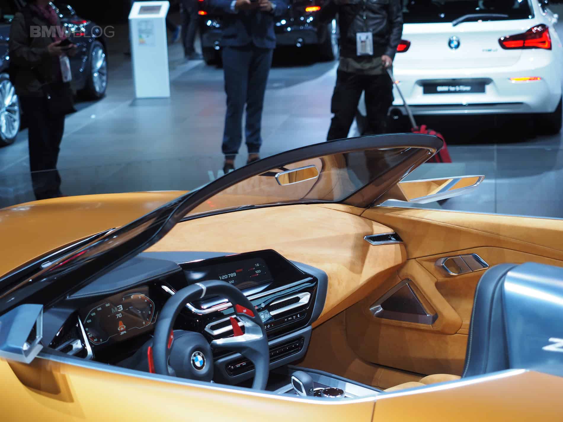 Inside, the classic sports car with a modern twist theme carries on. The three-spoke steering wheel is simple and elegant, yet futuristic and modern. Aside from those massive red paddle shifters add some flamboyance but this is a simple cockpit, overall. While this is a very concept-y cabin, it does have a lot of modern BMW elements that could make it to production.