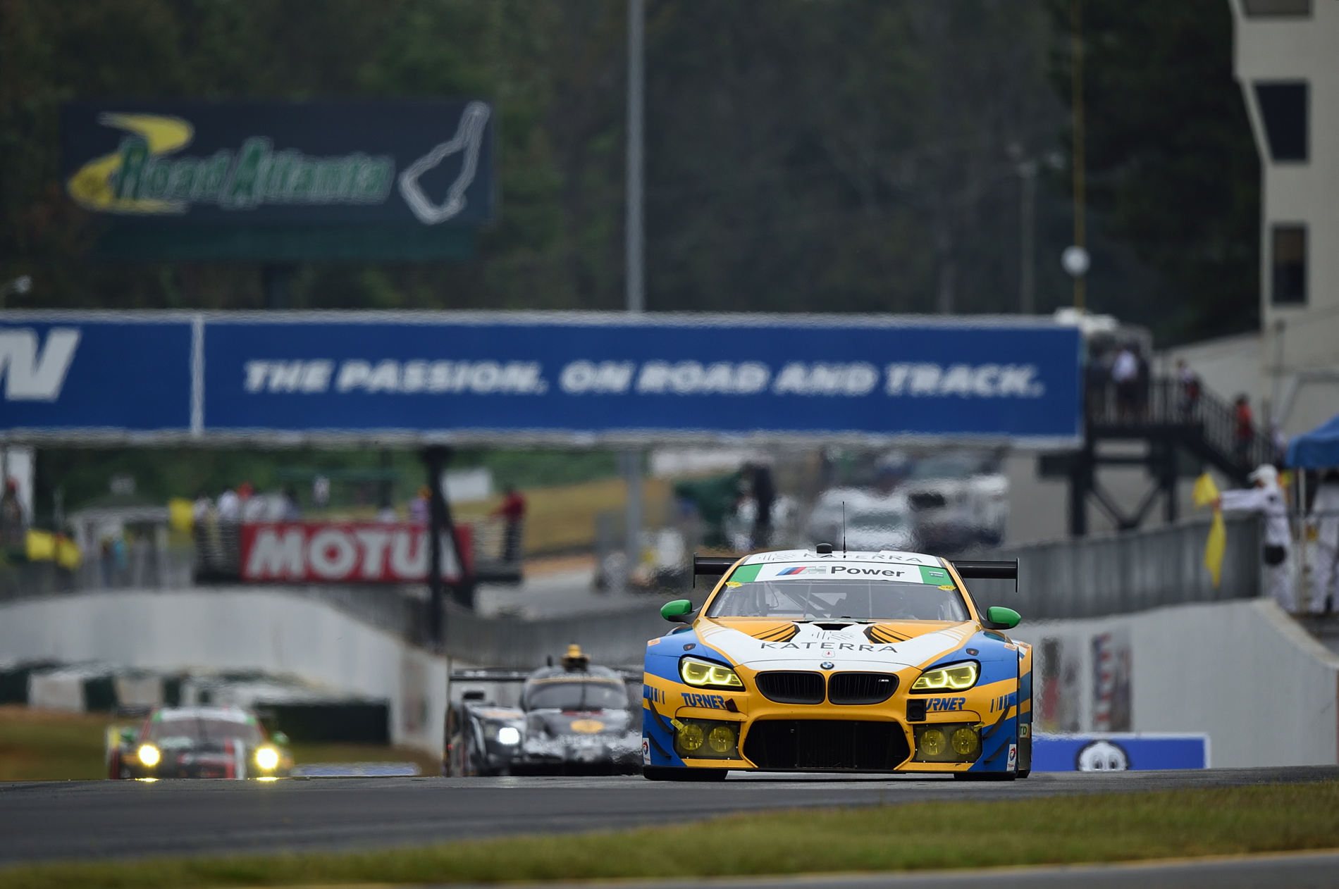 Before Saturday’s race start a rain shower hit the track. Consequently, the field was on wet tyres when the lights went green for the 10-hour race. The track dried out quickly however, so teams were soon able to switch to slick tyres. Road Atlanta then provided the backdrop for some spectacular GT action, with the BMW Team RLL drivers taking centre stage, thrilling the fans with some great overtaking moves and fast lap times.