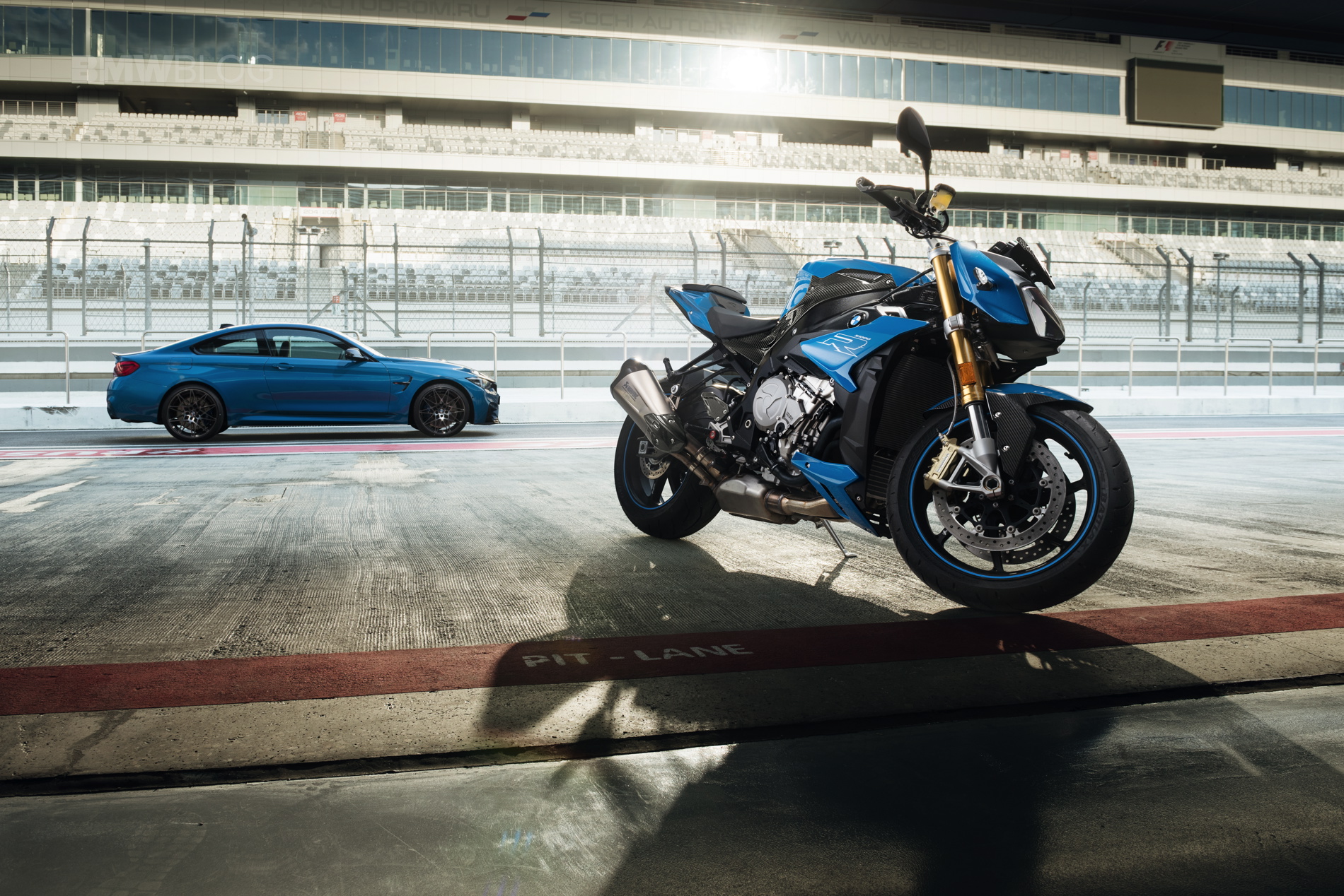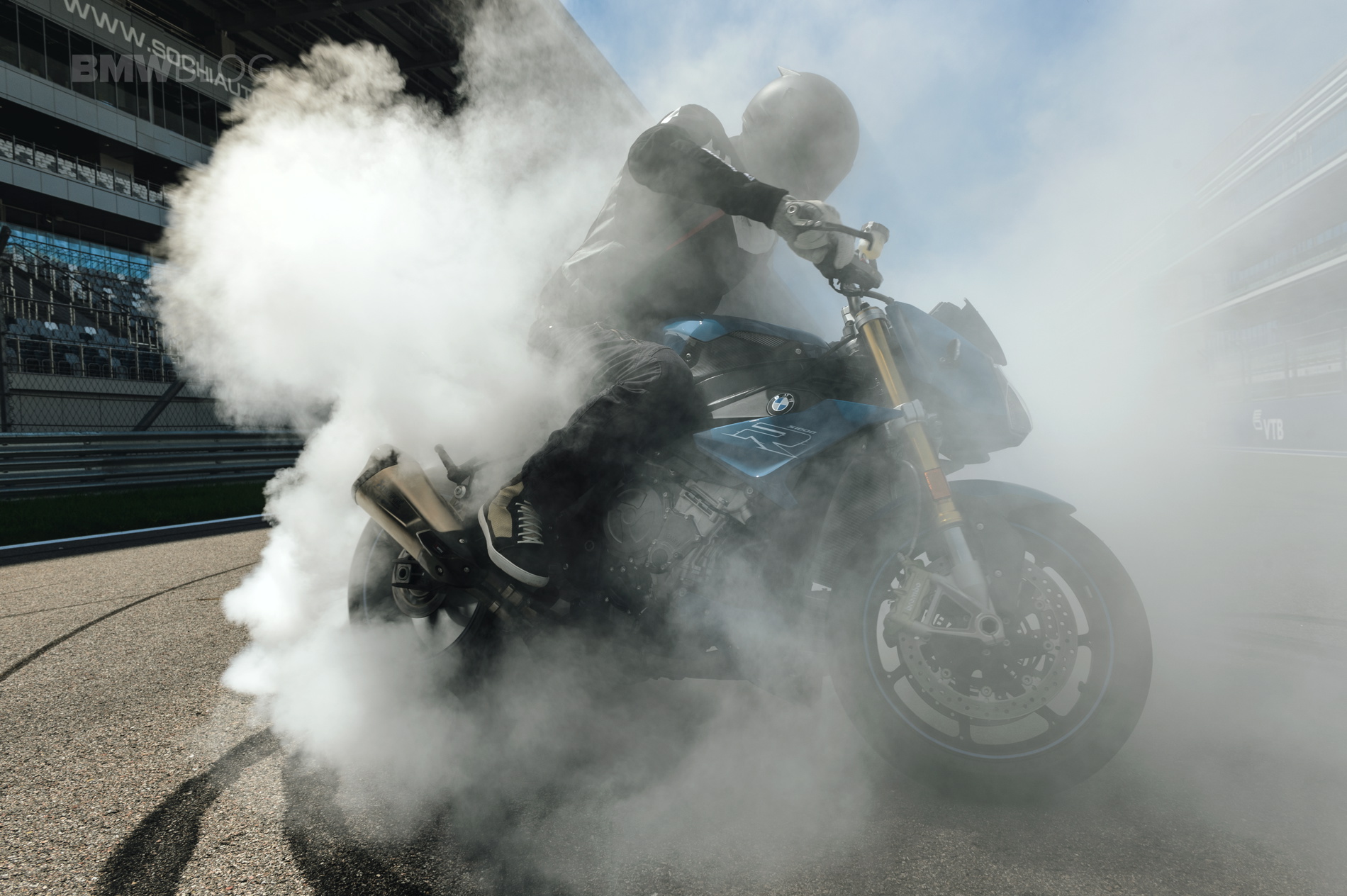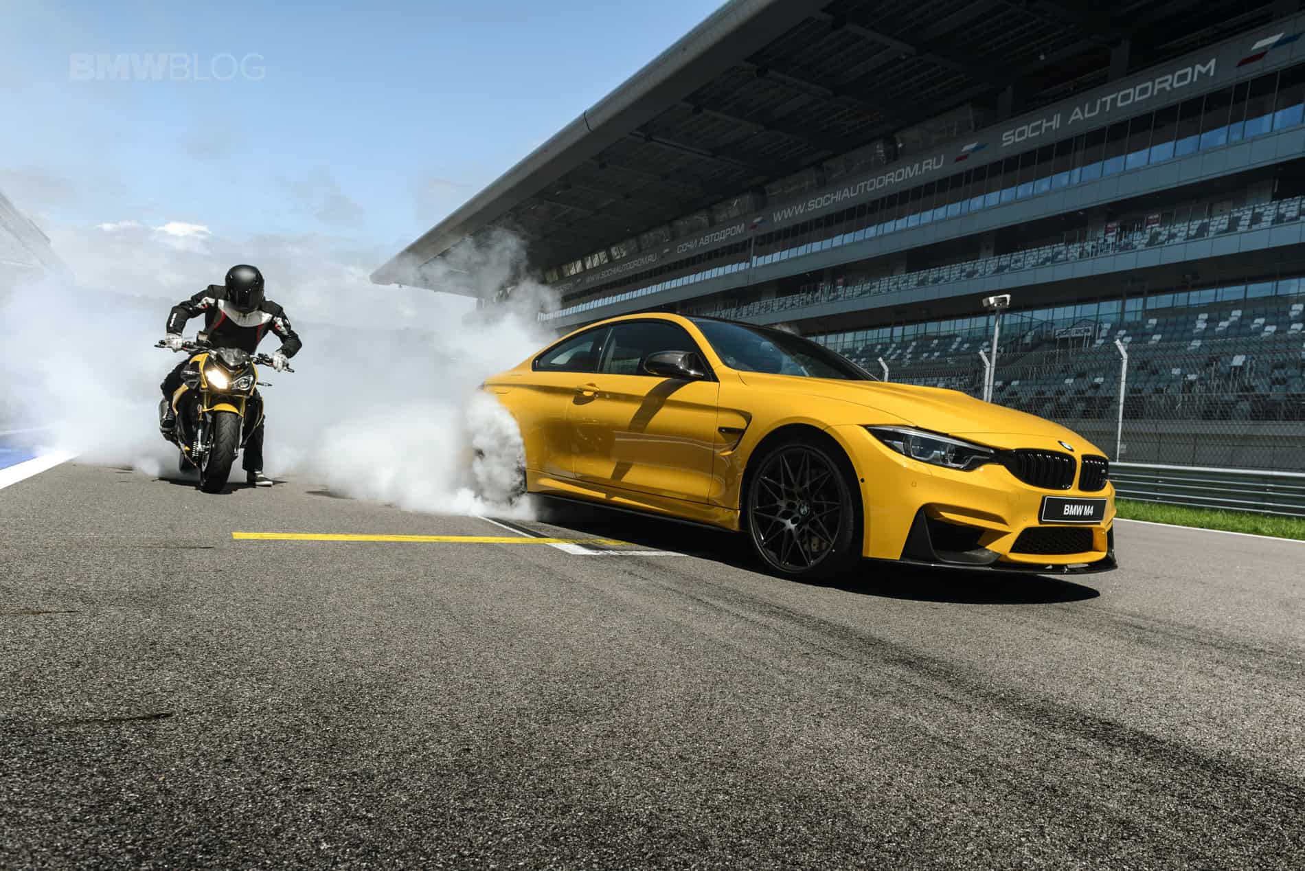 For the official photo shooting for the special edition, BMW Russia went to the Sochi Autodrome, which since 2014 has also been the venue for the Formula 1 race for the Grand Prix of Russia. The 450 hp BMW M4 Coupes and the 165 bhp strong BMW S 1000 R were able to destroy a lot of rubber producing spectacular pictures.