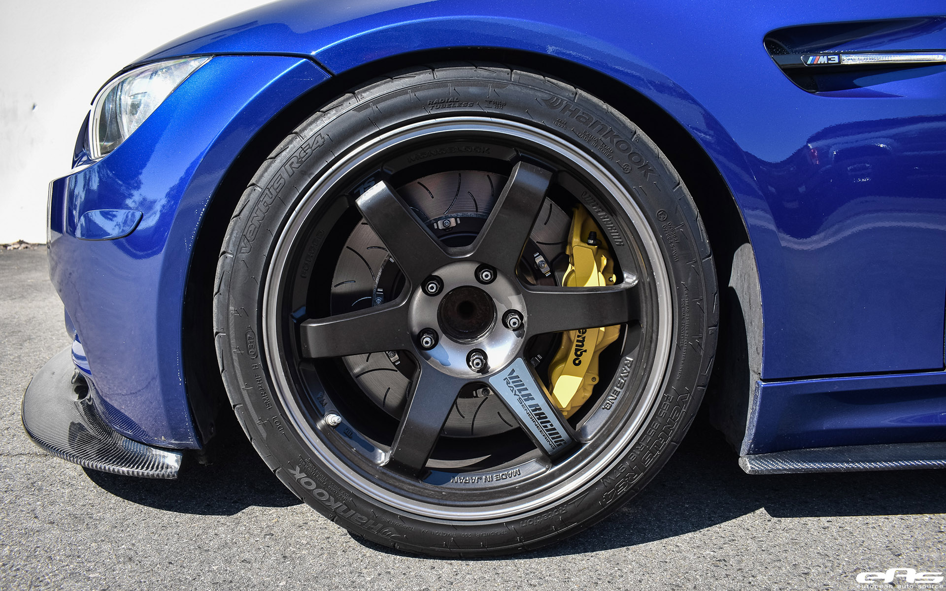 One of the first items to get installed on this vehicle were the wheels. This beautiful LeMans Blue BMW M3 sports a set of beautiful Volk TE37 SL Black Edition wheels.