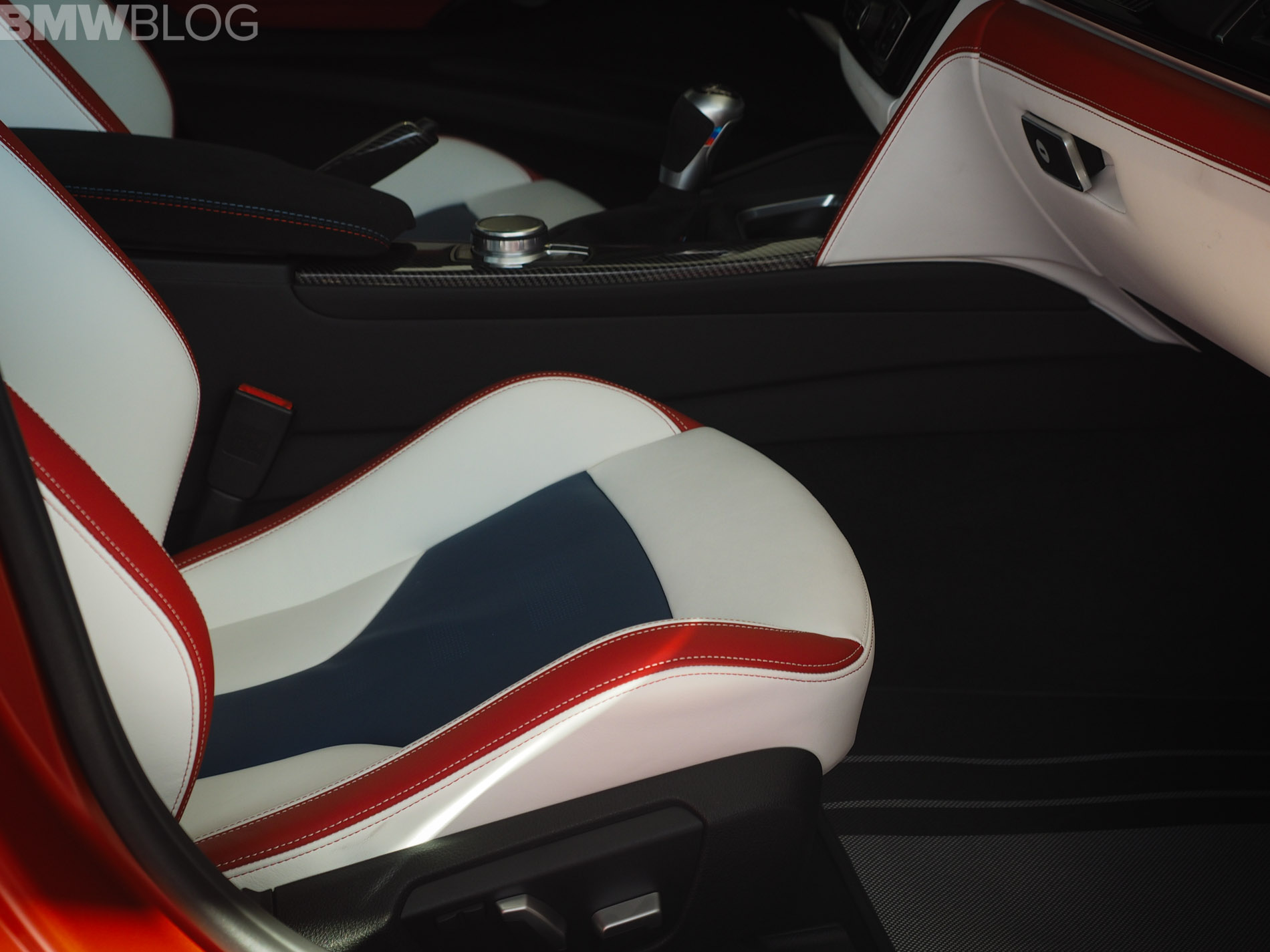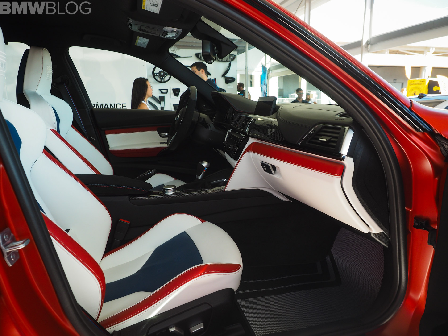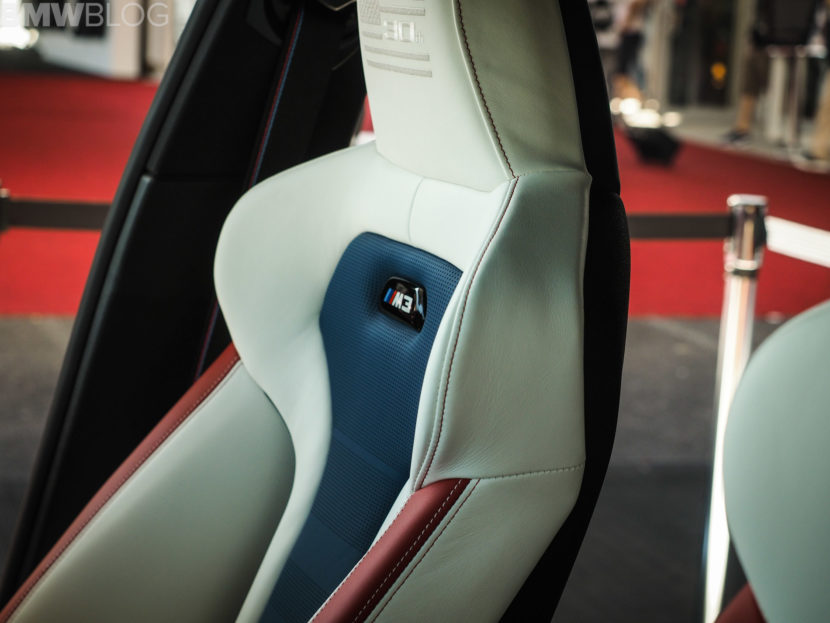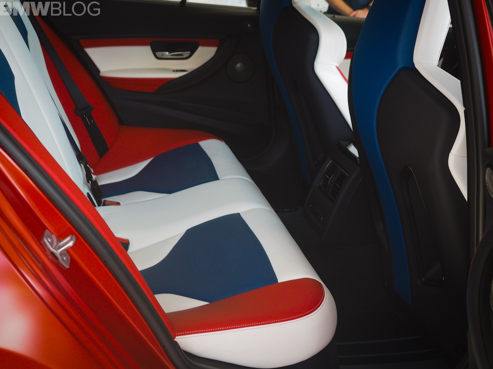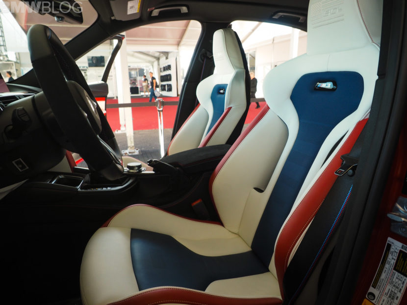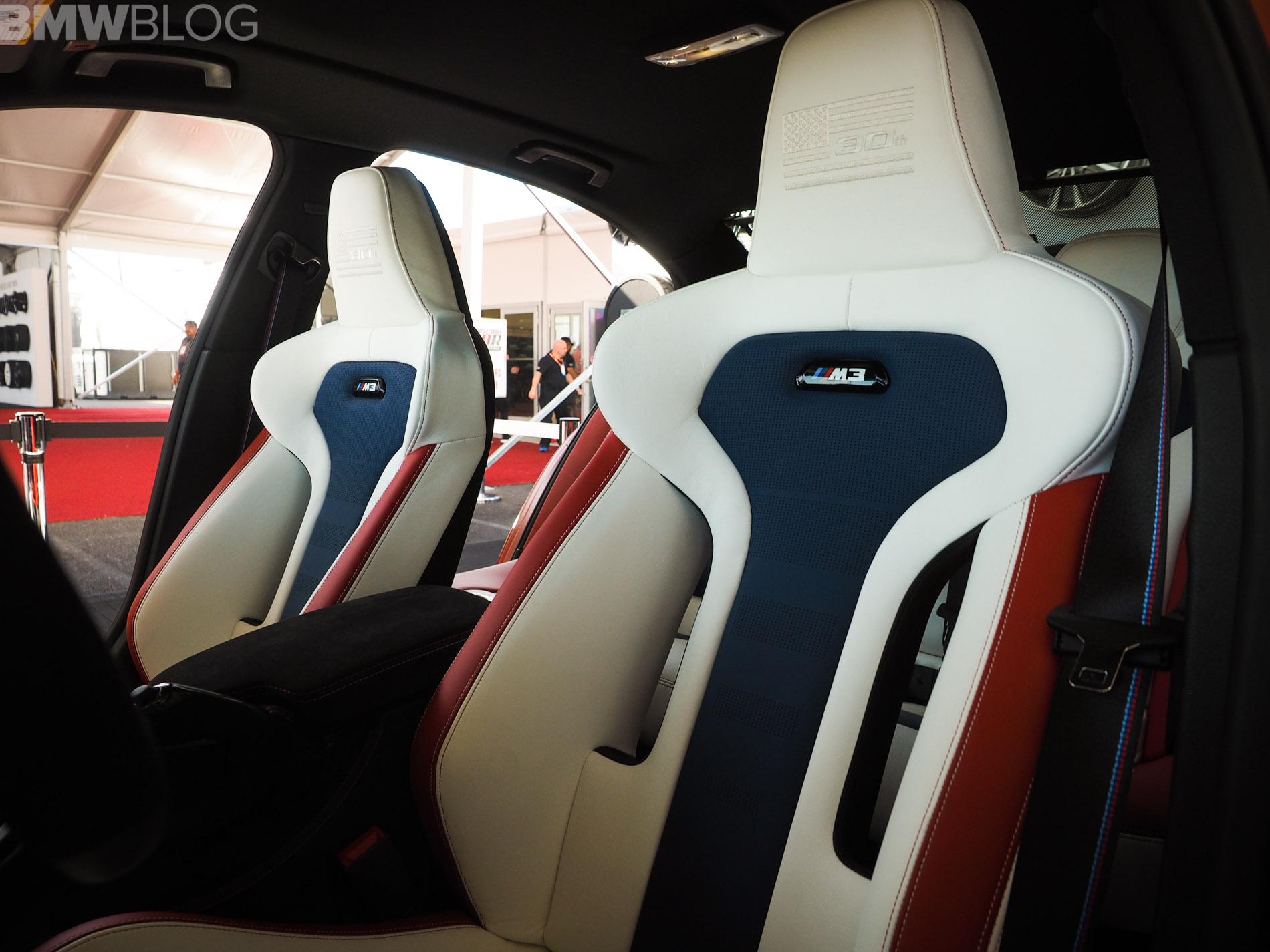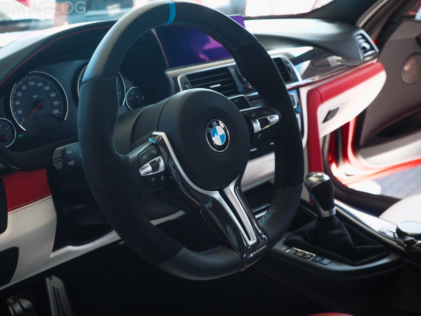 When it comes to the interior design and choices, the BMW M3 American Edition is by far the most interesting production BMW M interiors we’ve ever seen. It’s been given a tri-tone interior, done by DesignWorks, in red, white and blue, as in the American flag. There are also some logos on the trim, which depict an American flag with the number “30” in it. The M logo and colors are also well represented within the cabin.