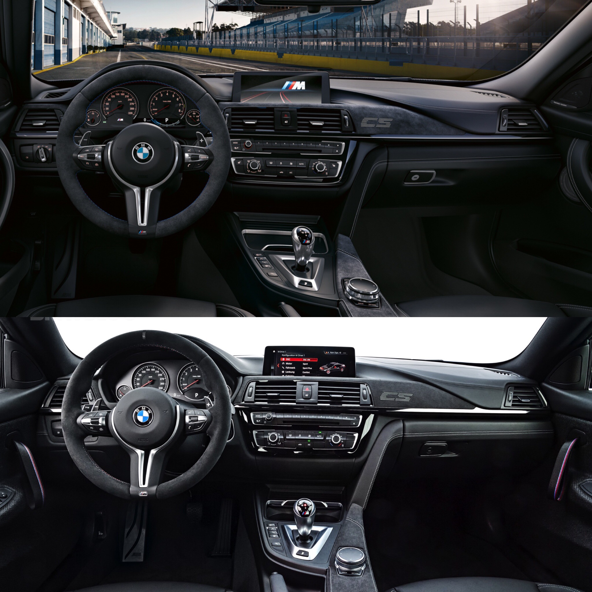 Inside is where the two cars are most different. Whereas the M4 CS is more stripped down, using a ton of CFRP (Carbon Fiber Reinforced Plastic), the BMW M3 CS’ cabin is a bit more normal. The M4 CS has CFRP door panels with fabric straps for door pulls, whereas the M3 CS’ door panels are trimmed in contrast-stitched leather. The former look cool, purposeful and special but the latter are likely a lot better to live with. The M3 CS also gets BMW M-colored stitching on the steering wheel, while the M4 CS just has grey stitching. The M3 CS also gets two-tone Silverstone/Black leather interior, whereas the M4 CS’ seats are just black.