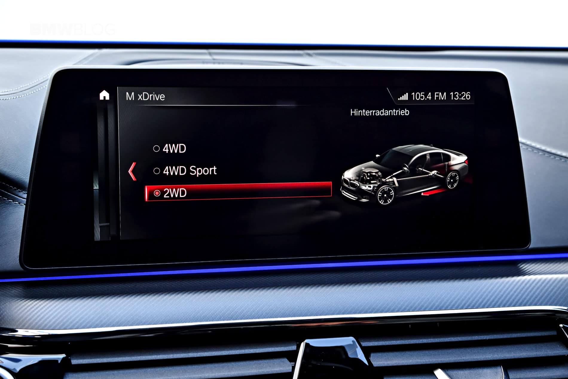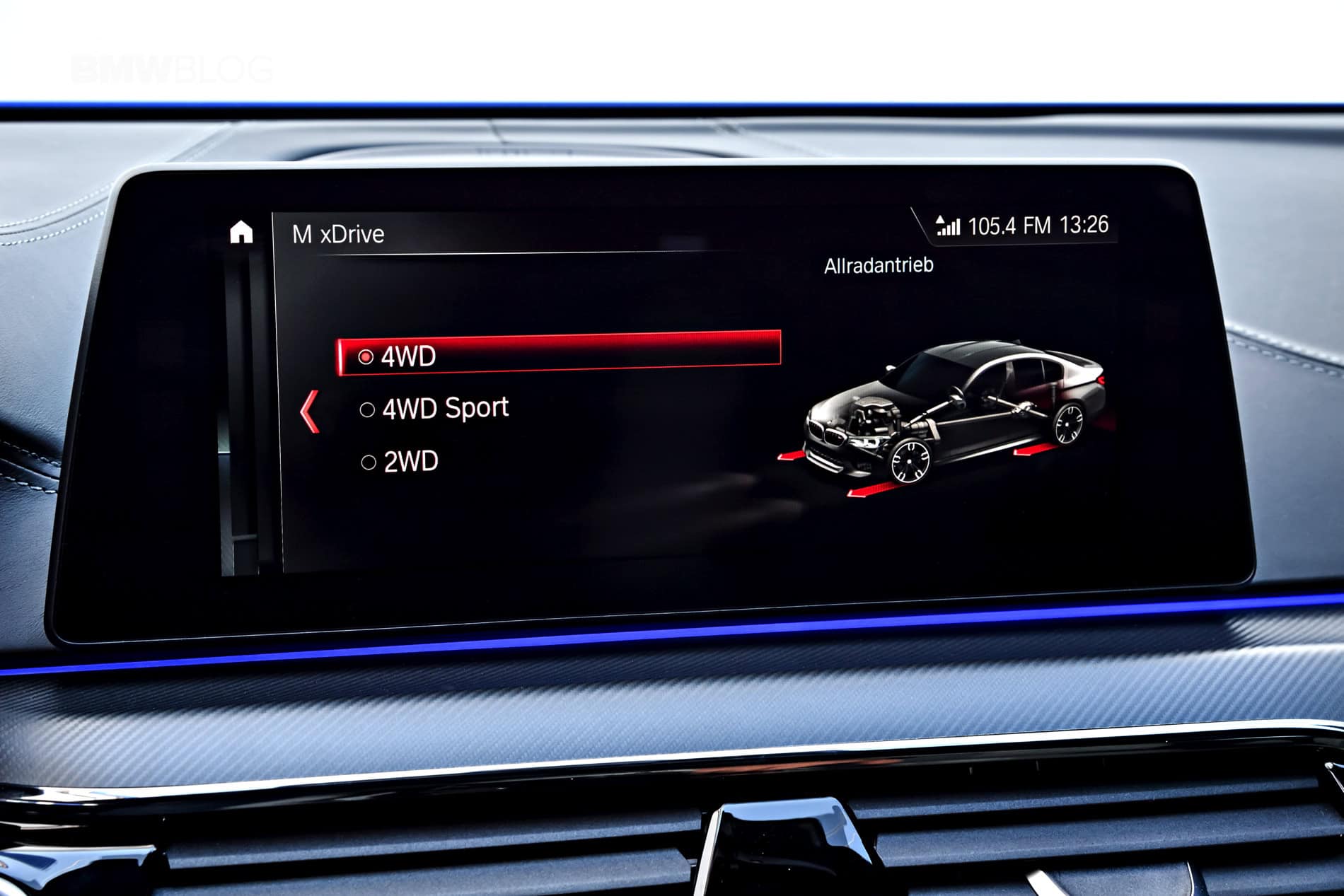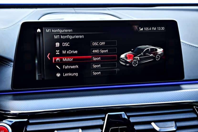 When first started, the BMW M5 will be in its normal “4WD” mode with DSC (Dynamic Stability Control) on. From there, the driver can tune the drivetrain to his/her liking. There is also a “4WD Sport” mode, which sends more power to the rear wheels all of the time. It also allows for more slip and bigger slip-angles, for both more fun and better track handling. To increase the fun even further, the DSC gets switched to MDM (M Dynamic Mode) when put into 4WD Sport.